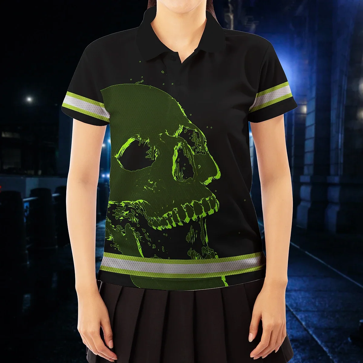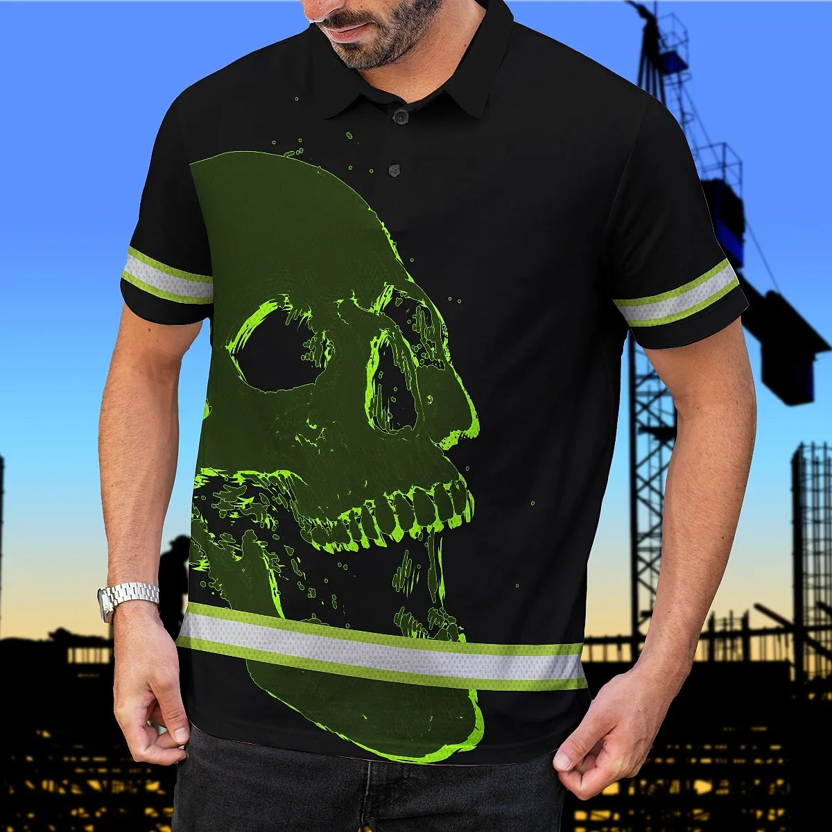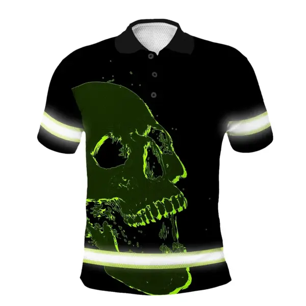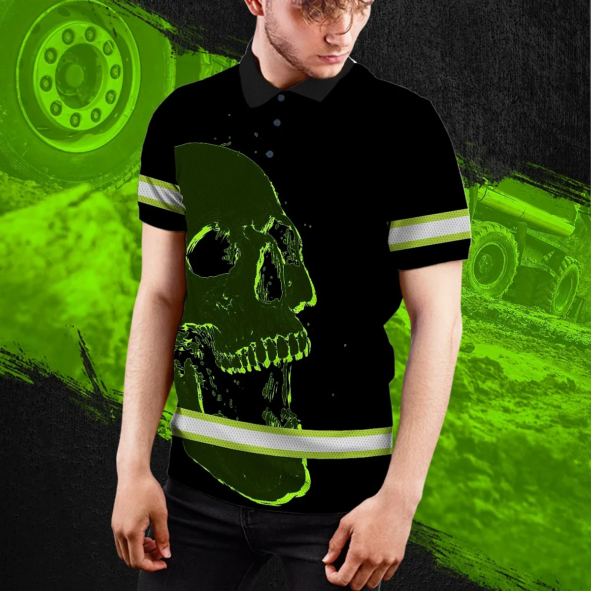 Hi Vis Polo Shirt Reflective Tapes Green Neon Skull Custom Name Safety Workwear For Workers, Runners, Skull Lover