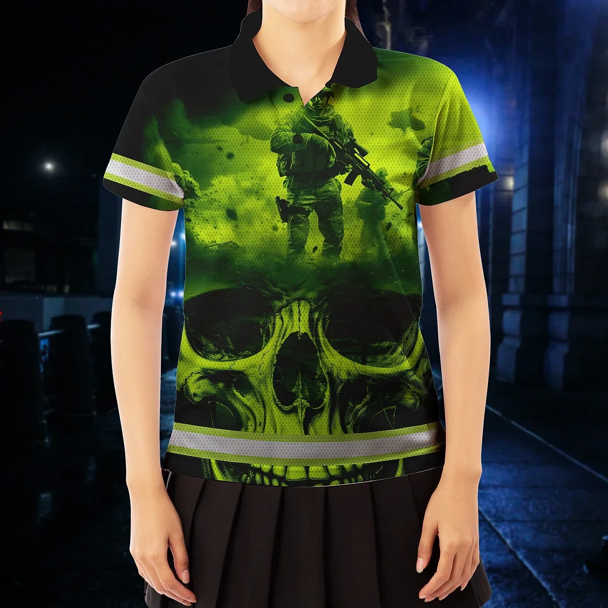 Hi Vis Polo Shirt Reflective Tapes Green Neon Skull Veteran Custom Name Safety Workwear For Workers, Runners, Skull Lover