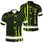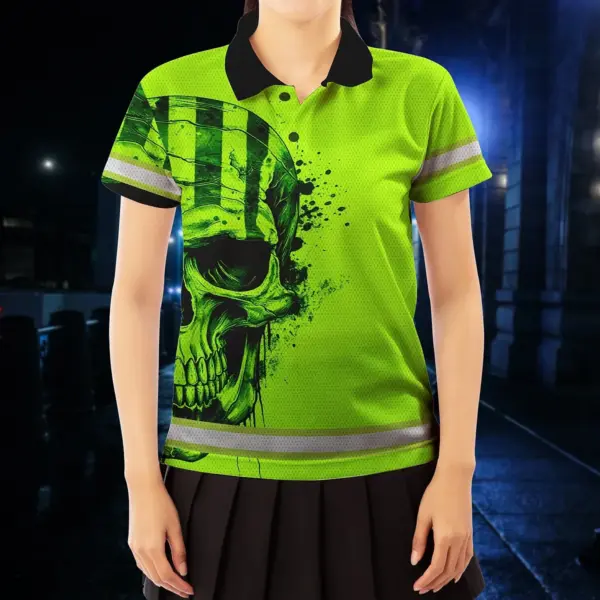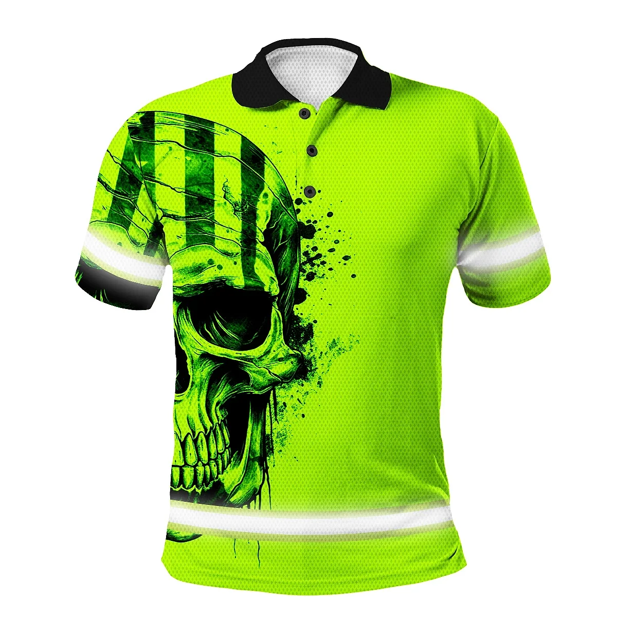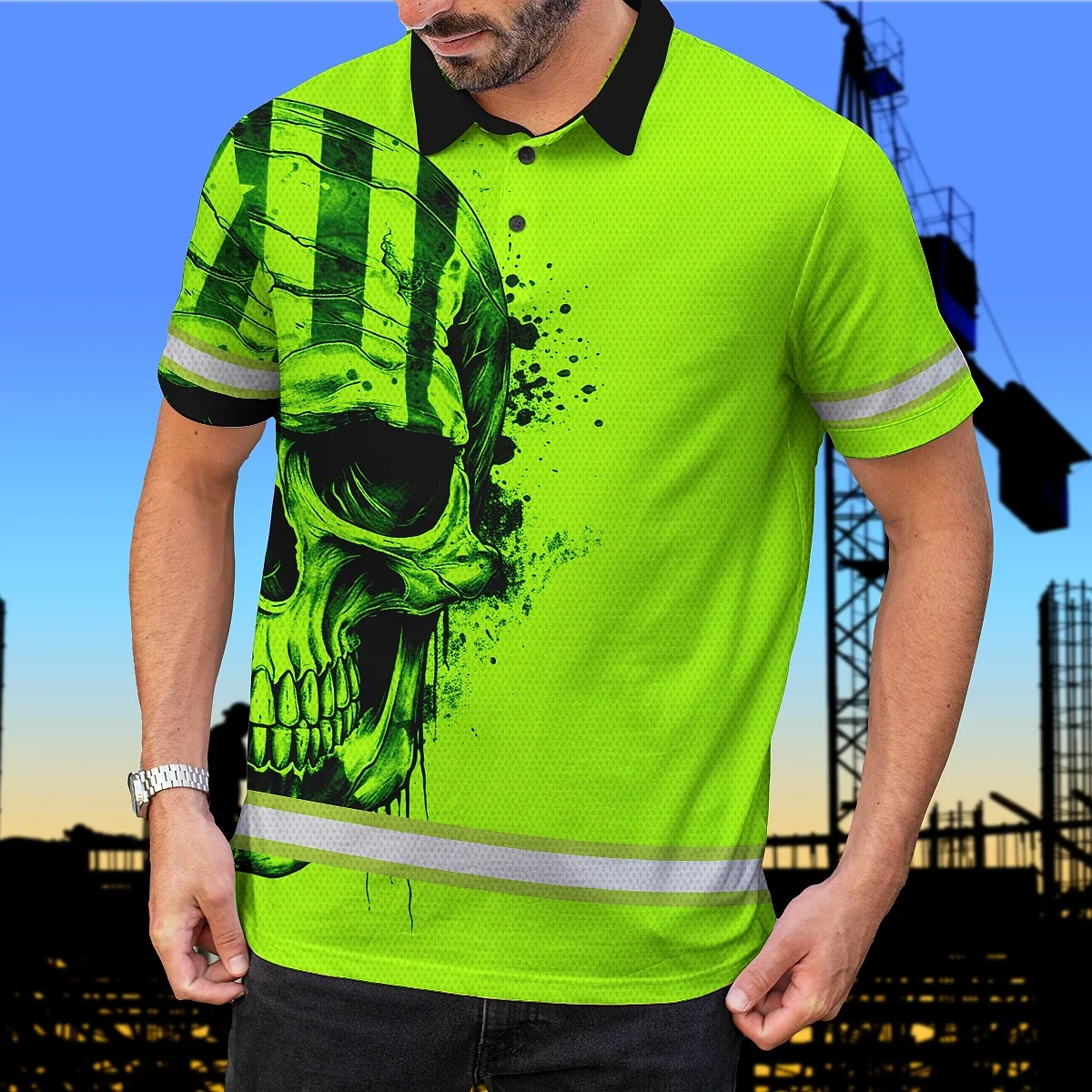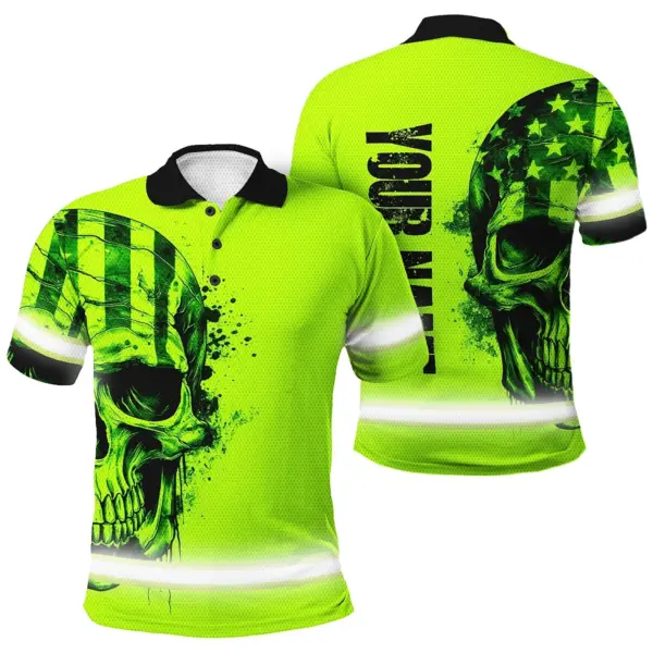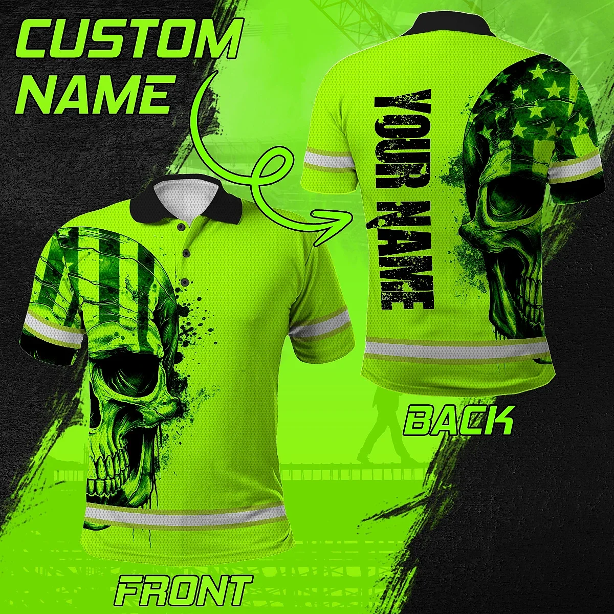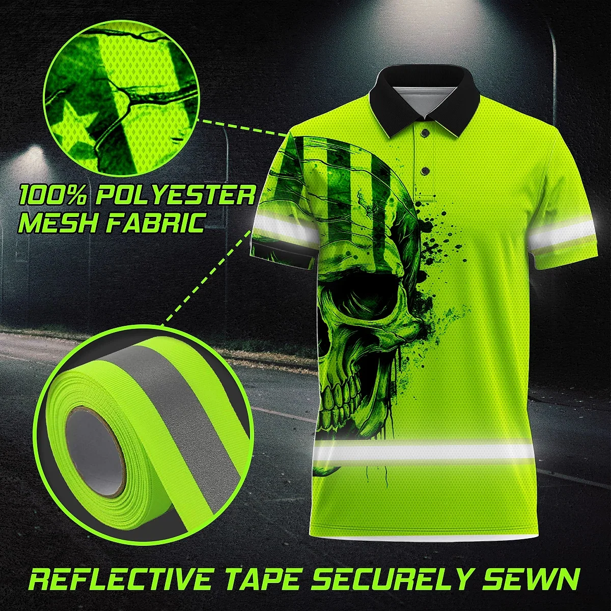 Hi Vis Polo Shirt Reflective Tapes Green Neon US Flag Skull Custom Name Custom Name Safety Workwear For Workers, Runners, Skull Lover