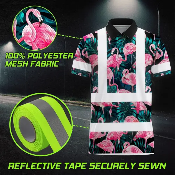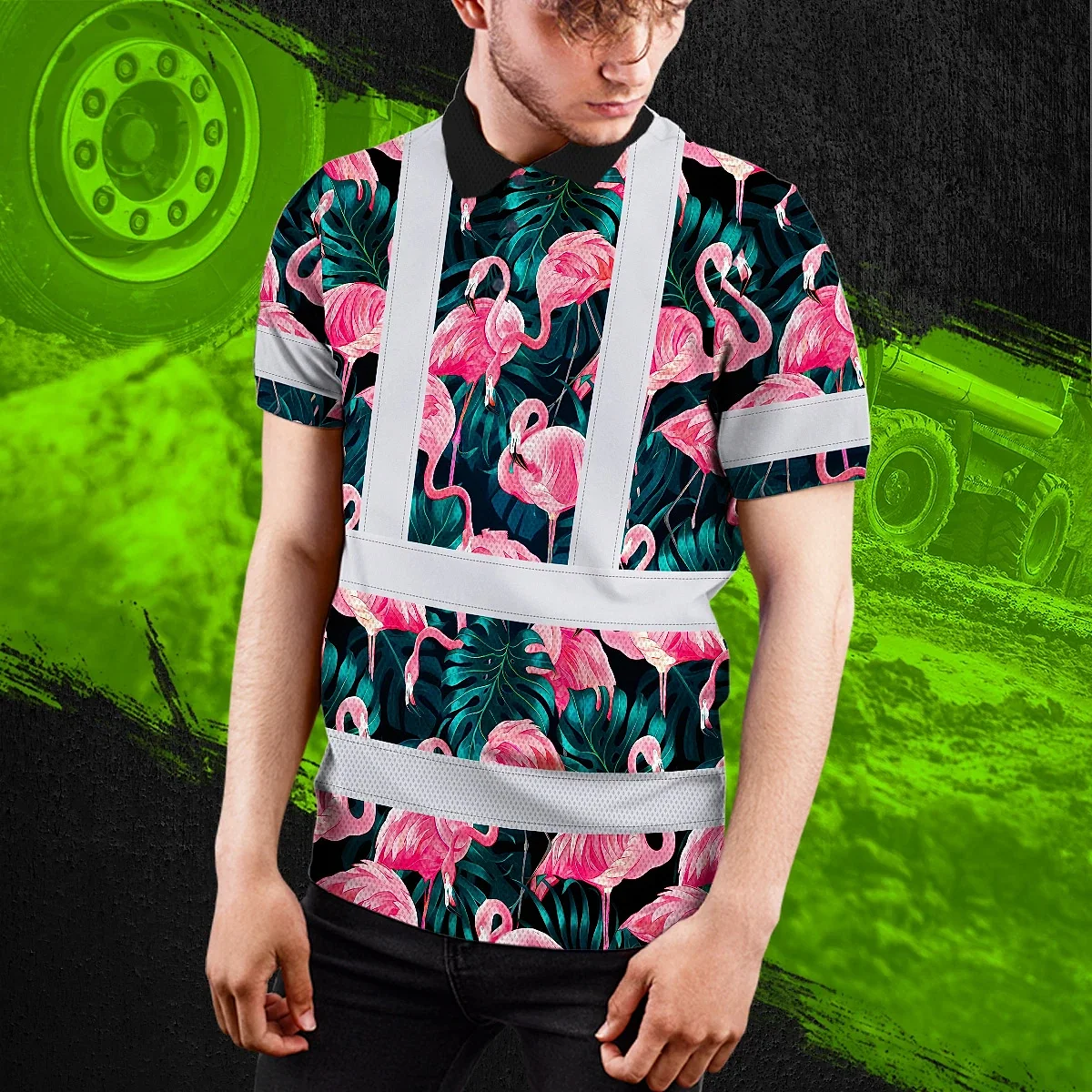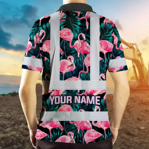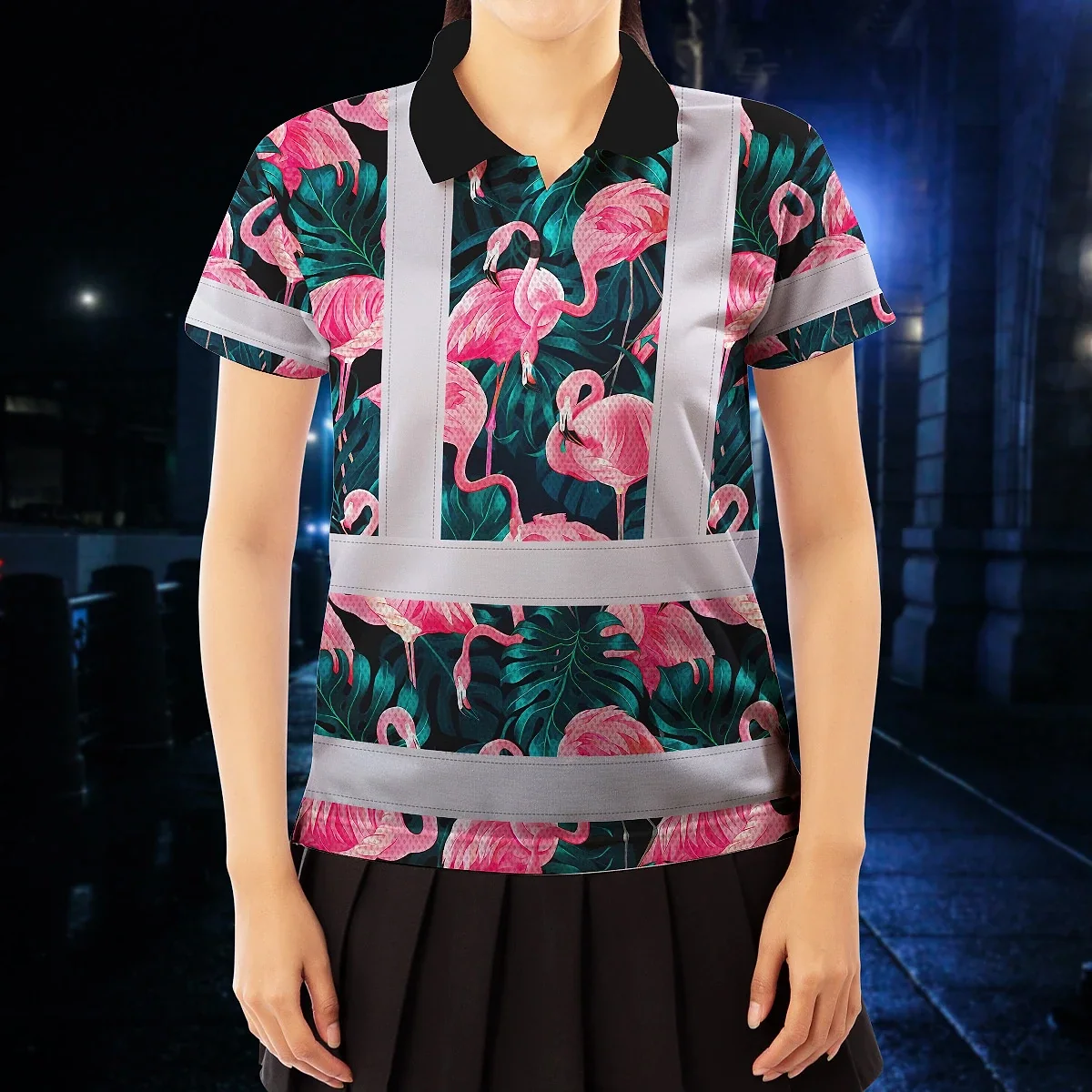 Hi Vis Polo Shirt Reflective Tapes Hawaii Flamingo Custom Name Safety Workwear For Workers, Truckers, Operators