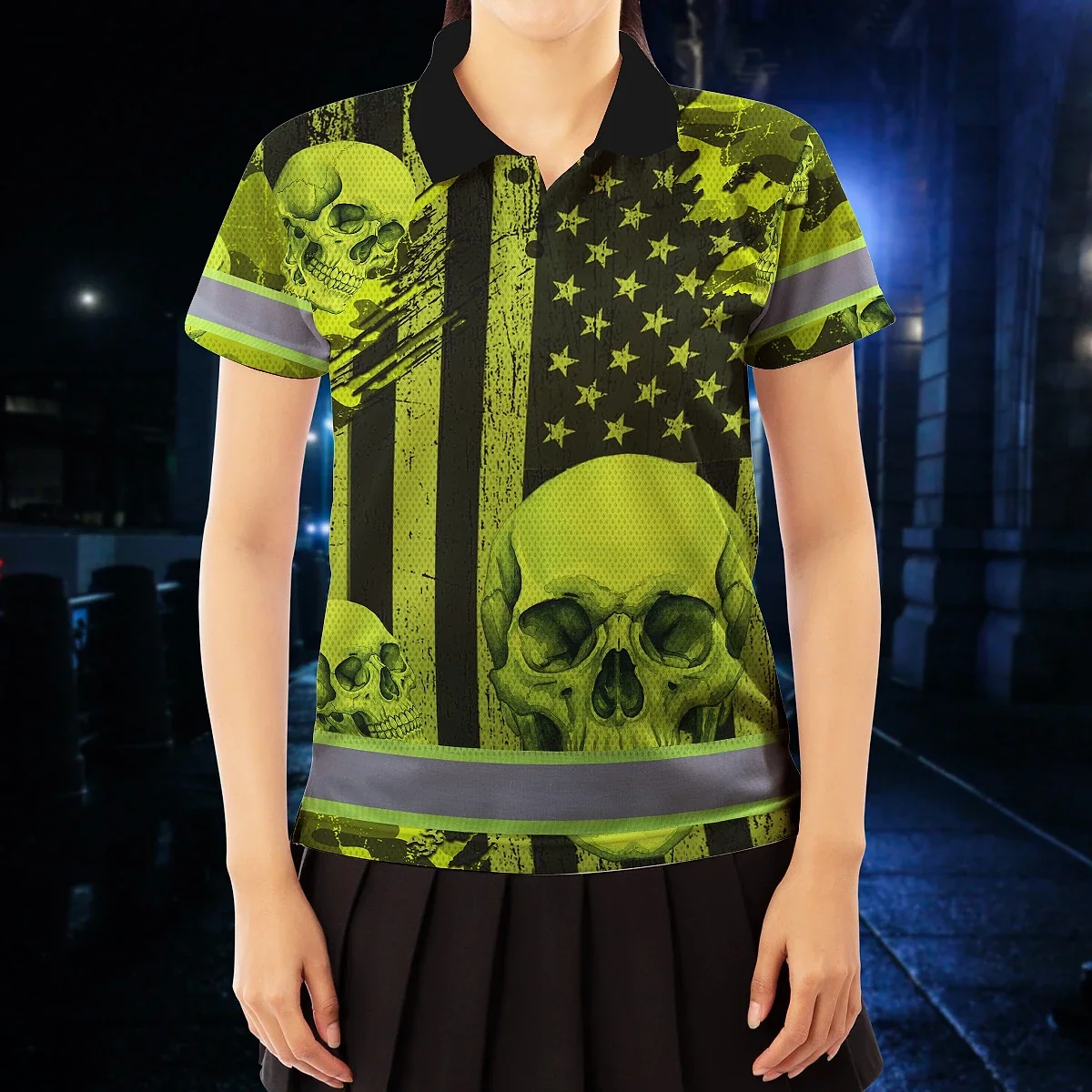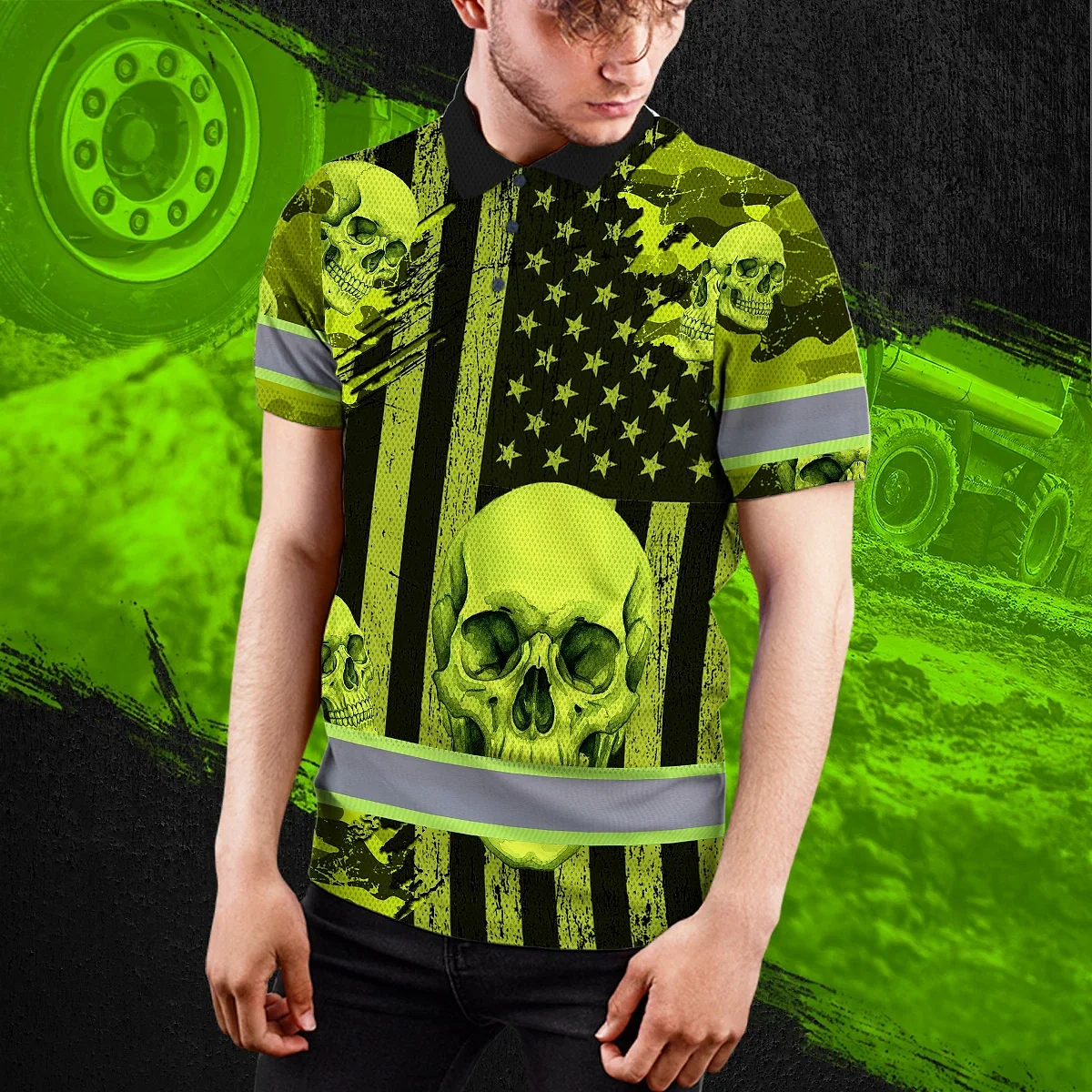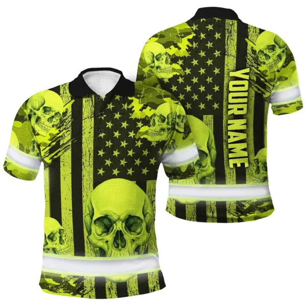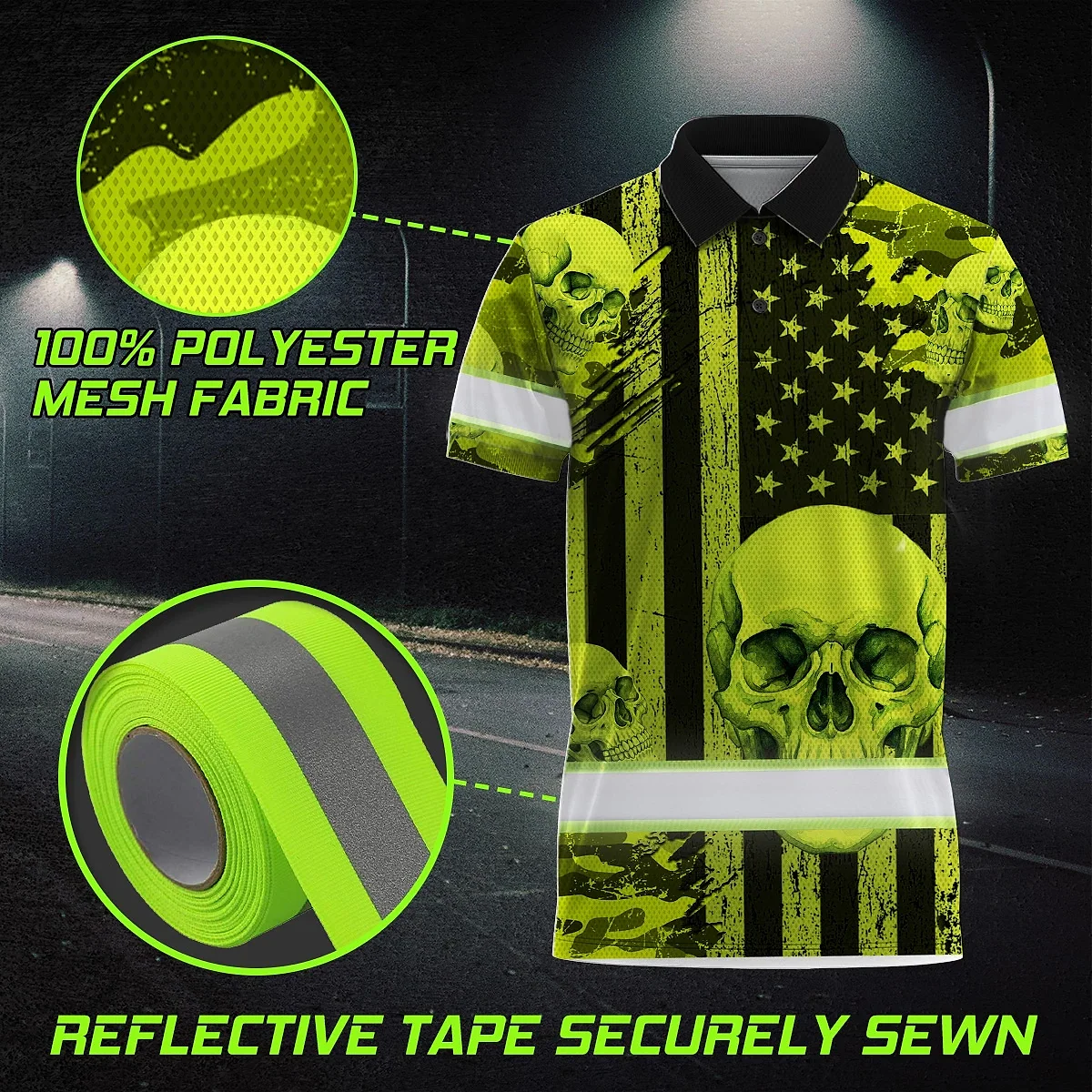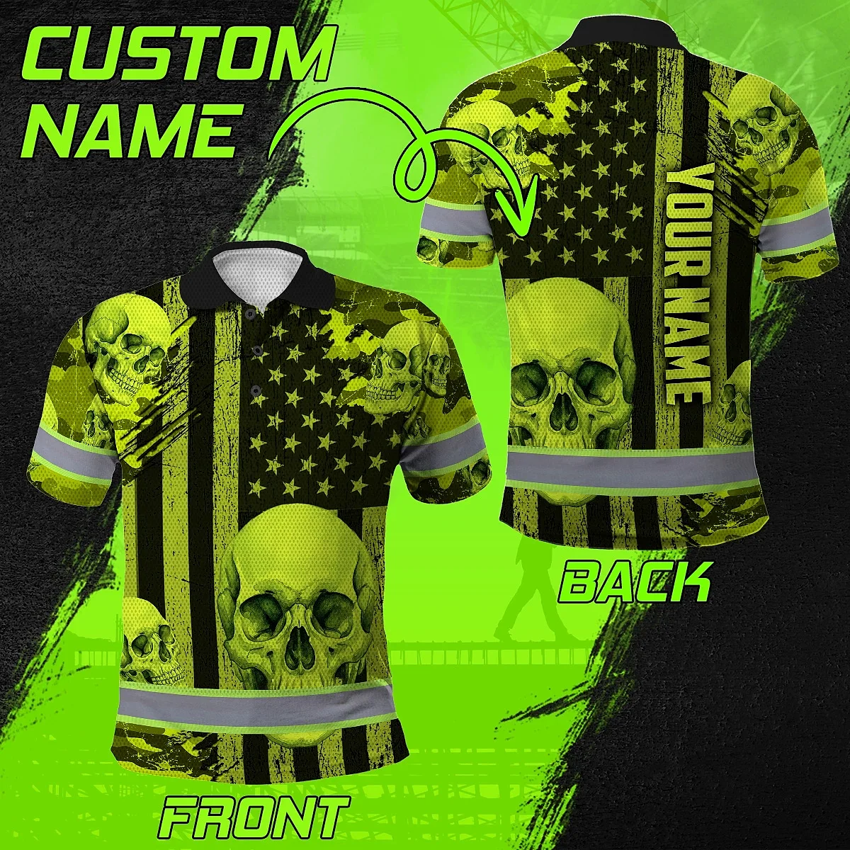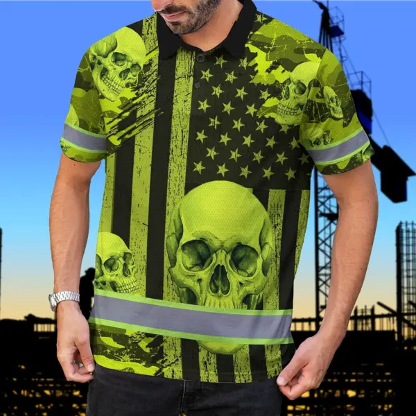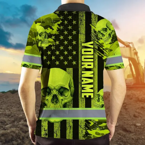 Hi Vis Polo Shirt Reflective Tapes Lime Neon US Flag Skull Custom Name Safety Workwear For Workers, Truckers, Operators