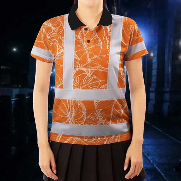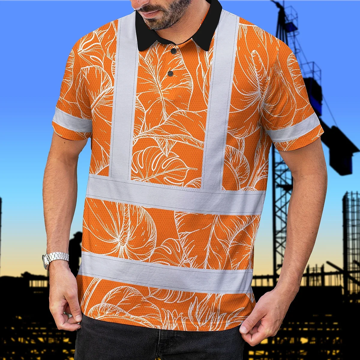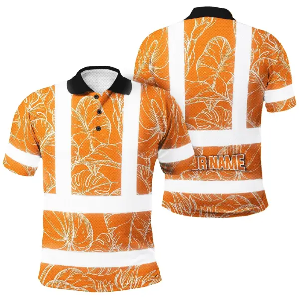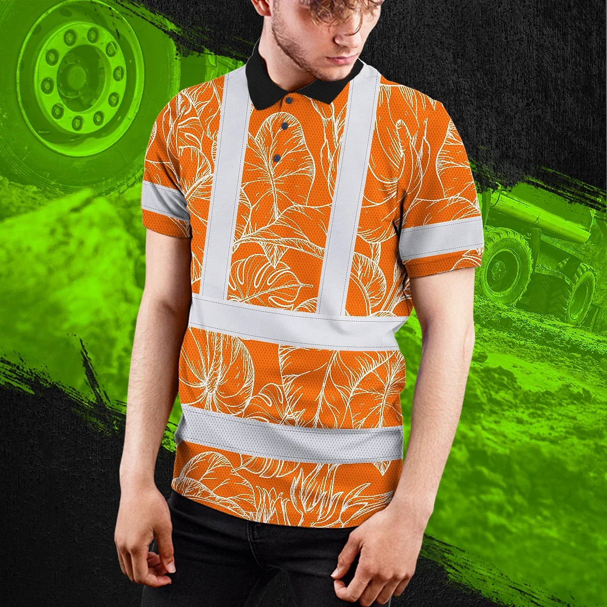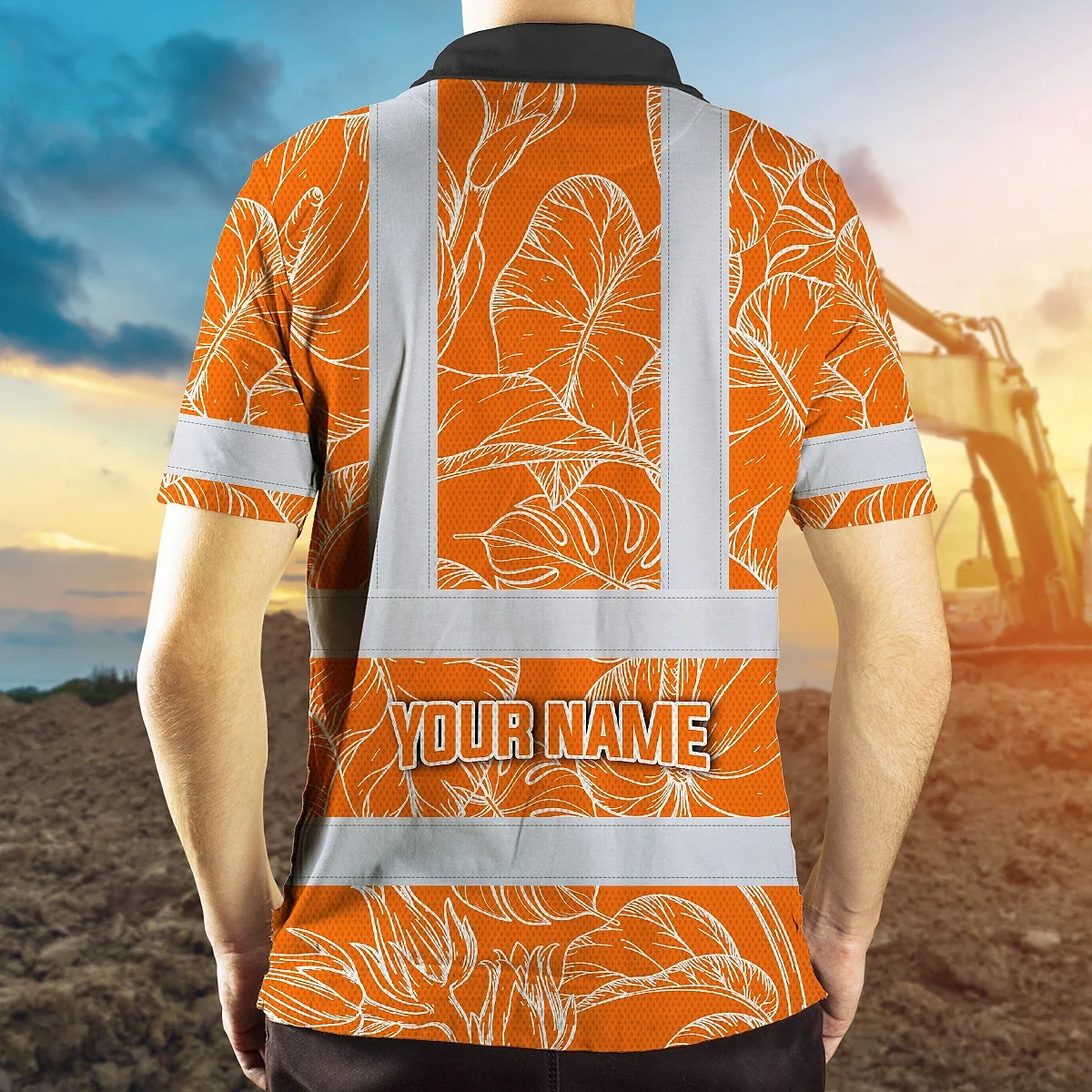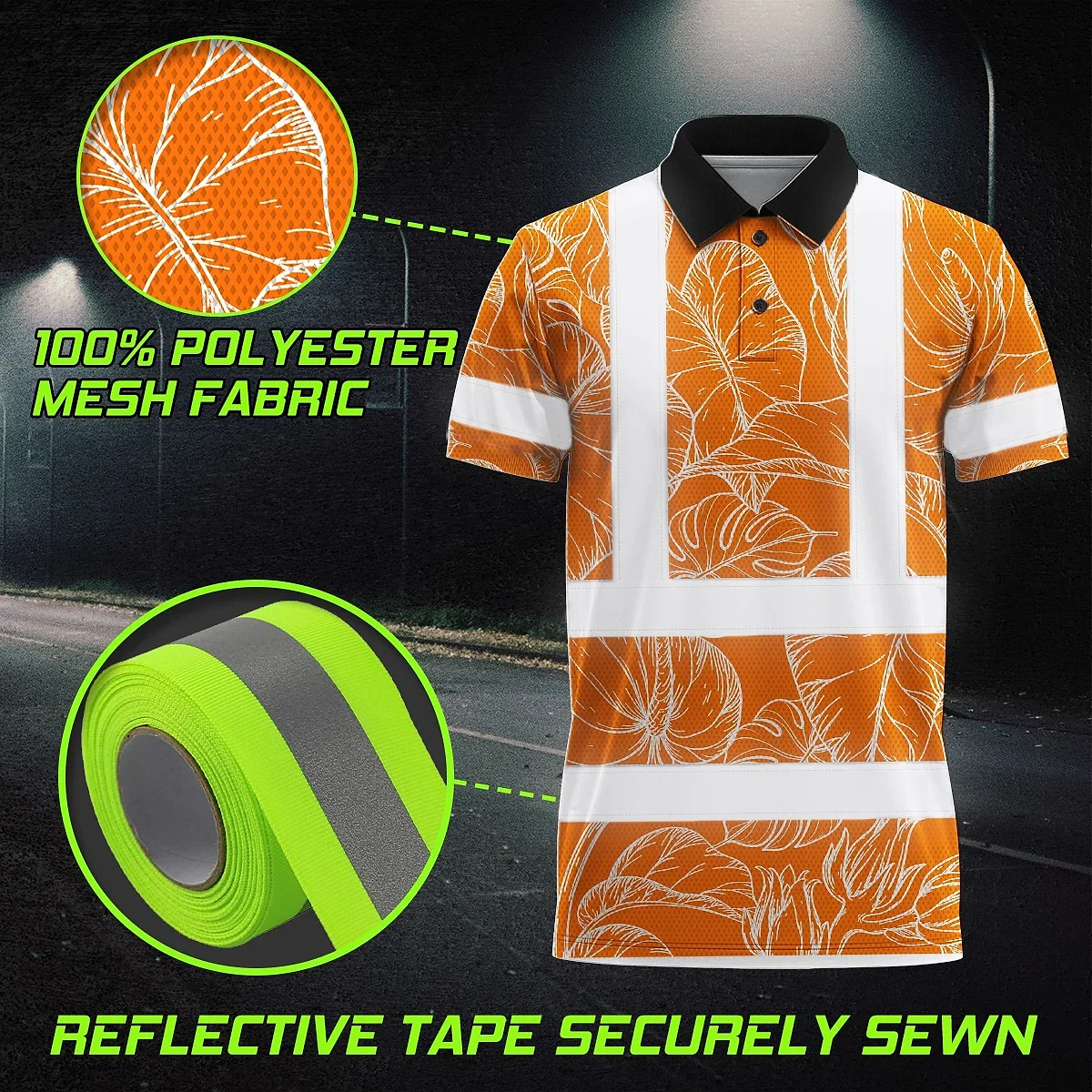 Hi Vis Polo Shirt Reflective Tapes Orange Neon Flowers Custom Name Safety Workwear For Workers, Truckers, Operators