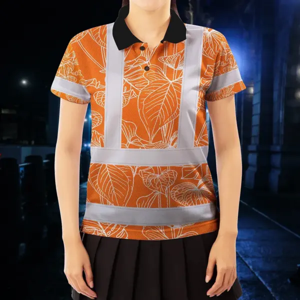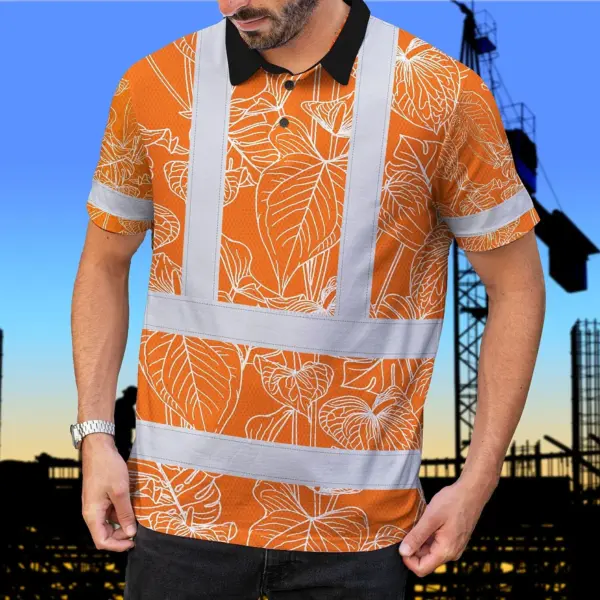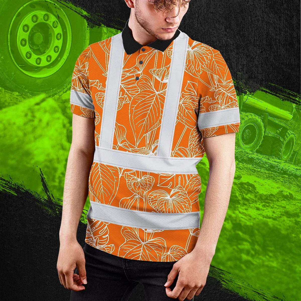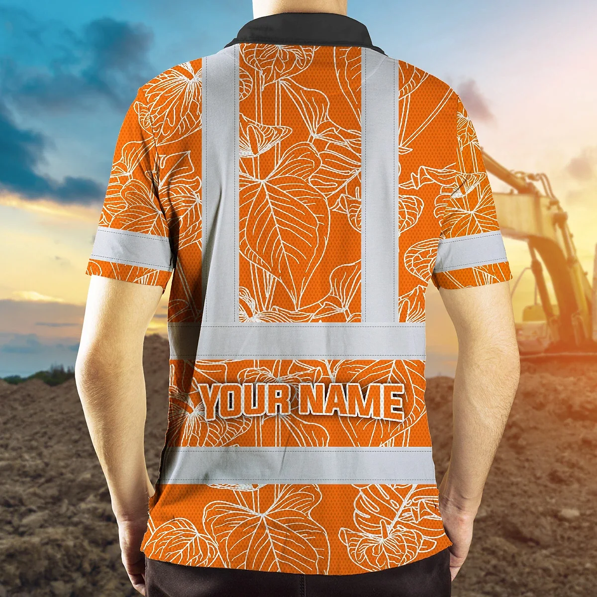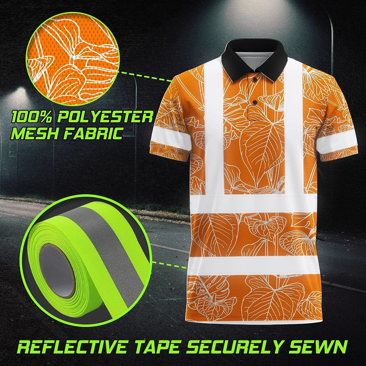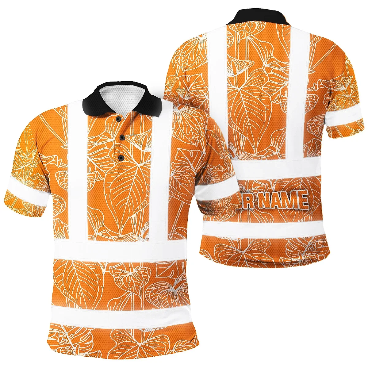 Hi Vis Polo Shirt Reflective Tapes Orange Neon Flowers Custom Name Safety Workwear For Workers, Truckers, Operators