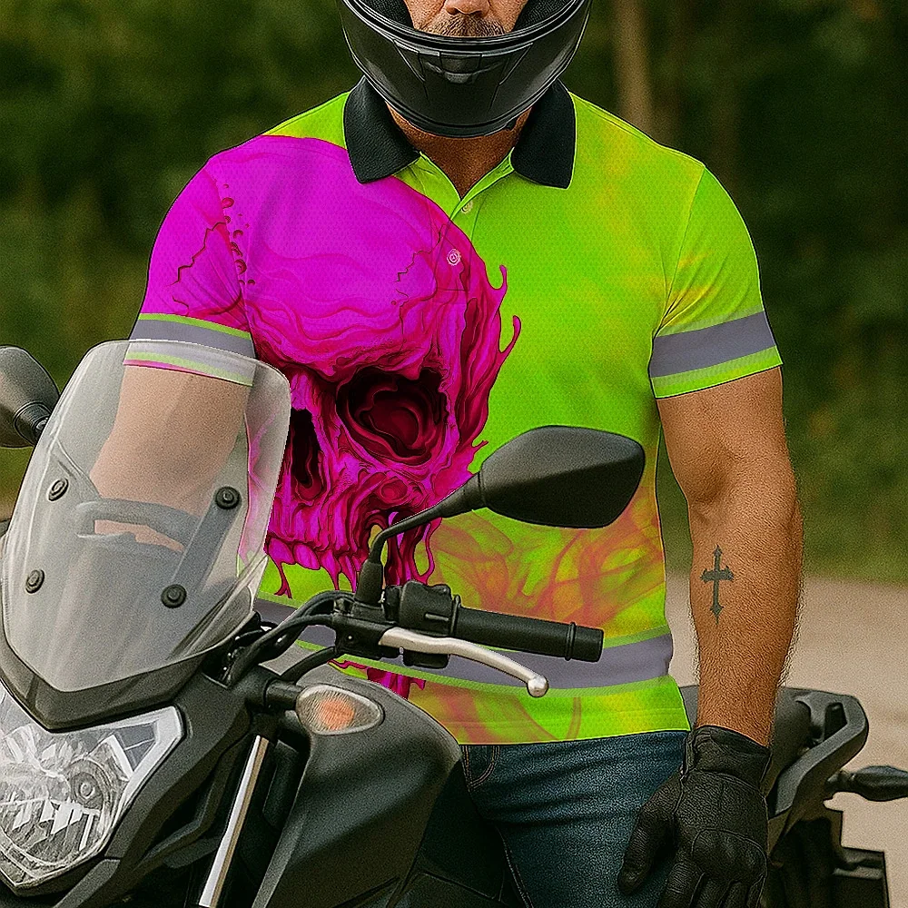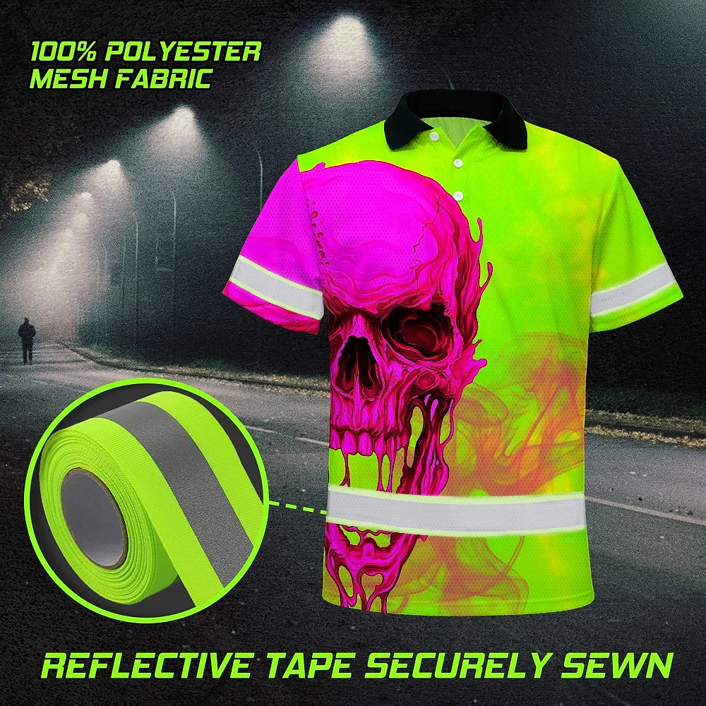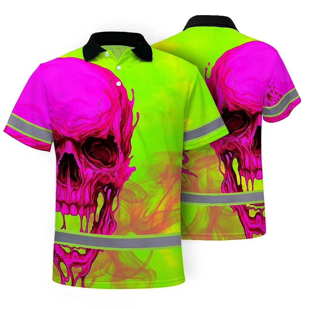 Hi Vis Polo Shirt Reflective Tapes Pink And Lime Neon Skull Custom Name Safety Workwear For Workers, Truckers, Operators