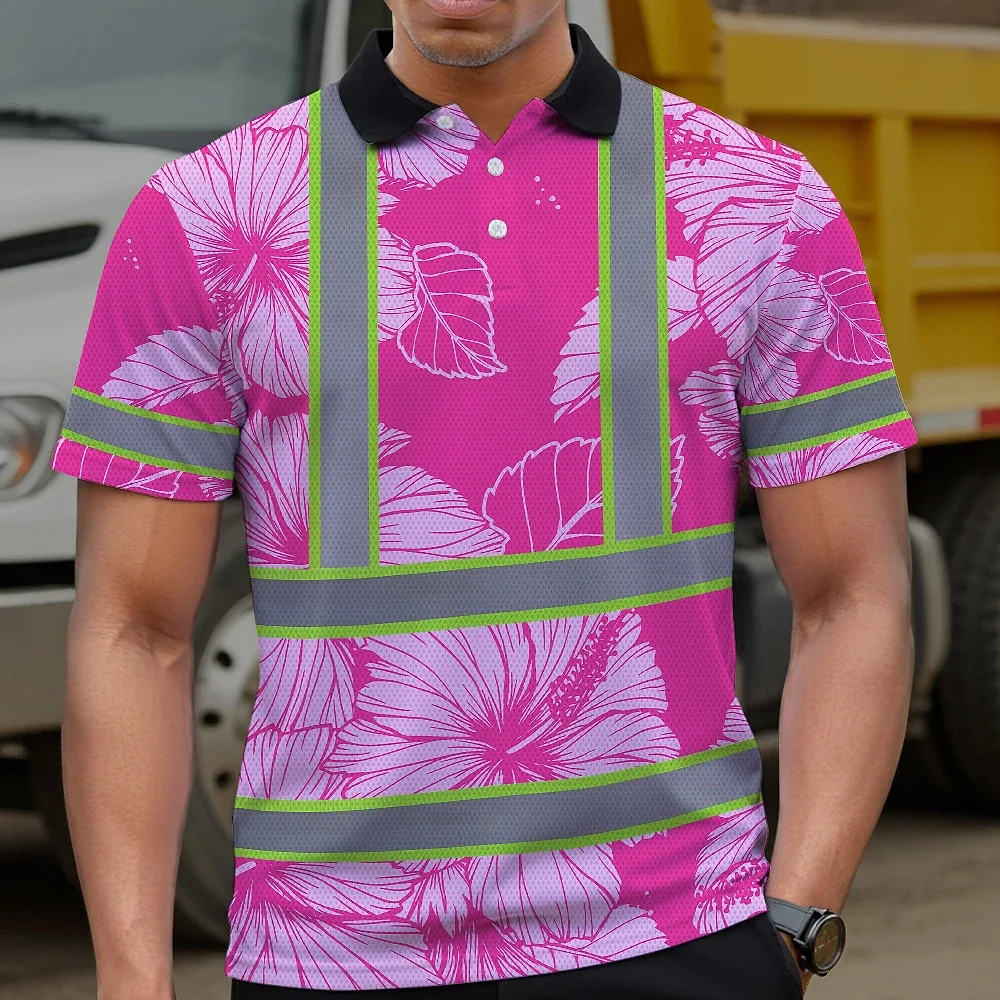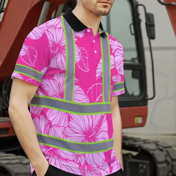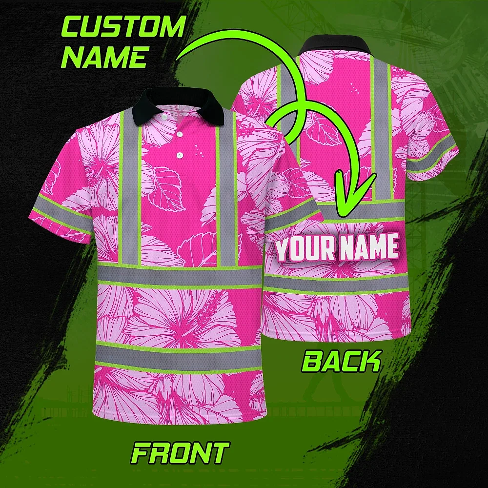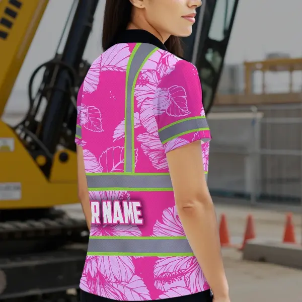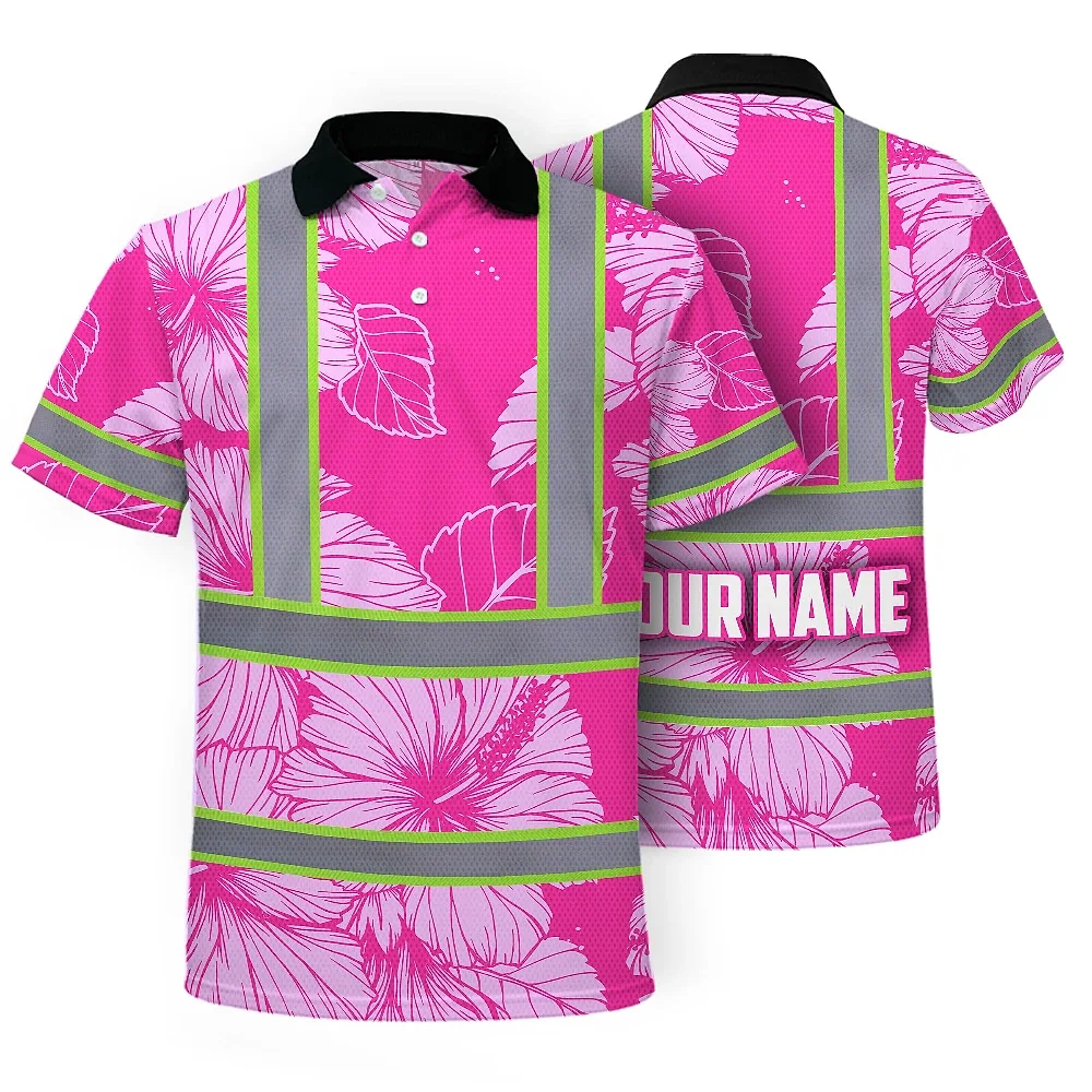 Hi Vis Polo Shirt Reflective Tapes Pink Neon Hibiscus Custom Name Safety Workwear For Workers, Truckers, Operators