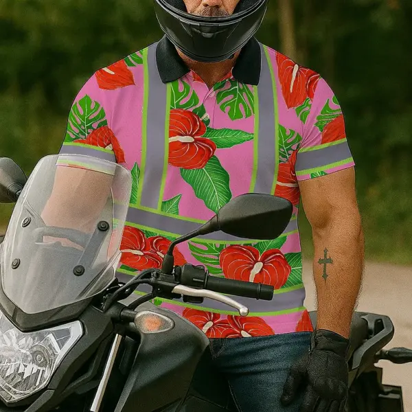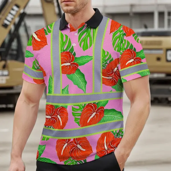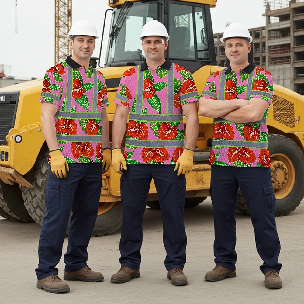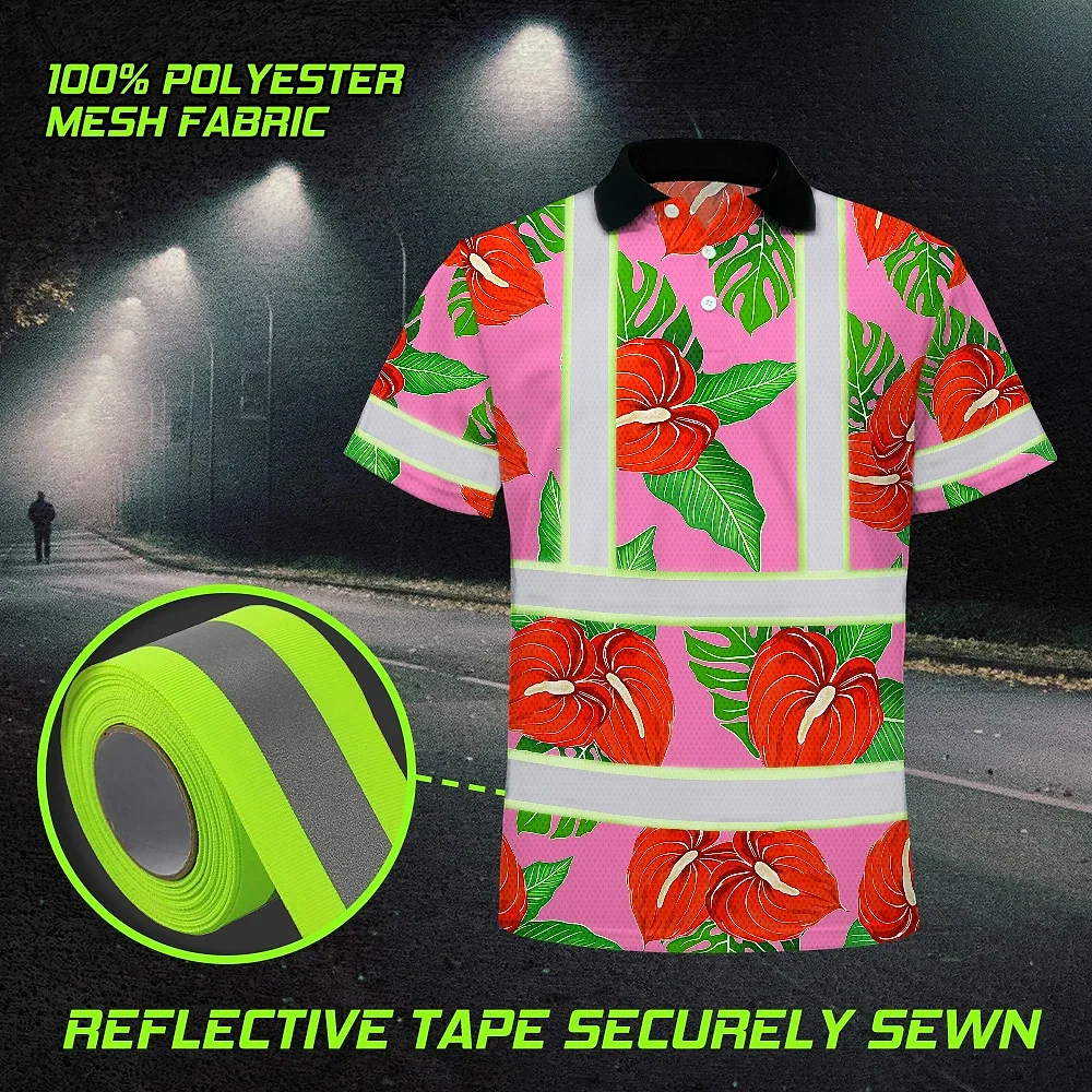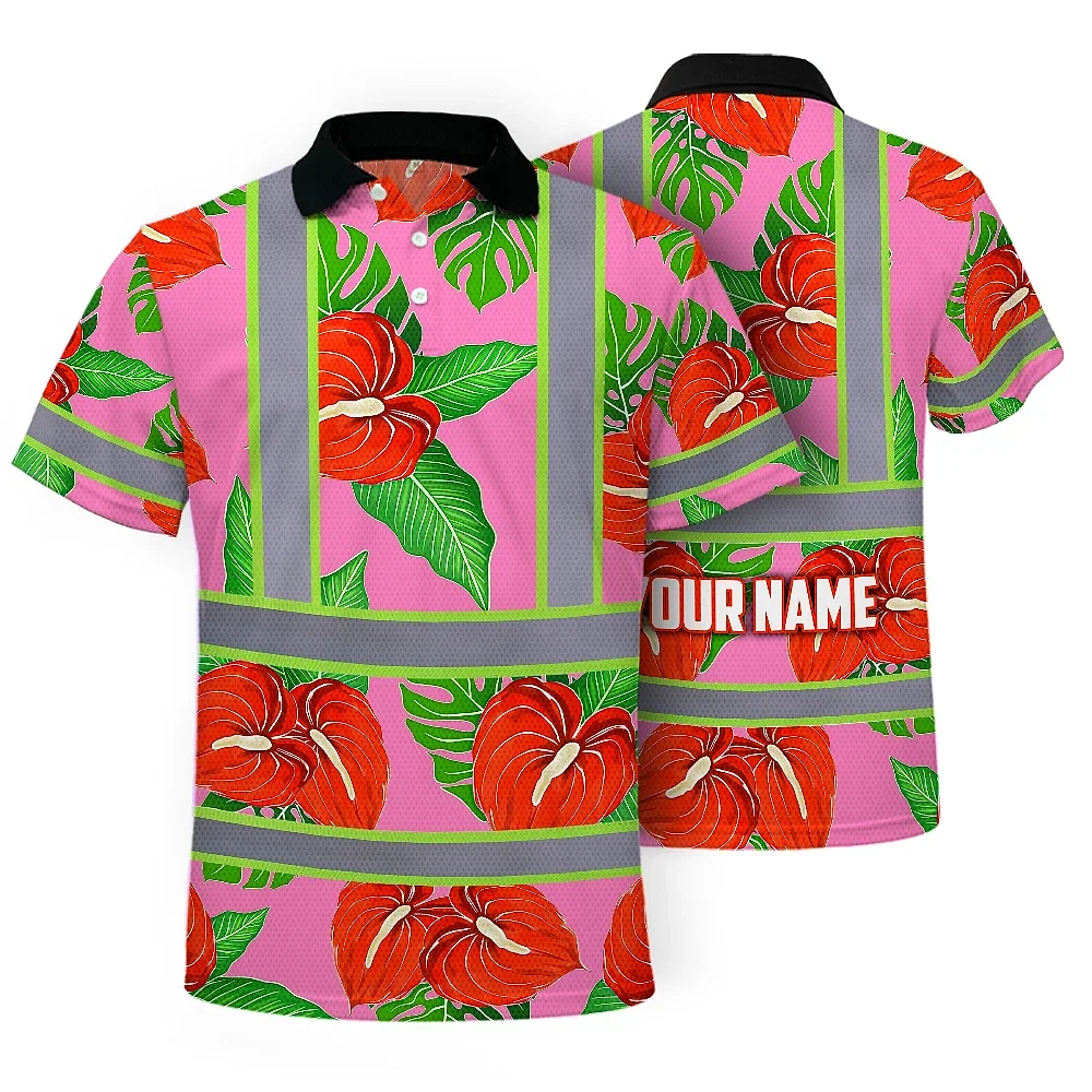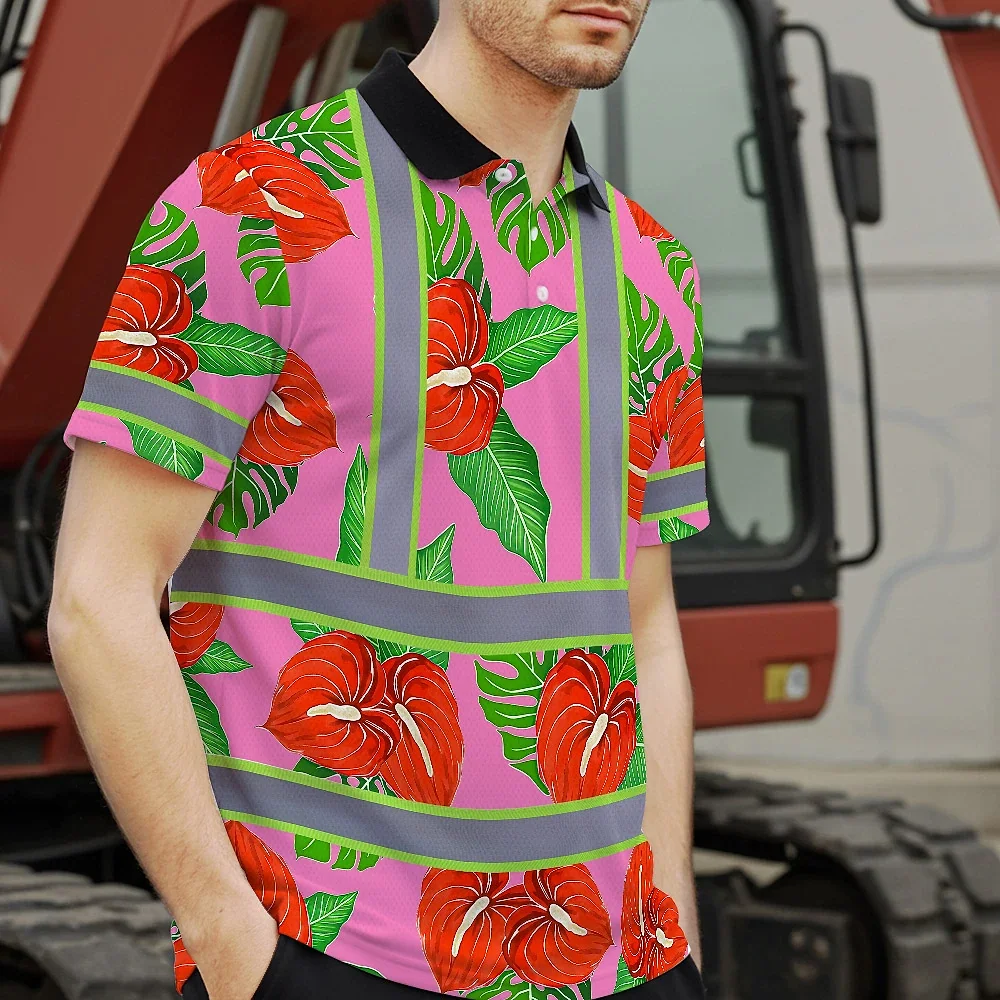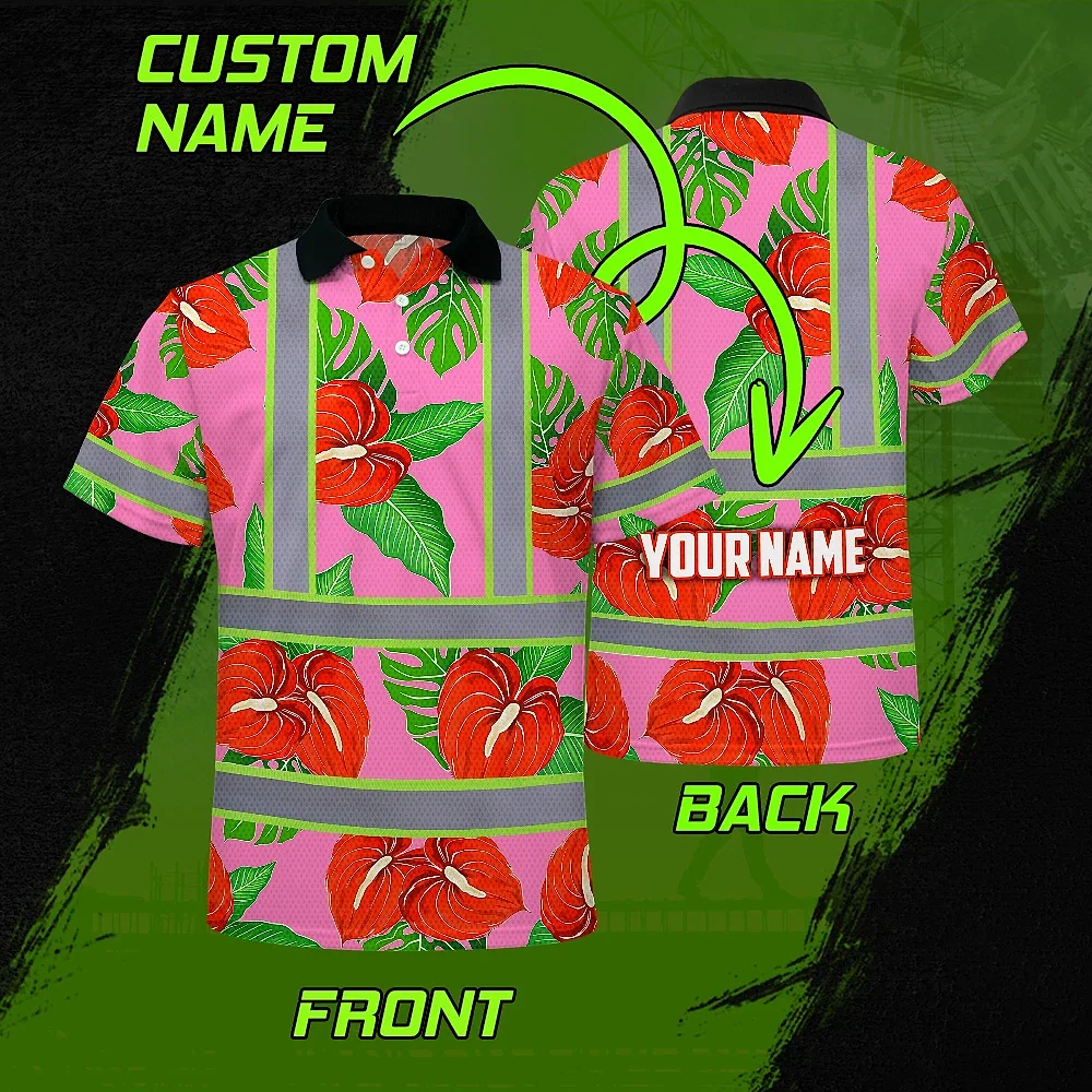 Hi Vis Polo Shirt Reflective Tapes Pink Neon Red Anthurium Custom Name Safety Workwear For Workers, Truckers, Operators