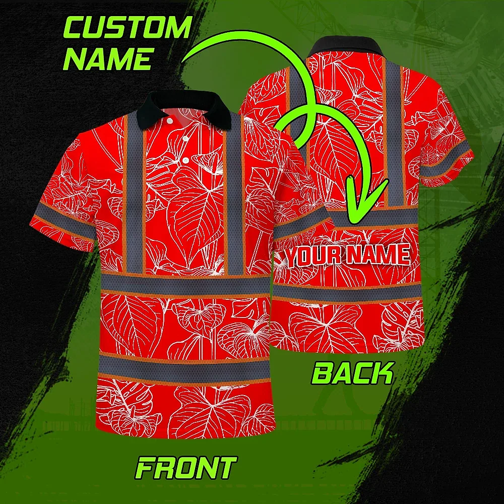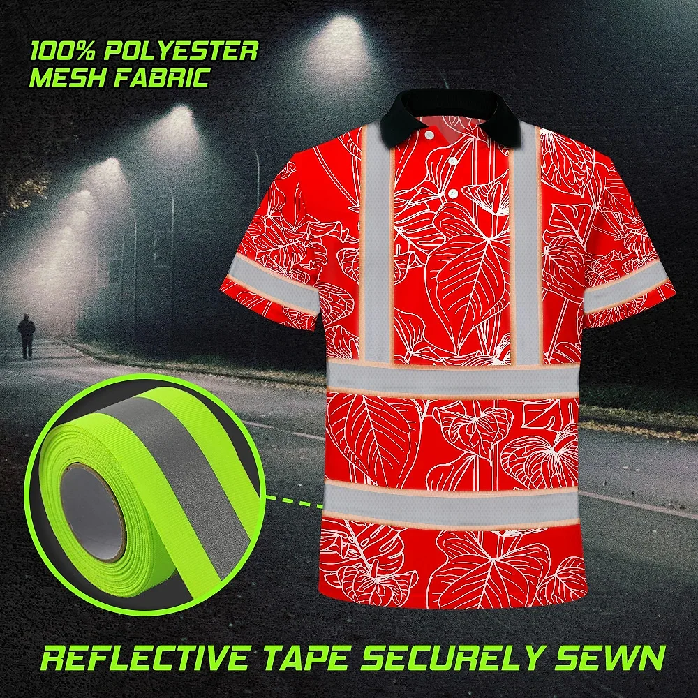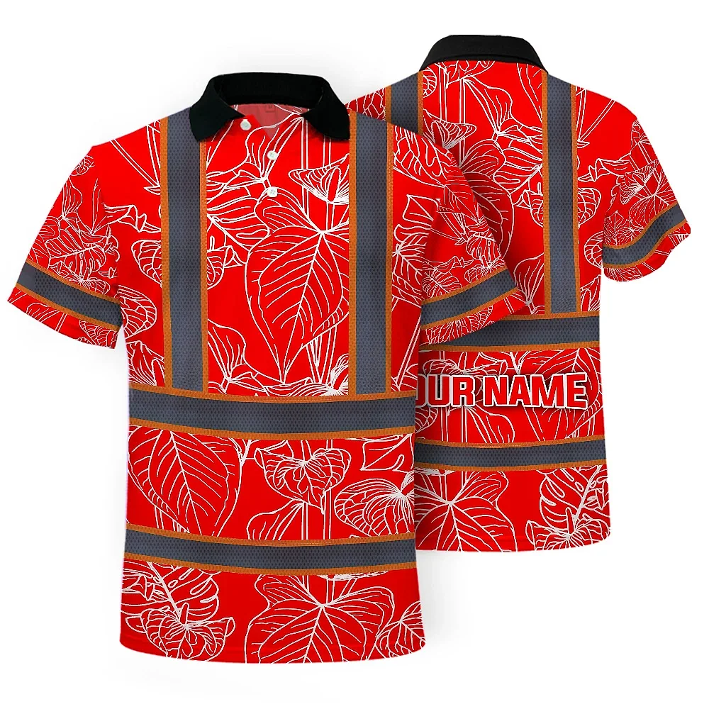 Hi Vis Polo Shirt Reflective Tapes Red Neon Flowers Custom Name Safety Workwear For Workers, Truckers, Operators