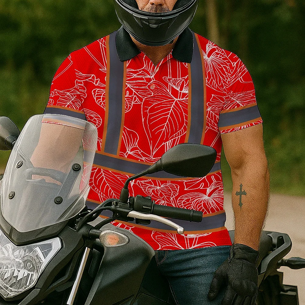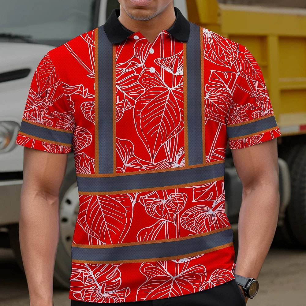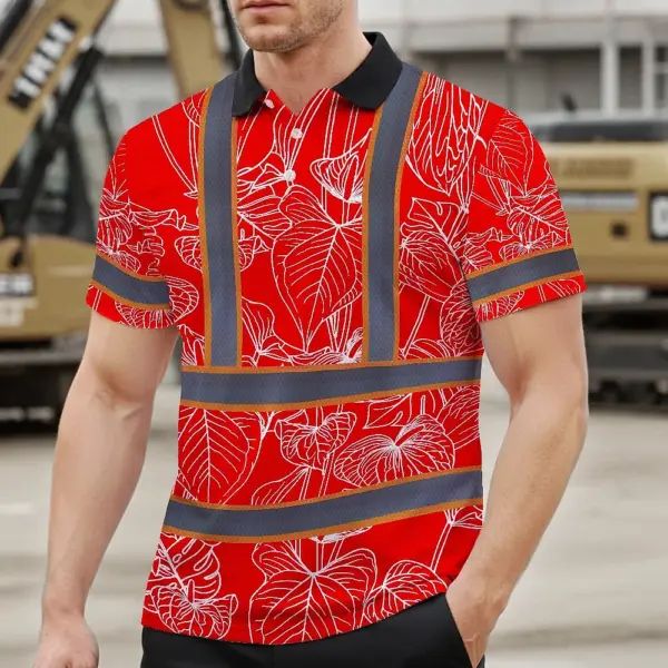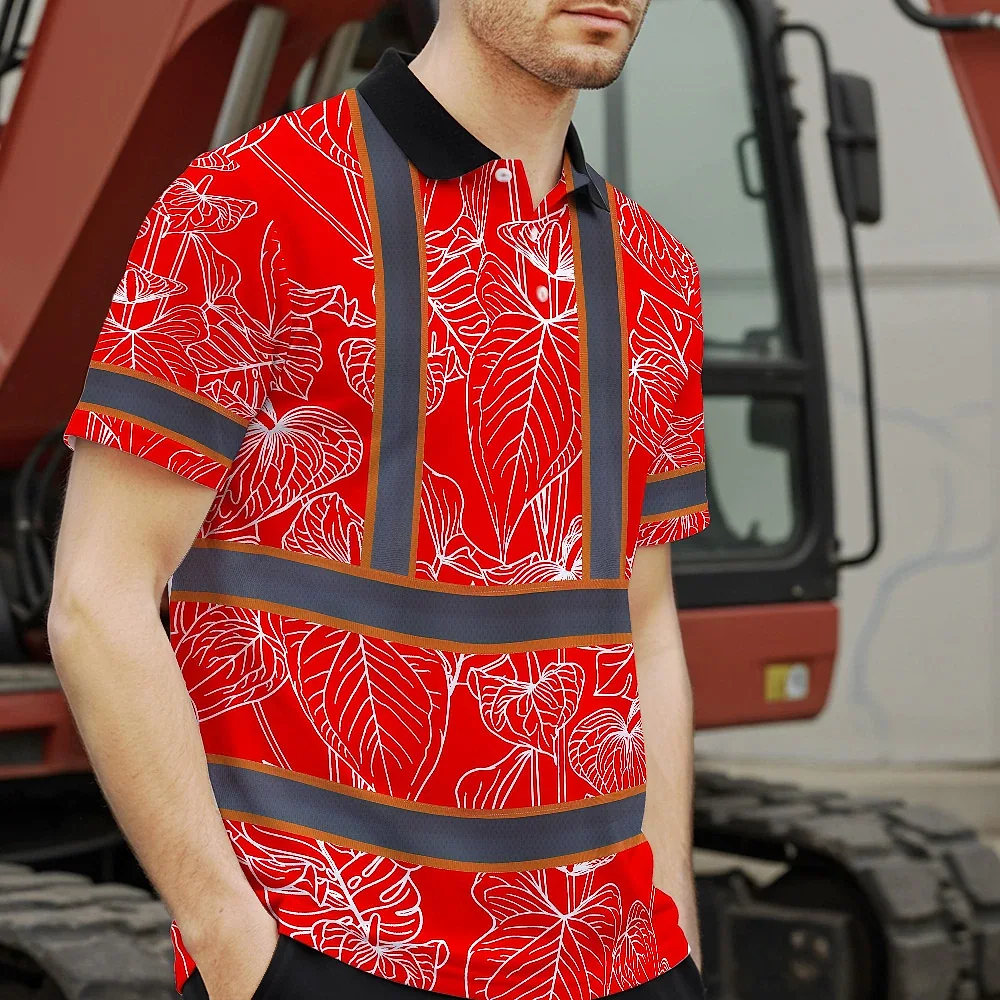 Hi Vis Polo Shirt Reflective Tapes Red Neon Flowers Custom Name Safety Workwear For Workers, Truckers, Operators