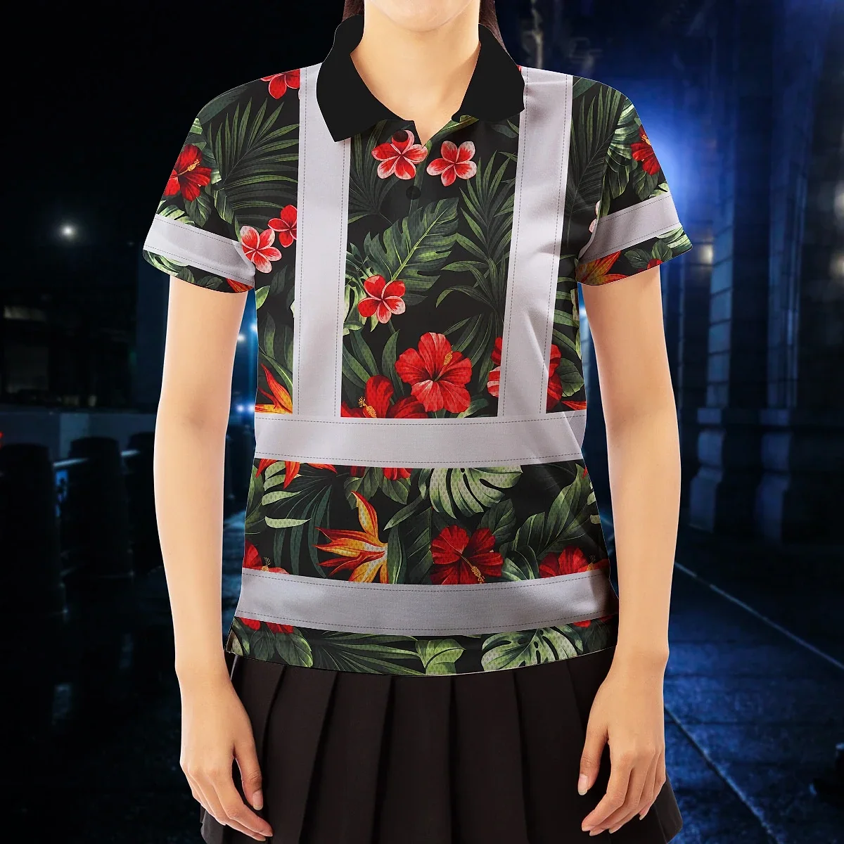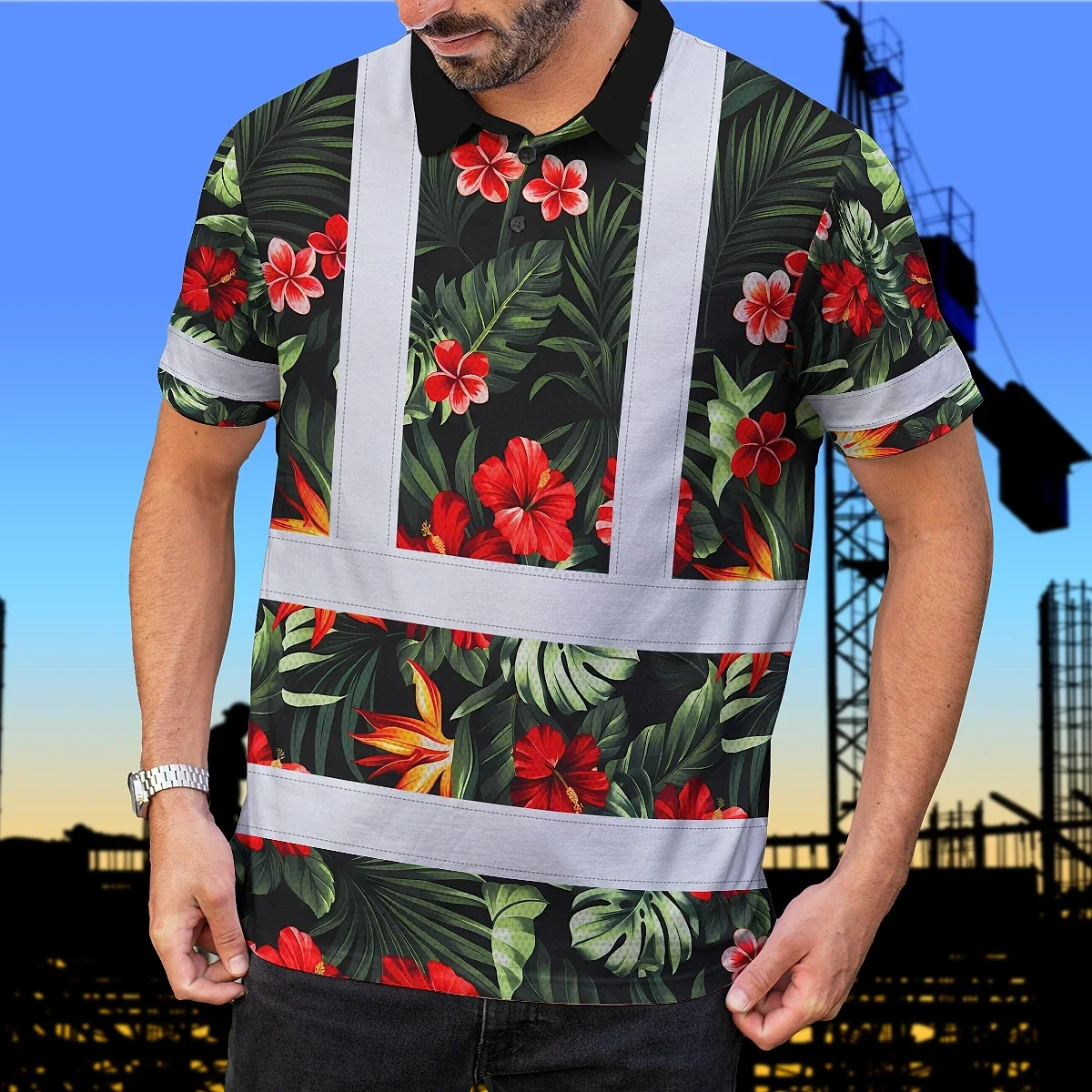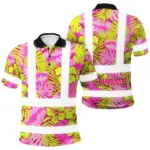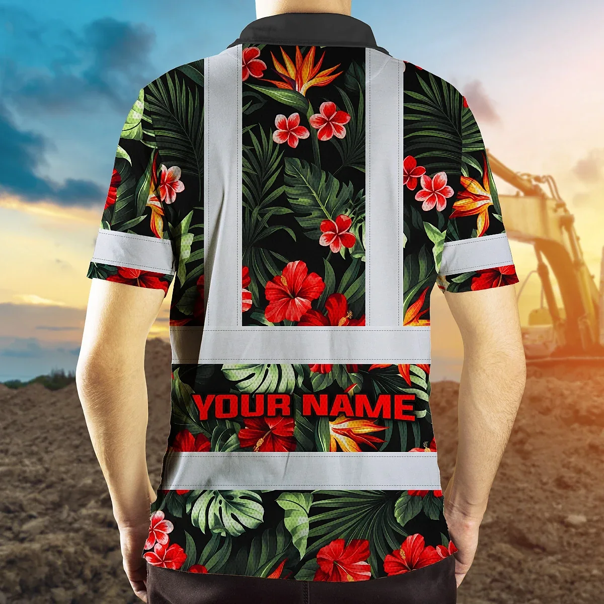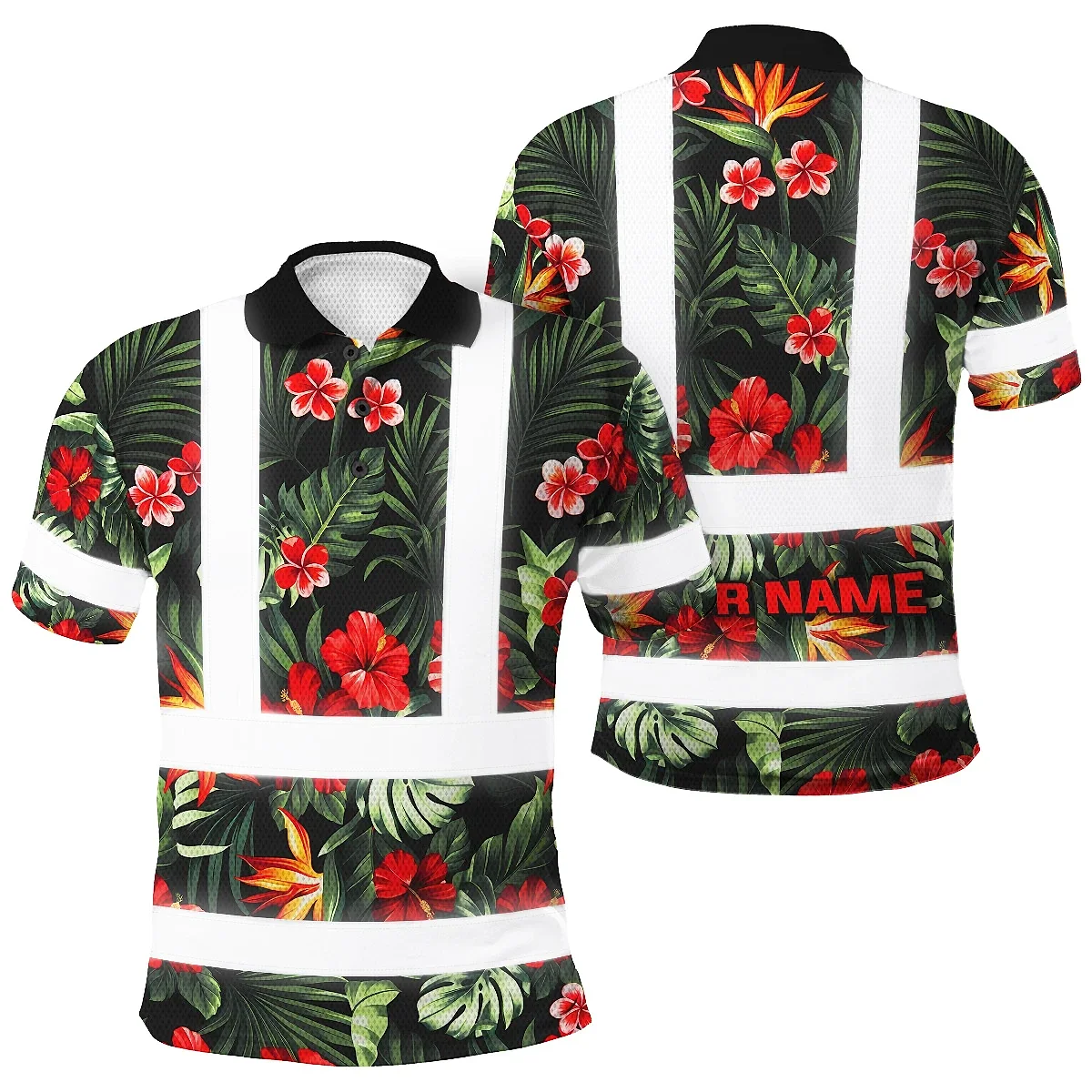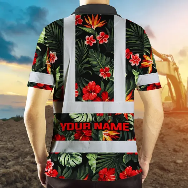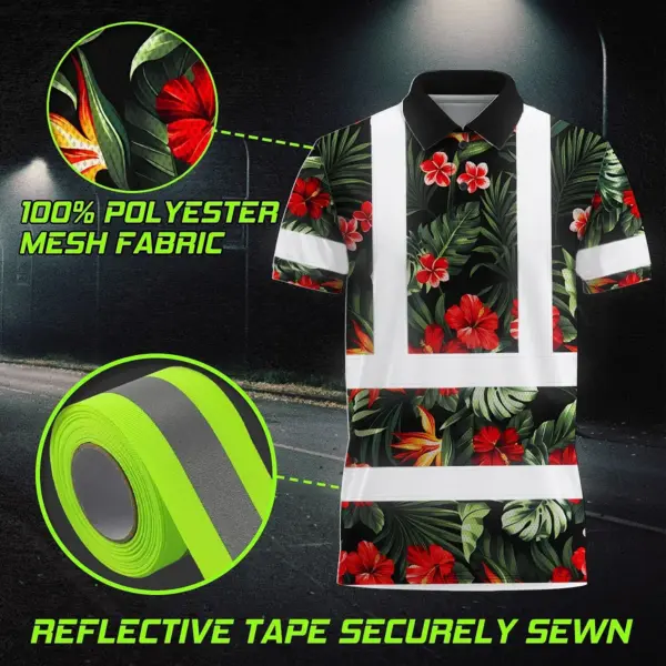 Hi Vis Polo Shirt Reflective Tapes Red Neon Flowers Custom Name Safety Workwear For Workers, Truckers, Operators