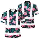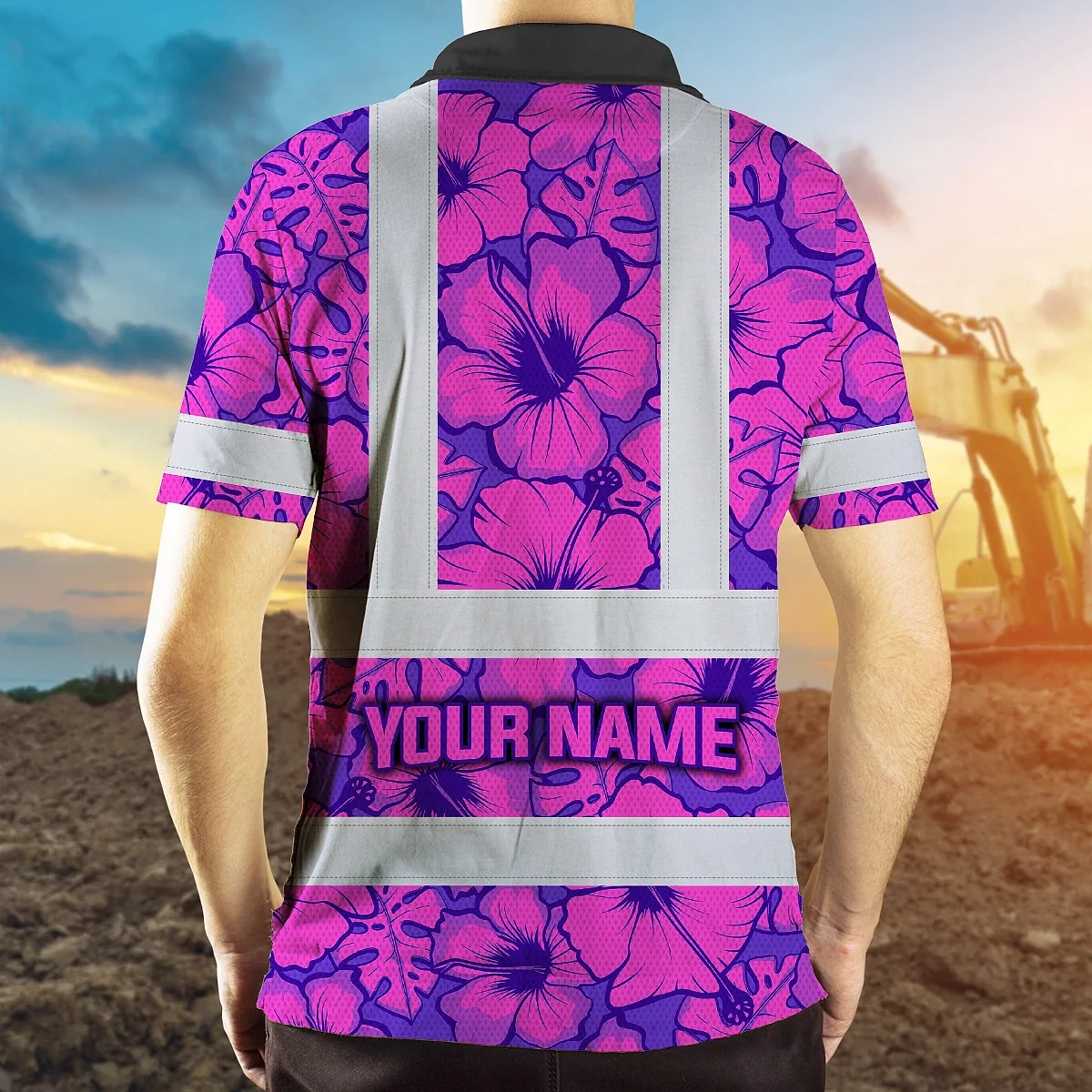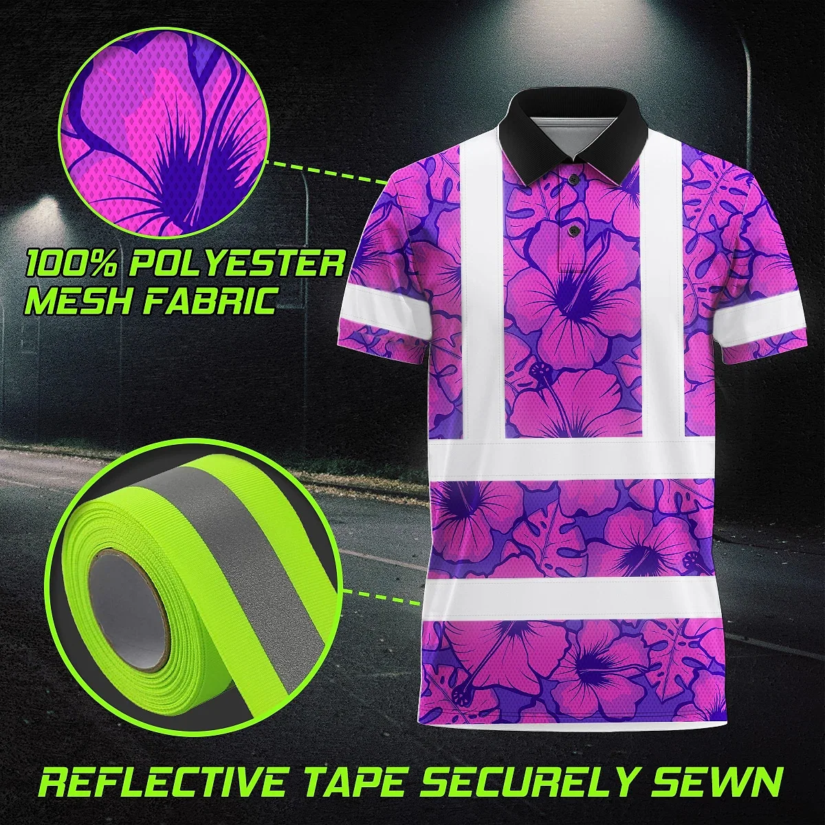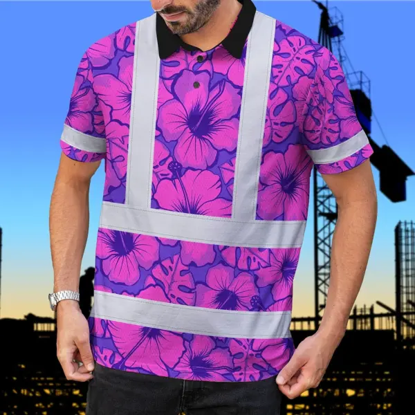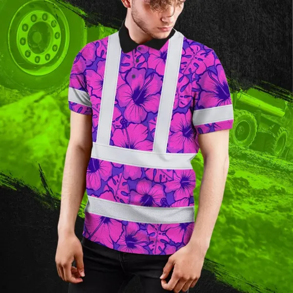 Hi Vis Polo Shirt Reflective Tapes Violet Neon And Pink Flowers Custom Name Safety Workwear For Workers, Truckers, Operators