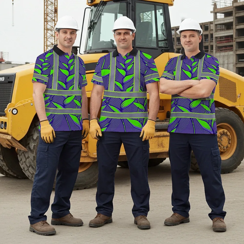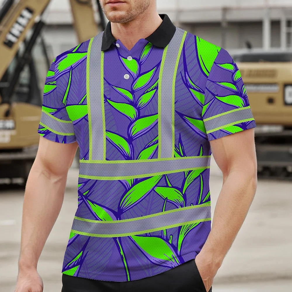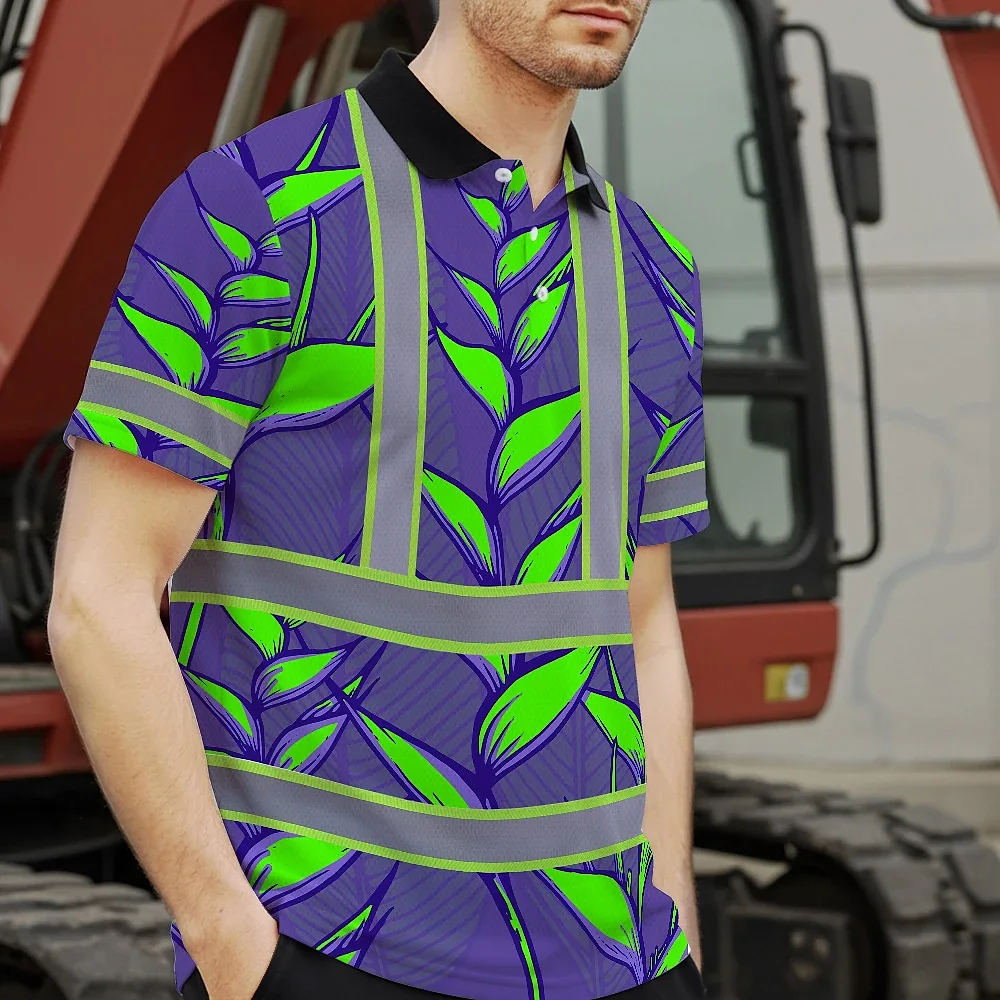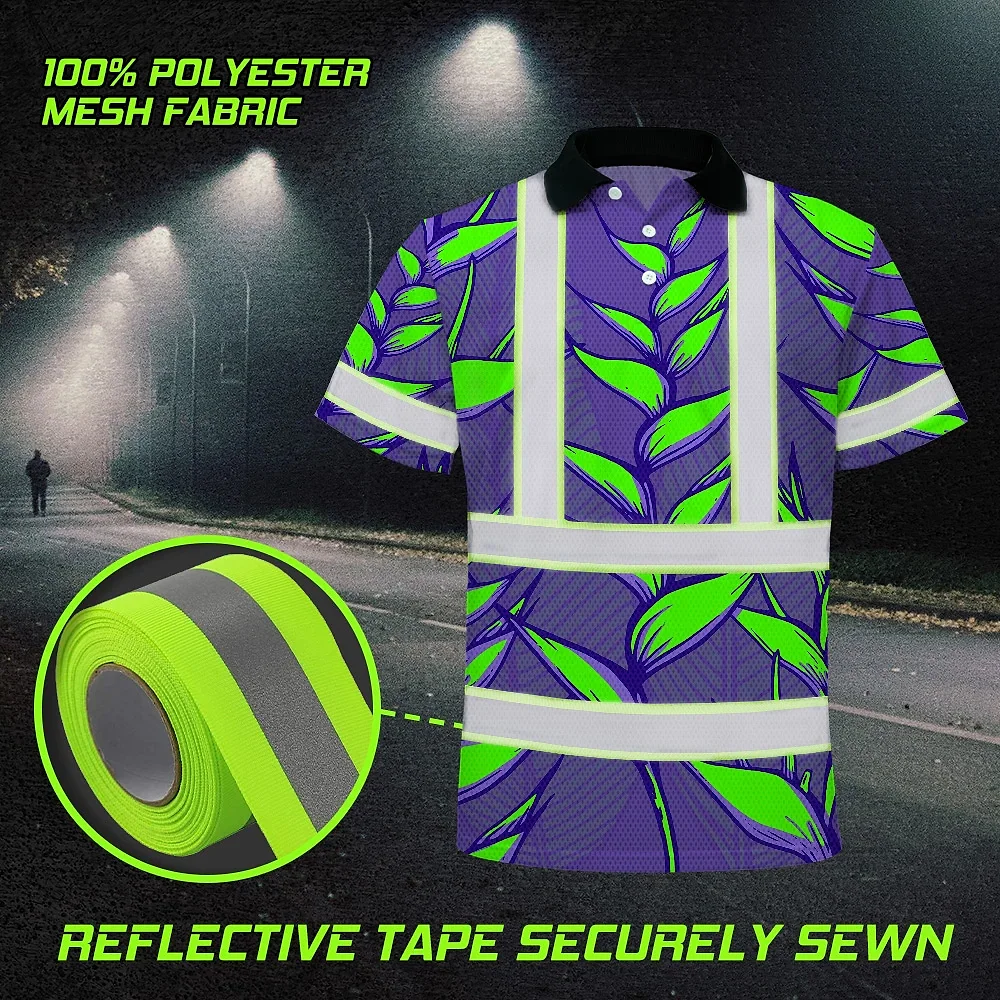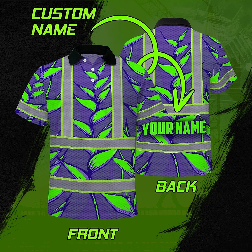 Hi Vis Polo Shirt Reflective Tapes Violet Neon Green Heliconia Custom Name Safety Workwear For Workers, Truckers, Operators