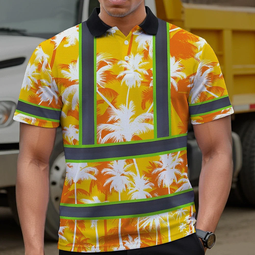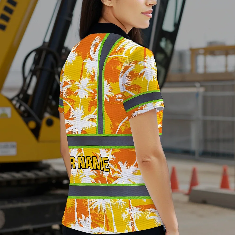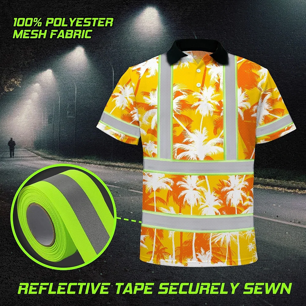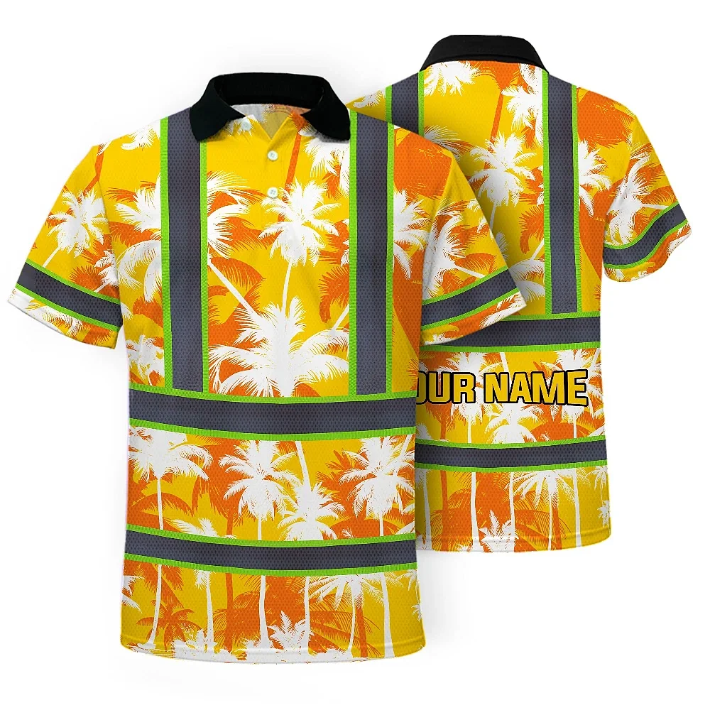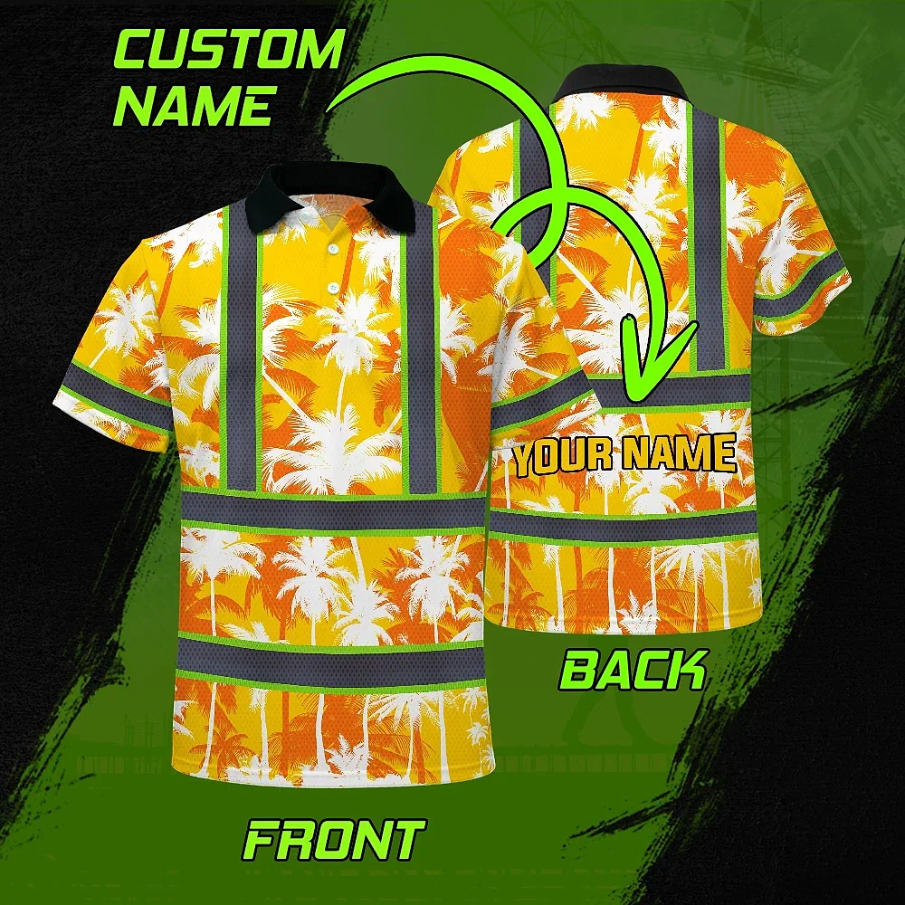 Hi Vis Polo Shirt Reflective Tapes Yellow Neon Flowers Custom Name Safety Workwear For Workers, Truckers, Operators