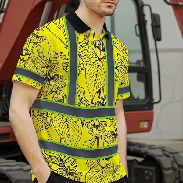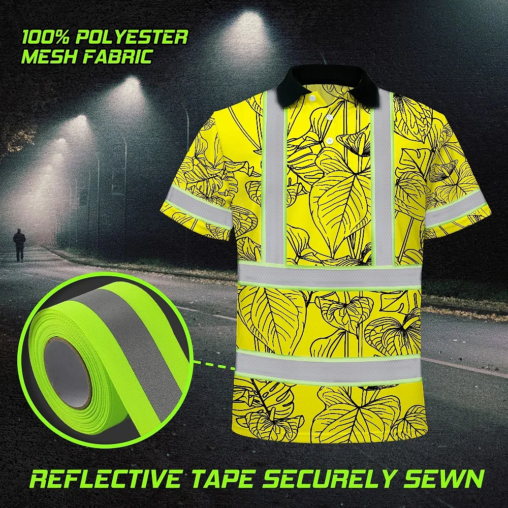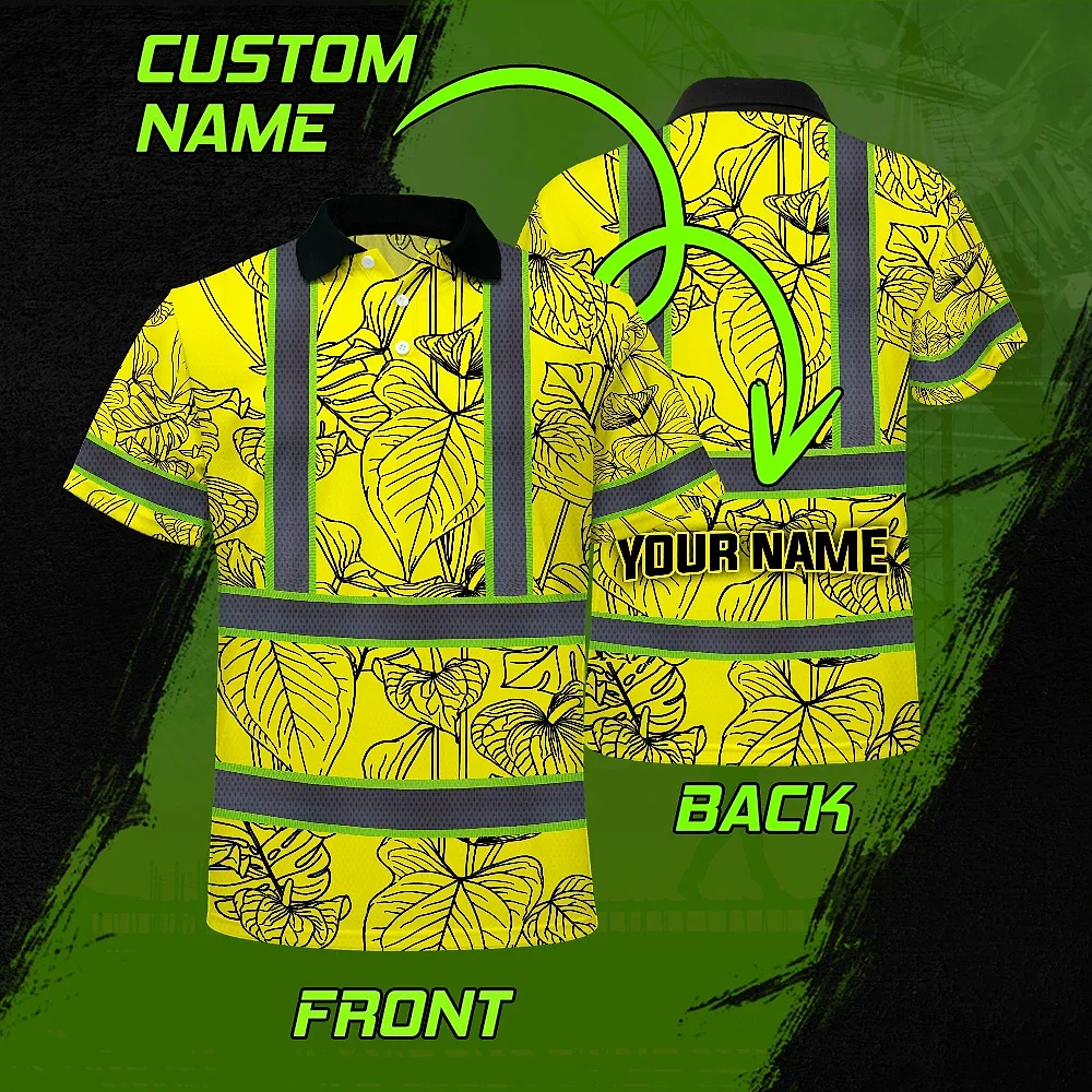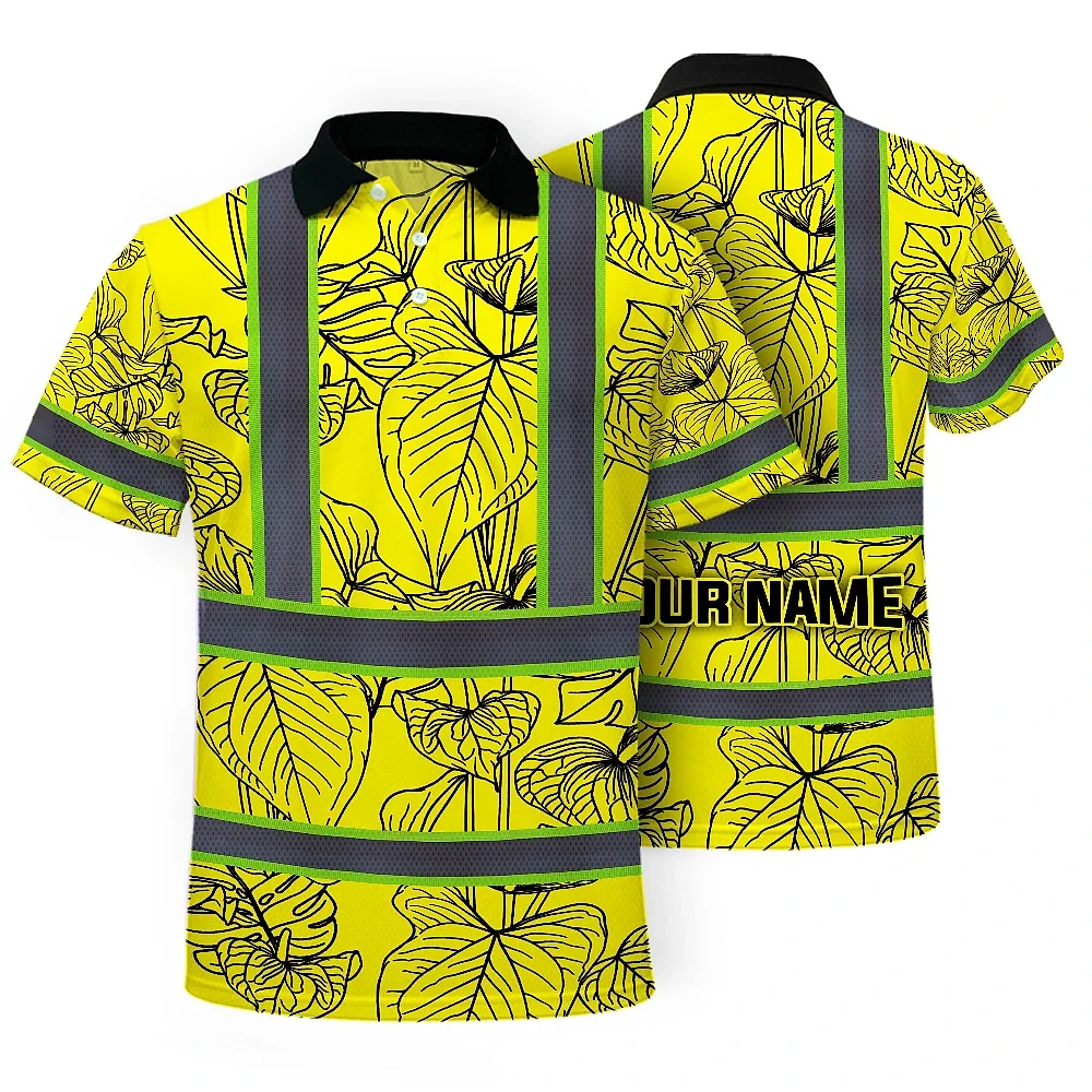 Hi Vis Polo Shirt Reflective Tapes Yellow Neon Flowers Custom Name Safety Workwear For Workers, Truckers, Operators