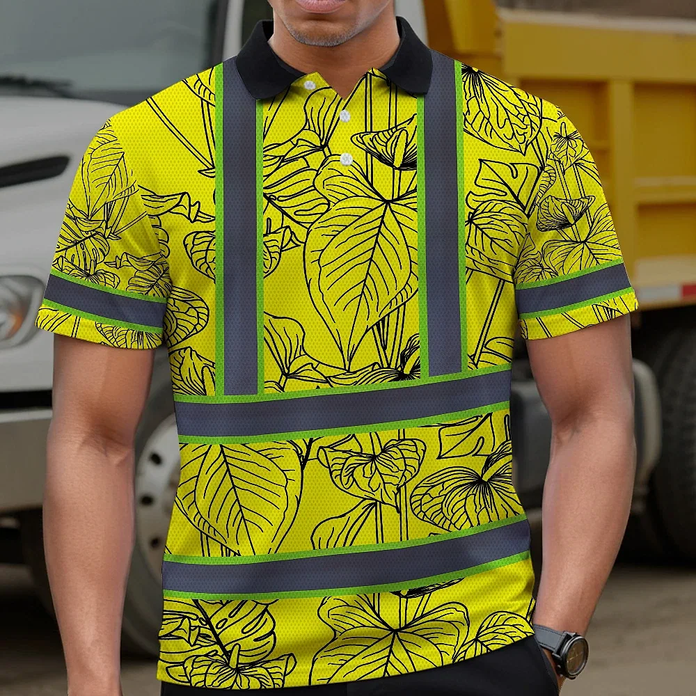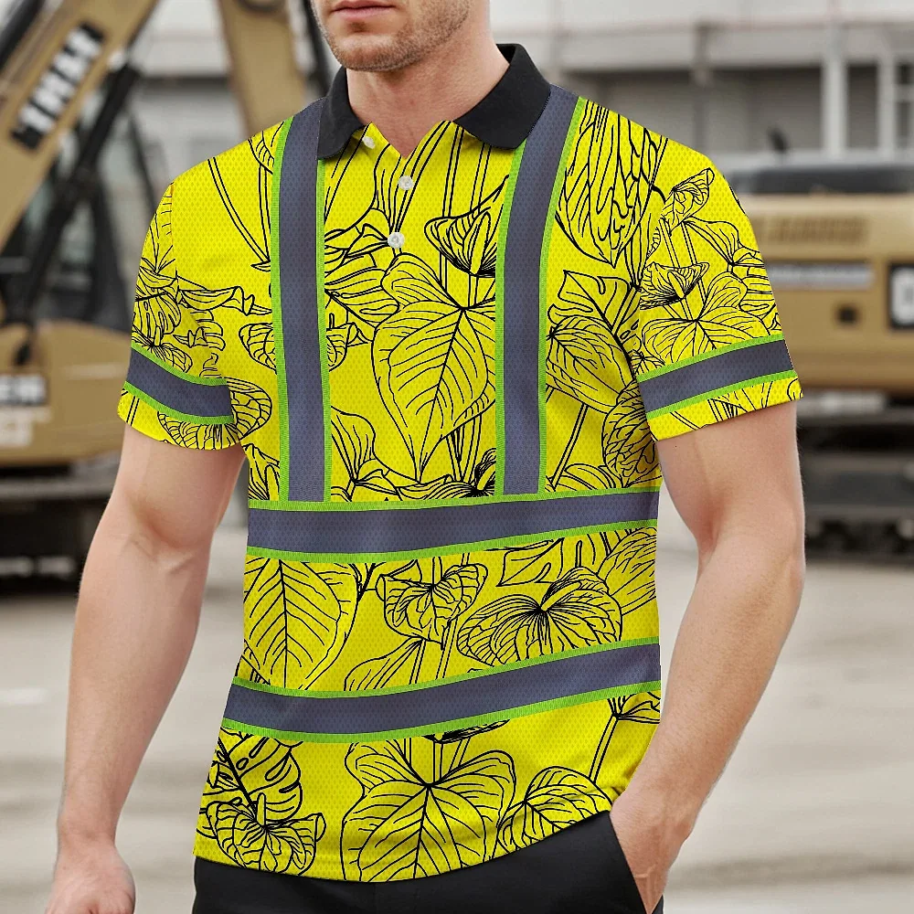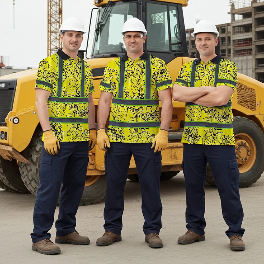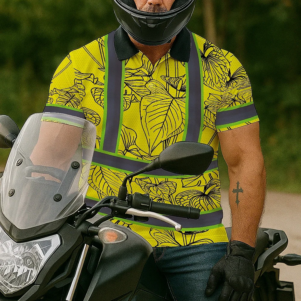 Hi Vis Polo Shirt Reflective Tapes Yellow Neon Flowers Custom Name Safety Workwear For Workers, Truckers, Operators