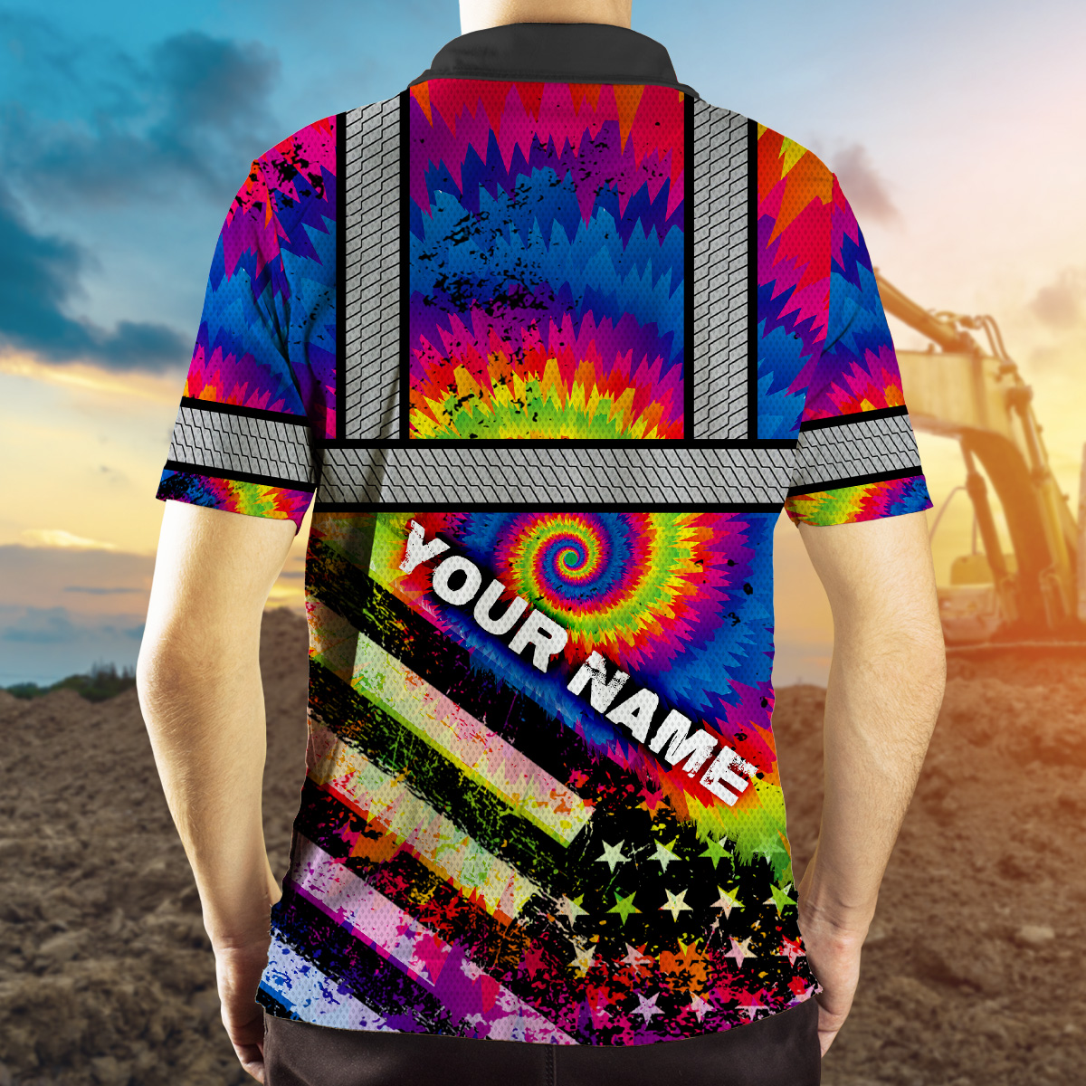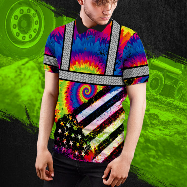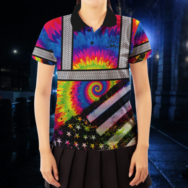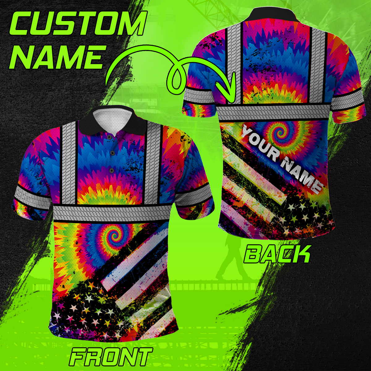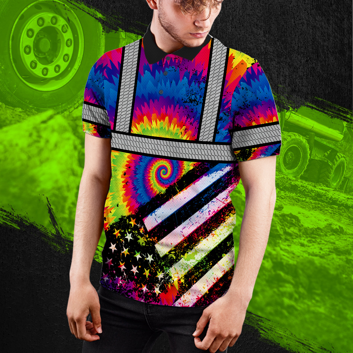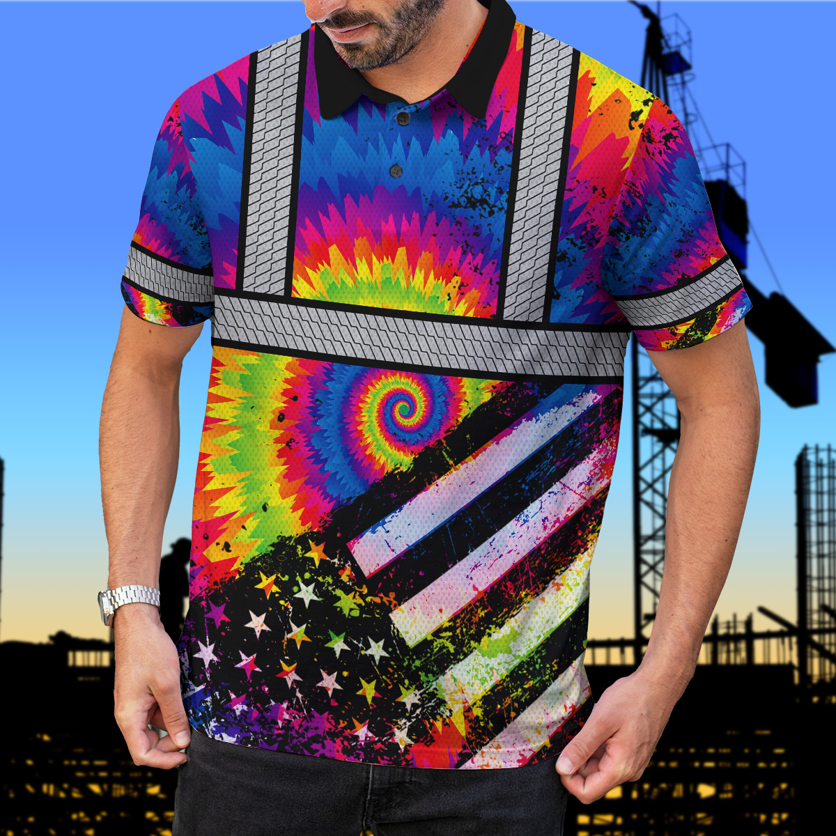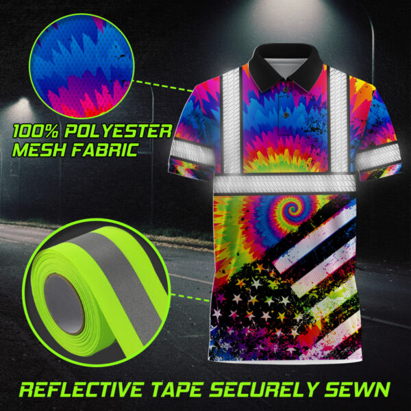 Hi Vis Polo Shirt Reflective Tie Dye 2 US Flag Paint Safety Workwear For Motorcycle Bicycle, Runner