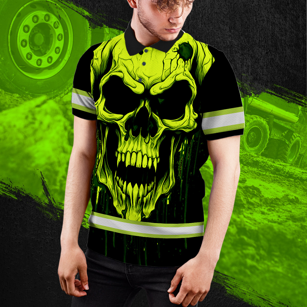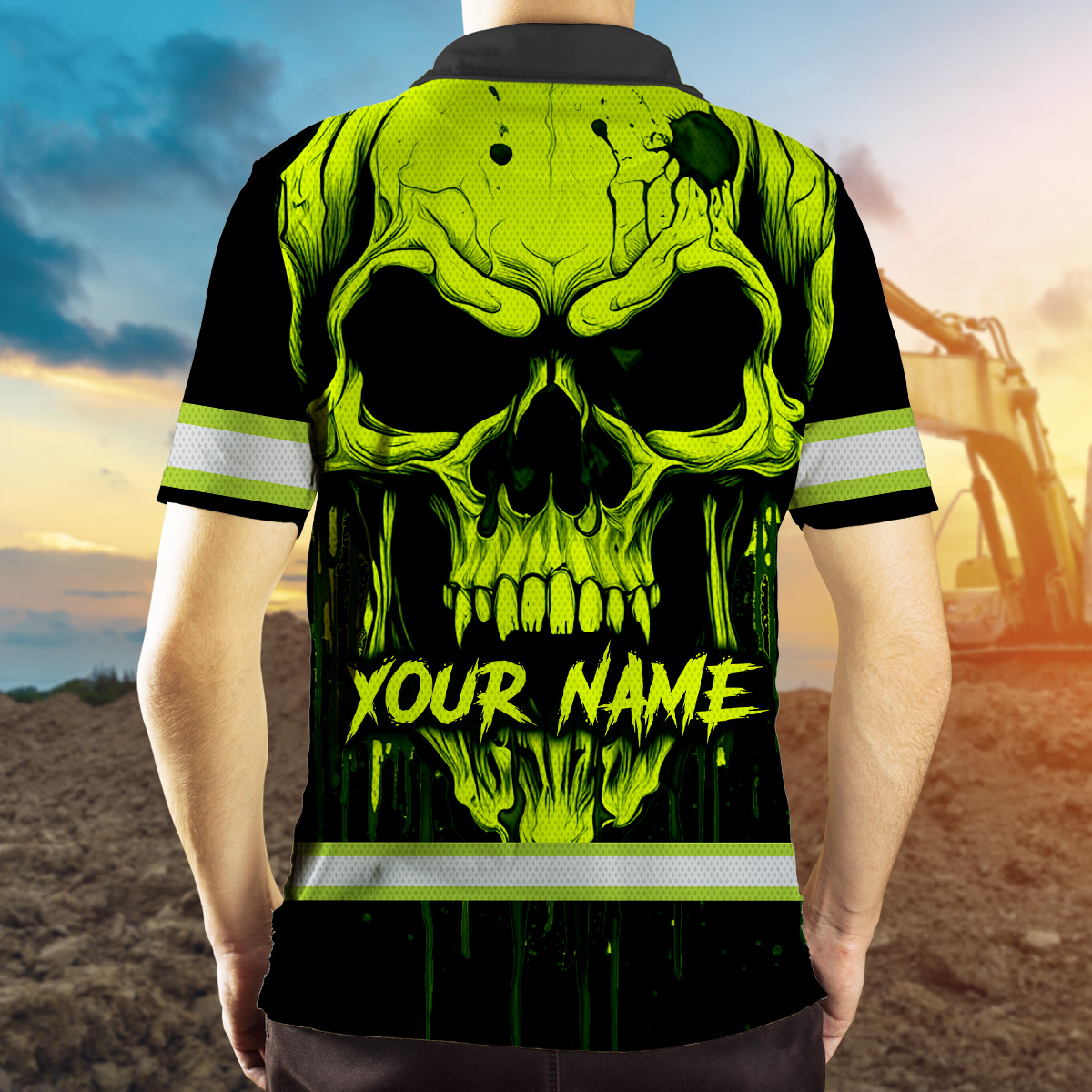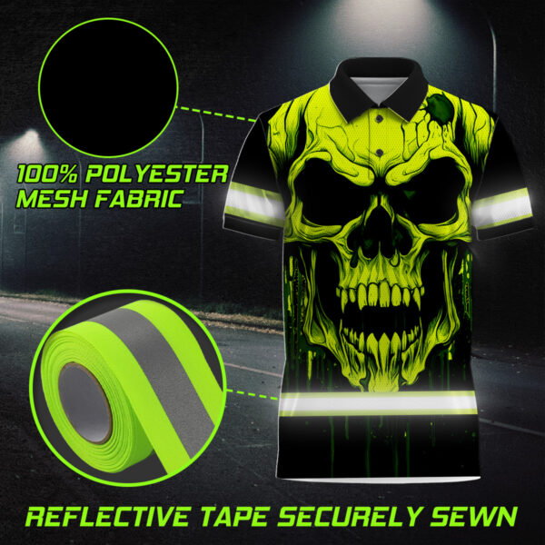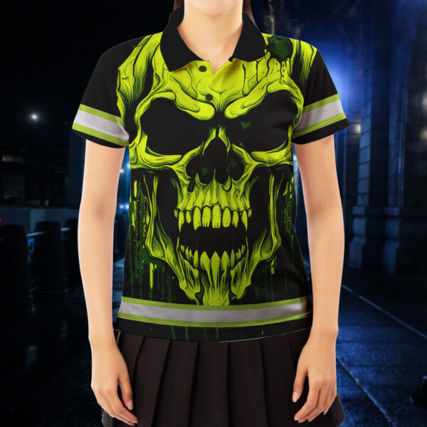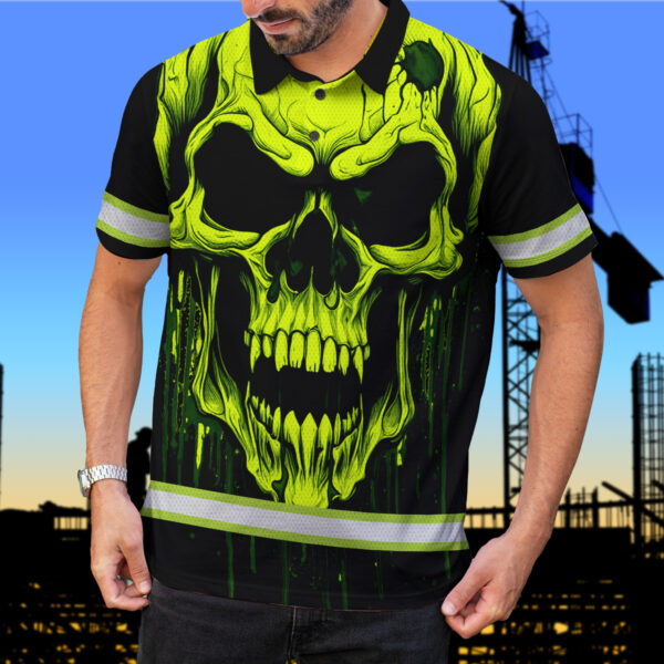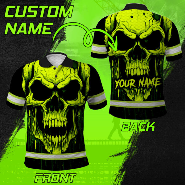 Hi Vis Polo Shirt With Lime Neon Skull – Custom Name Safety Workwear For Runners, Cyclists, Skull Lover