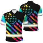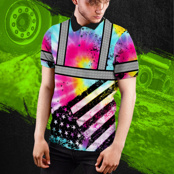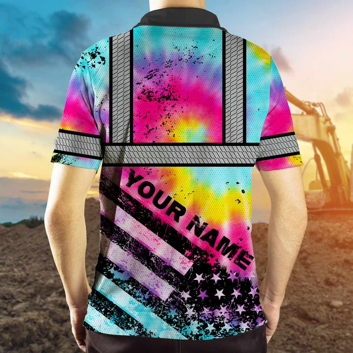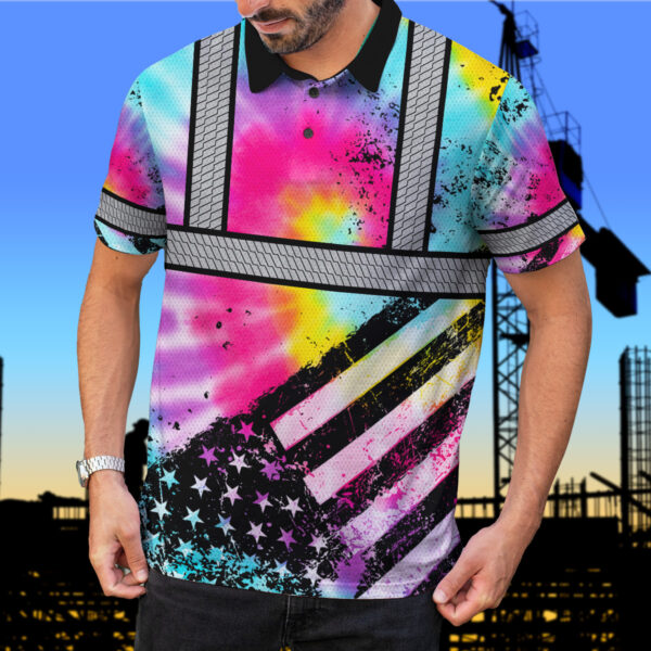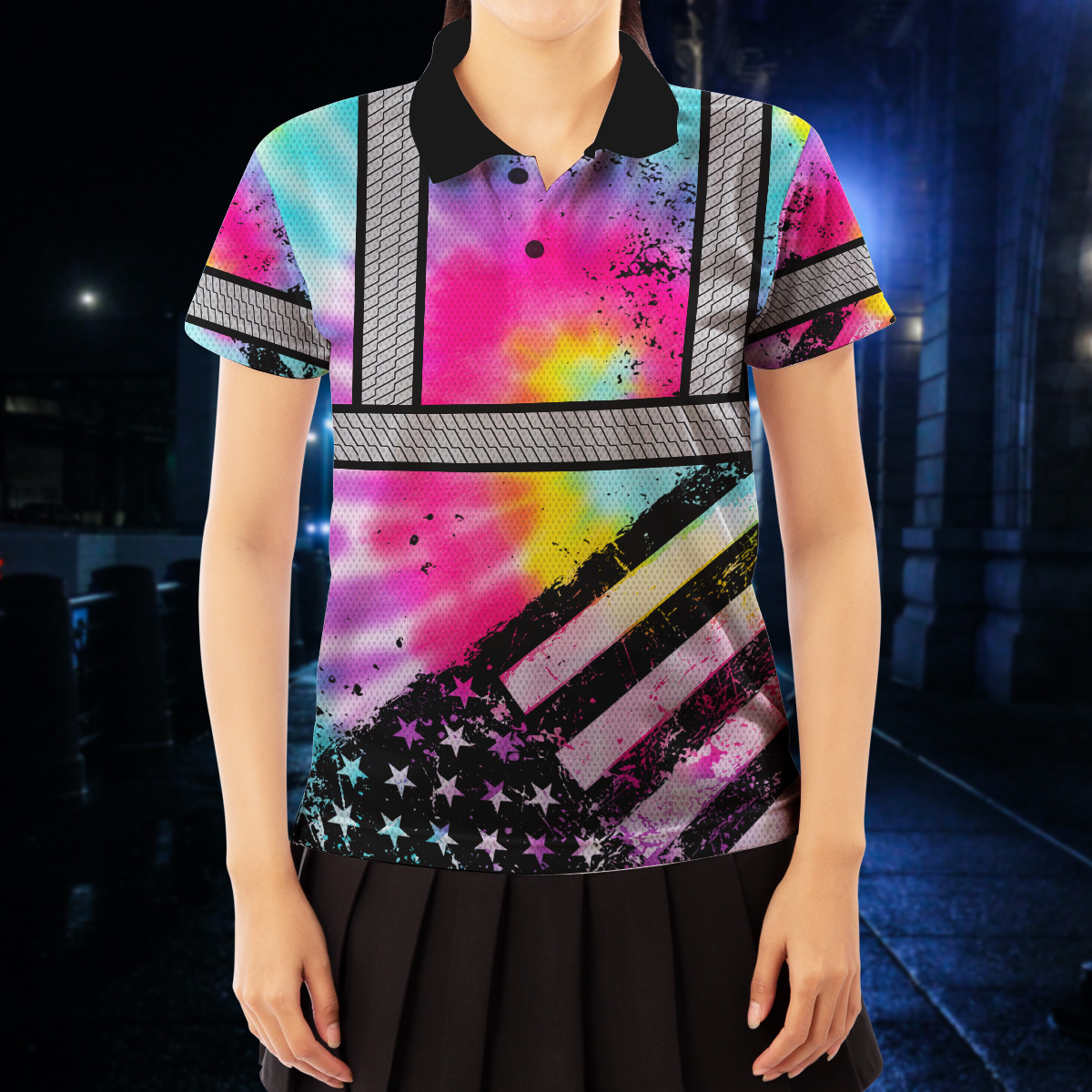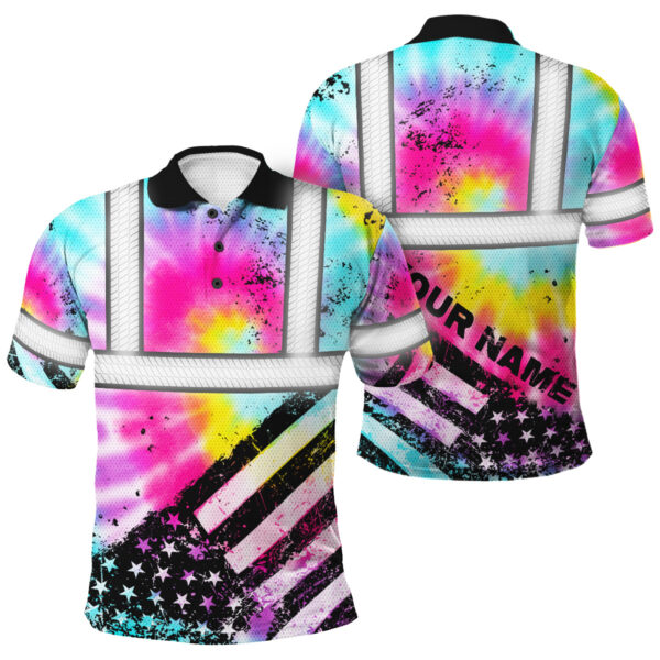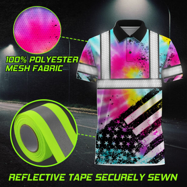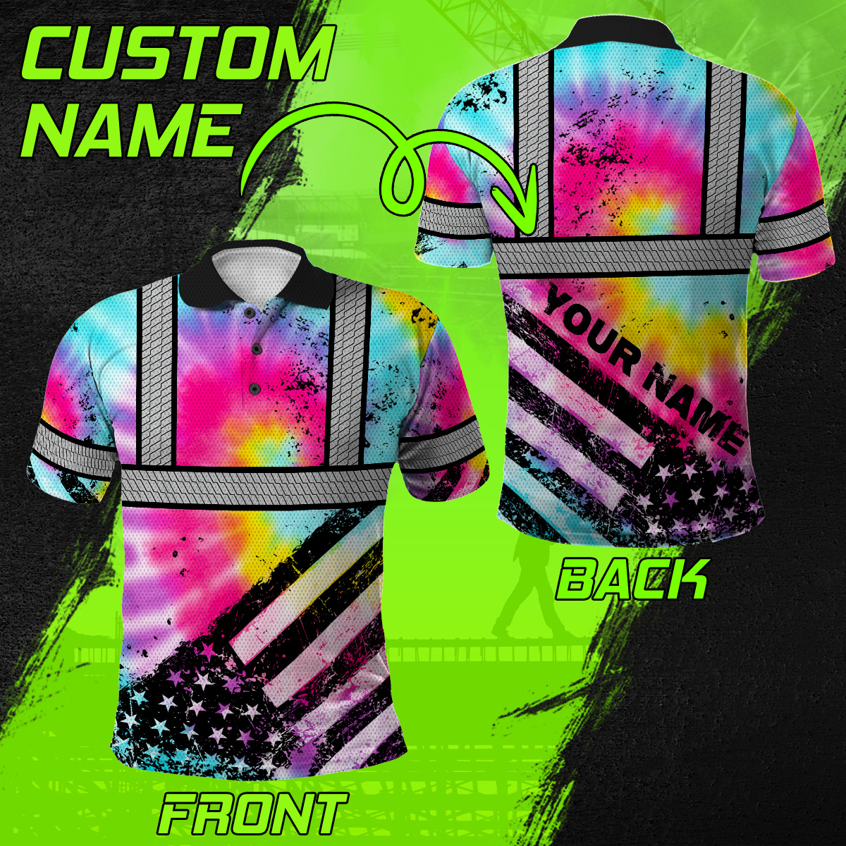 Hi Vis Polo Shirt With Tie Dye US Flag Paint - Custom Name Safety Workwear For Motorcycle Bicycle, Runner, Patriotic