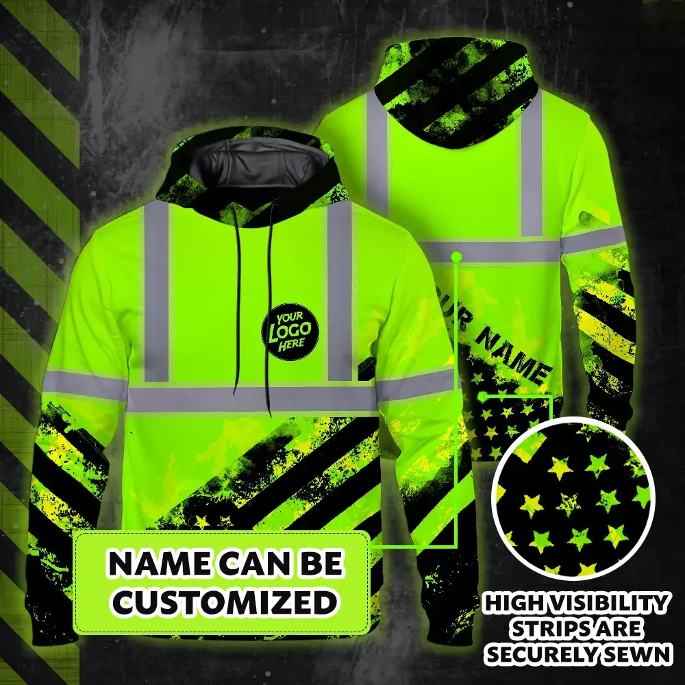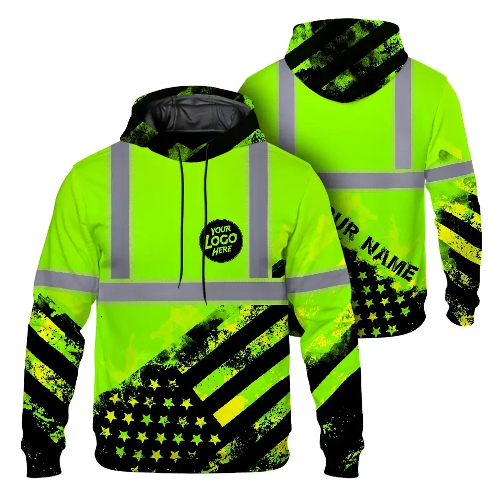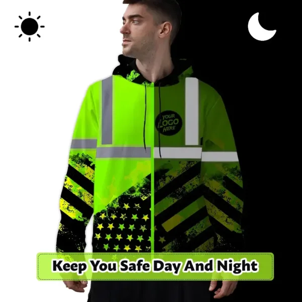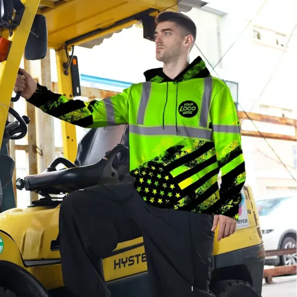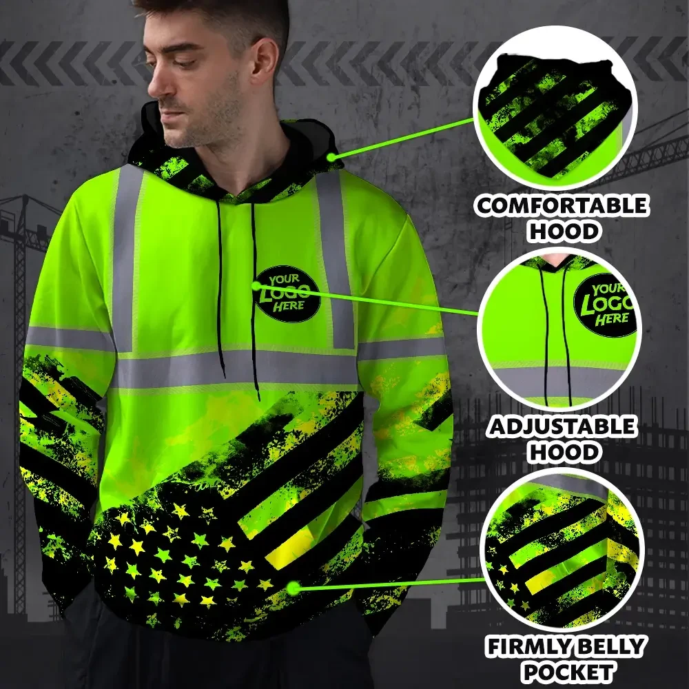 Hi Vis Reflective Green American Flag Custom Name And Logo Hoodie Safety Workwear