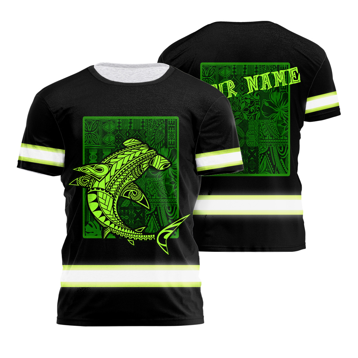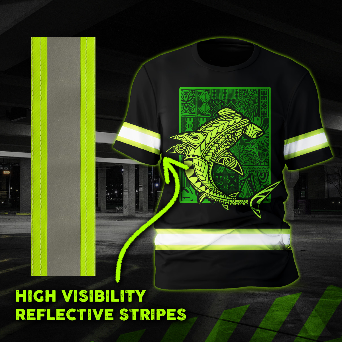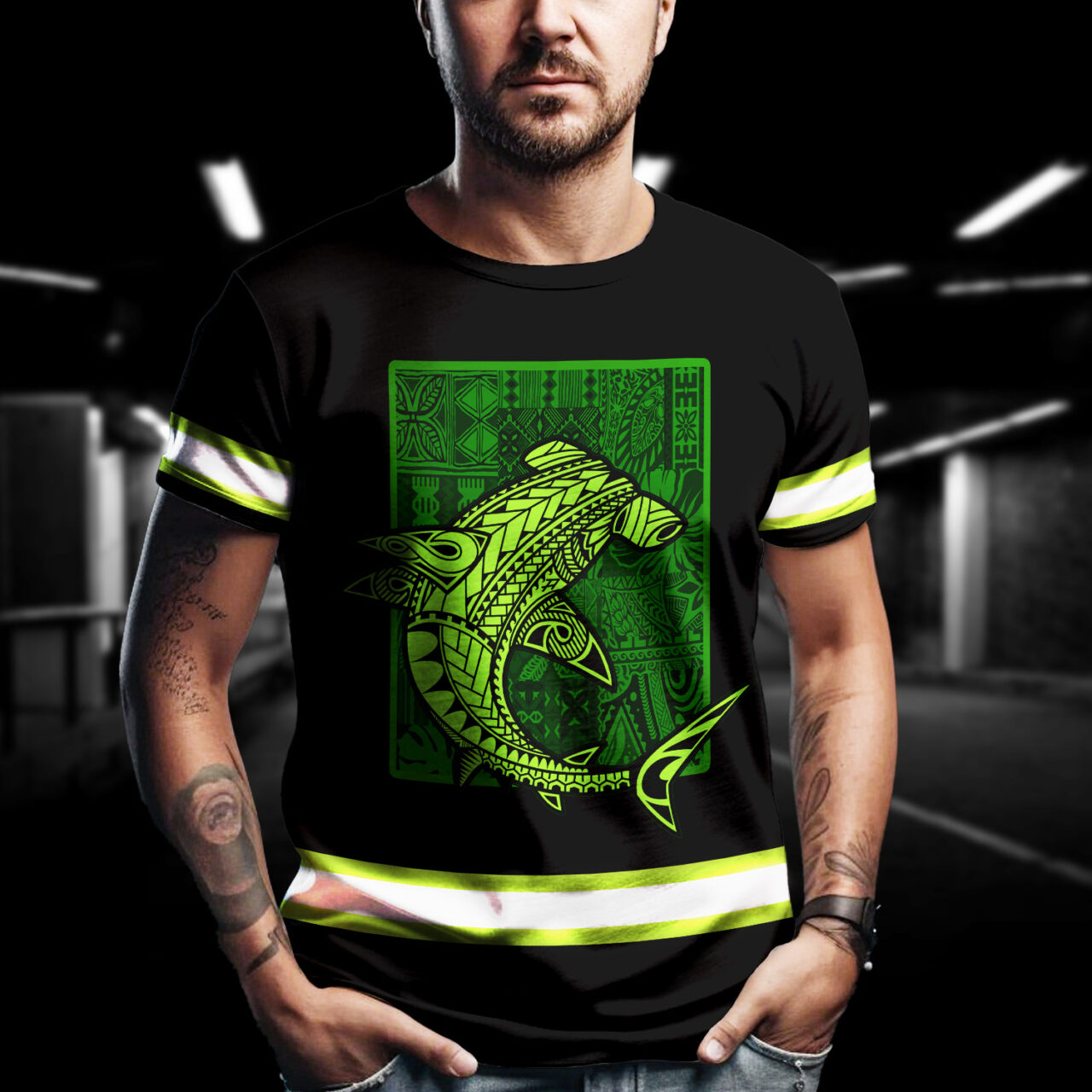 Hi Vis Shirt For Men Reflective Gradient Green Neon Polynesian Triba Hammerhead Shark And Marine Animals Hawaiian Custom Name