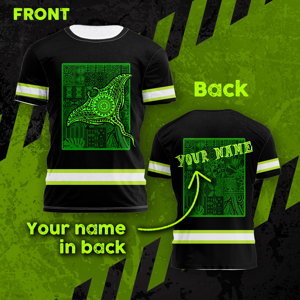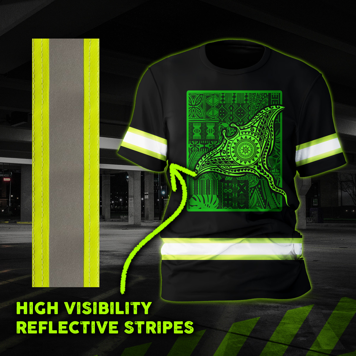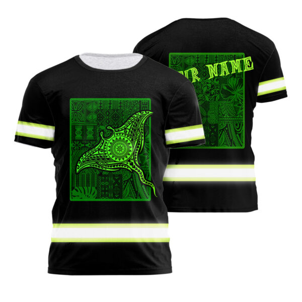 Hi Vis Shirt For Men Reflective Gradient Green Neon Polynesian Triba Manta Ray And Marine Animals Hawaiian Custom Name Safety Workwear