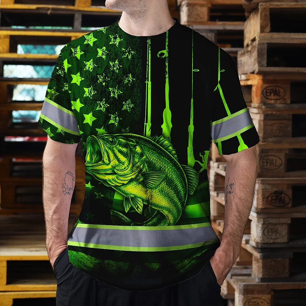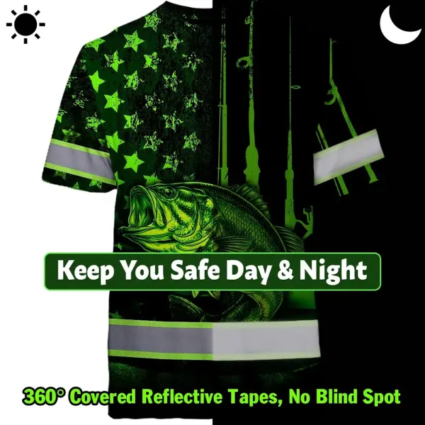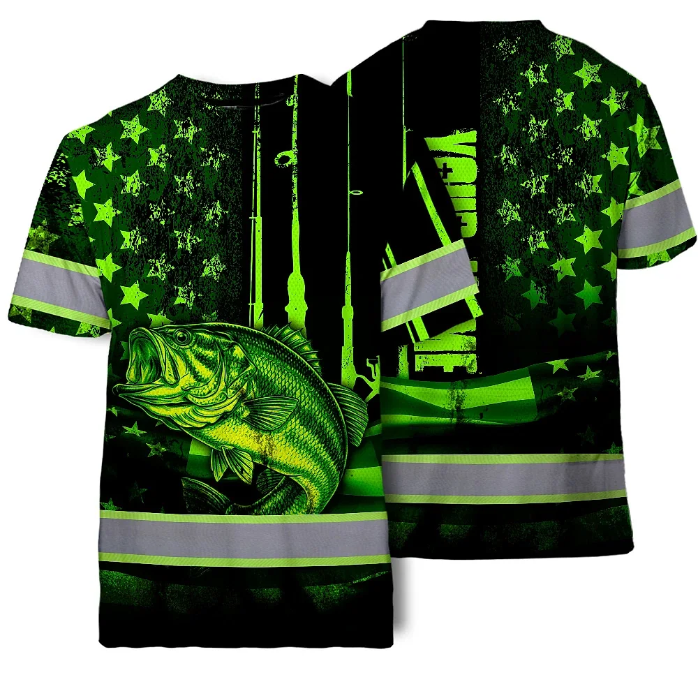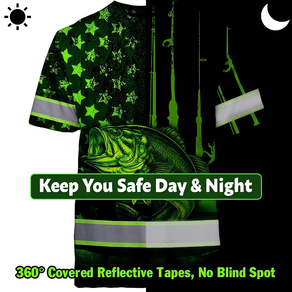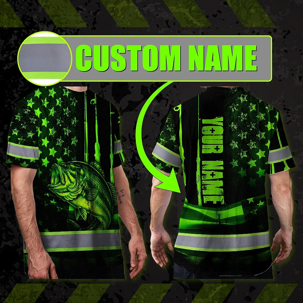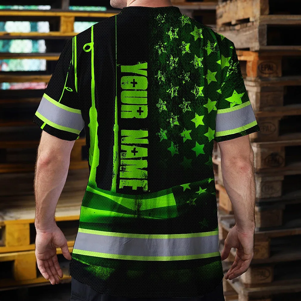 Hi Vis Shirt Reflective Fishing US Flag Custom Name Safety Workwear For Fishing Lovers Workers, Runners, Cyclists, Trucker, Operator, Patriotic