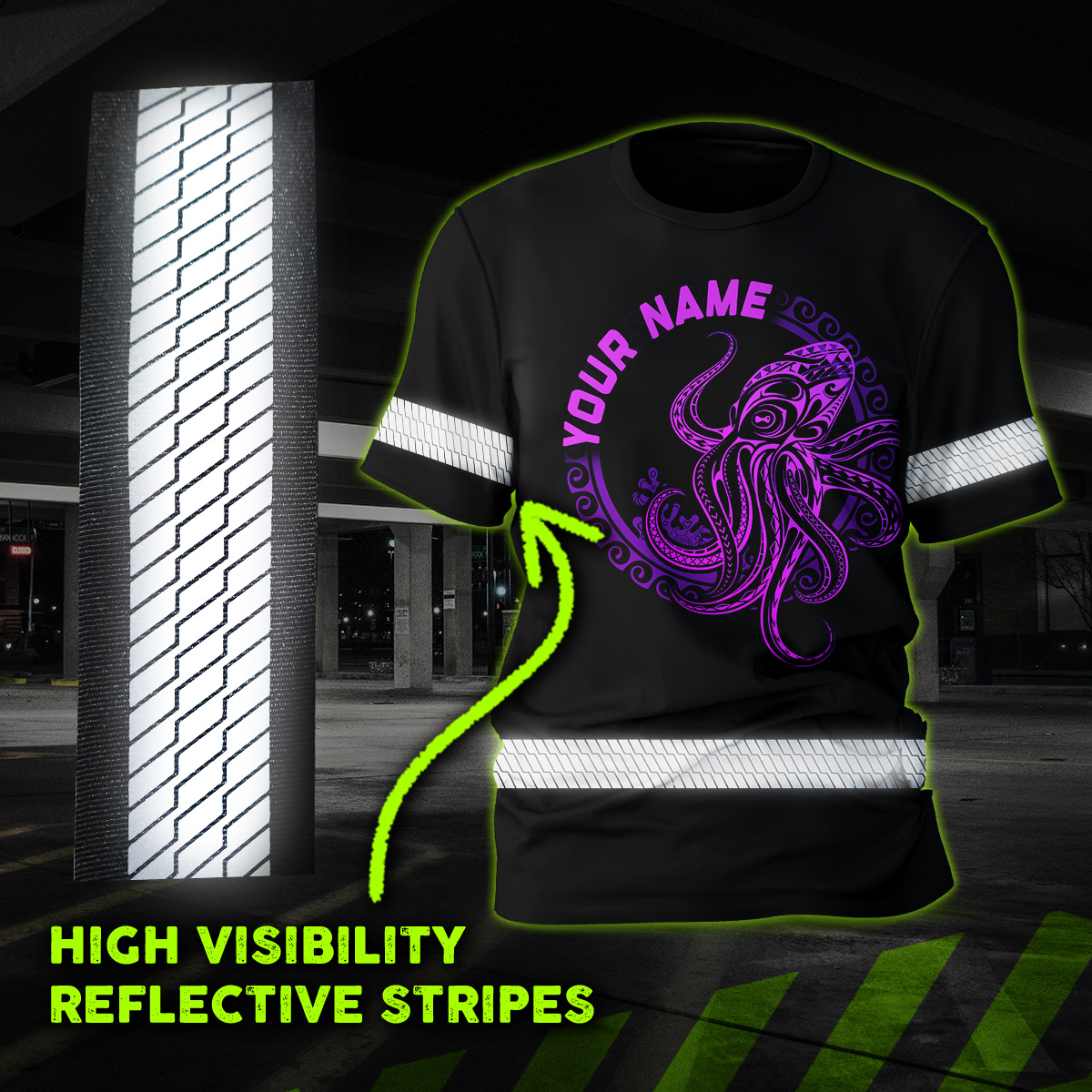Hi Vis Shirt Reflective Gradient Green Neon Polynesian Tribal Octopus Hawaiian Custom Name Safety Workwear