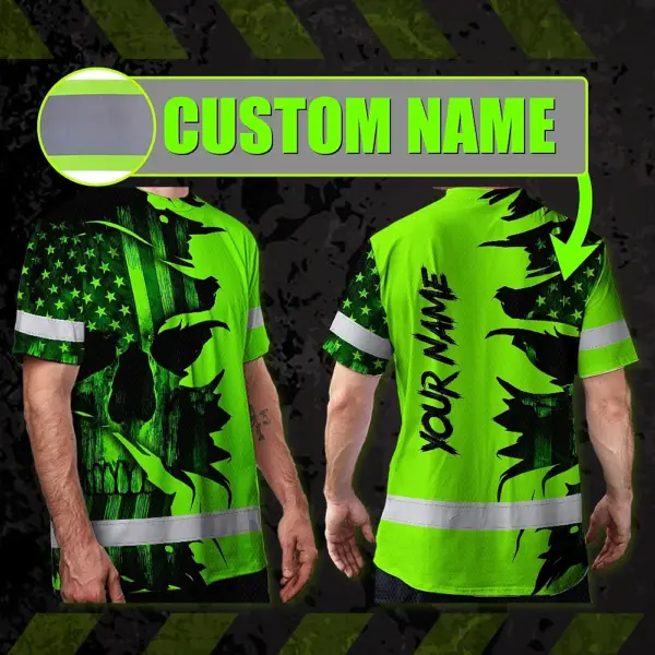 Hi Vis Shirt Reflective Green Neon Skull US Flag Scratch Custom Name Safety Workwear For Workers, Runners, Cyclists, Trucker, Operator, Patriotic