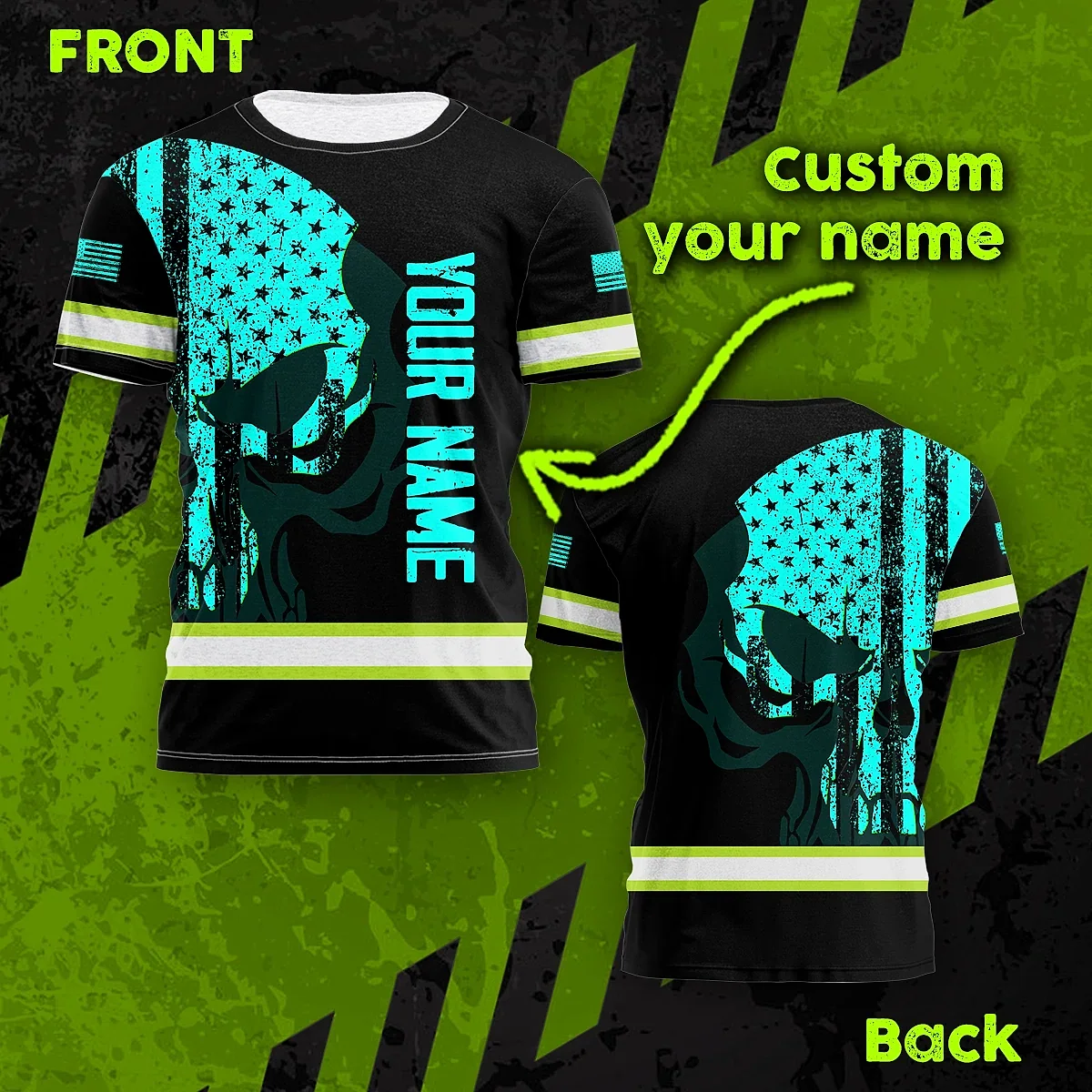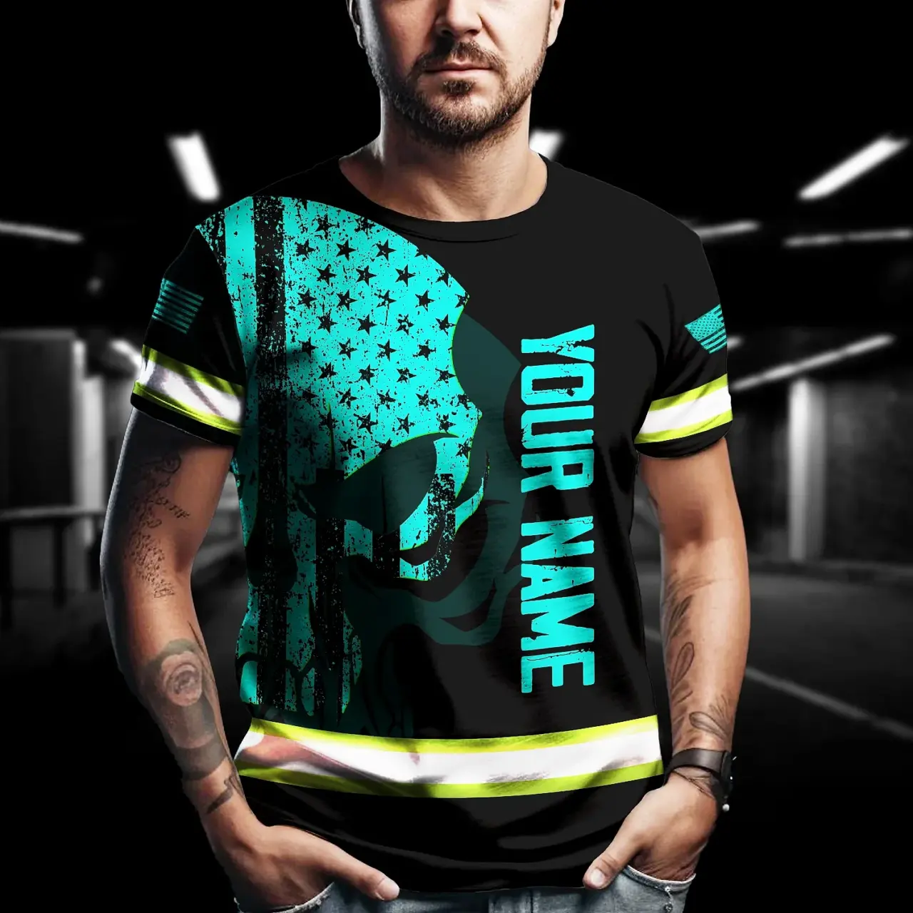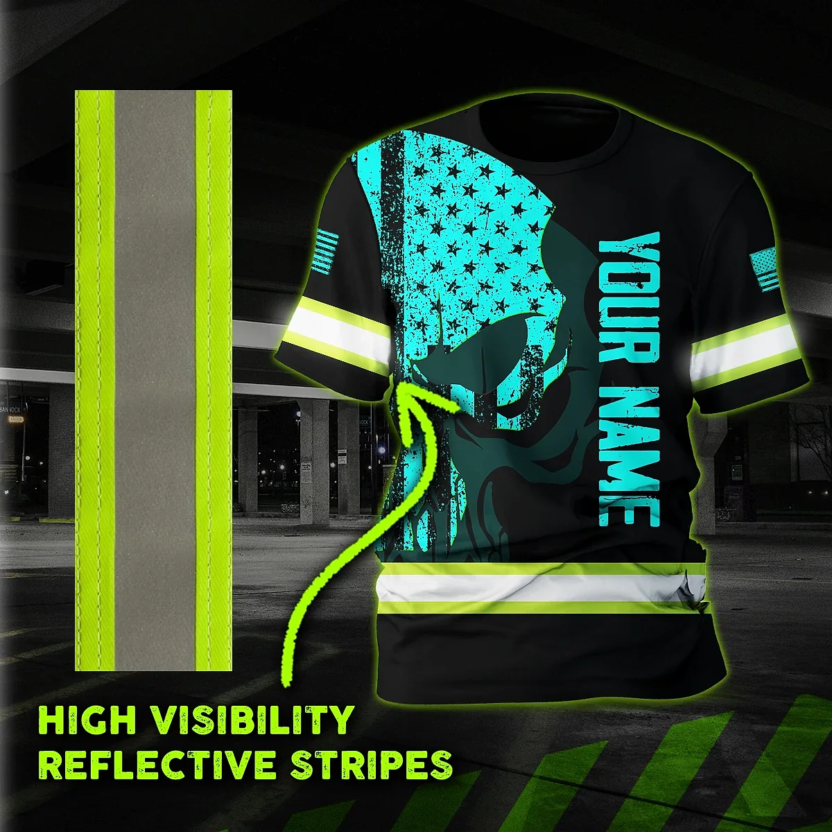 Hi Vis Shirt Reflective Mint Neon Skull US Flag Custom Name Safety Workwear For Workers, Truckers, Operators