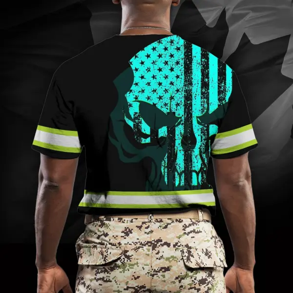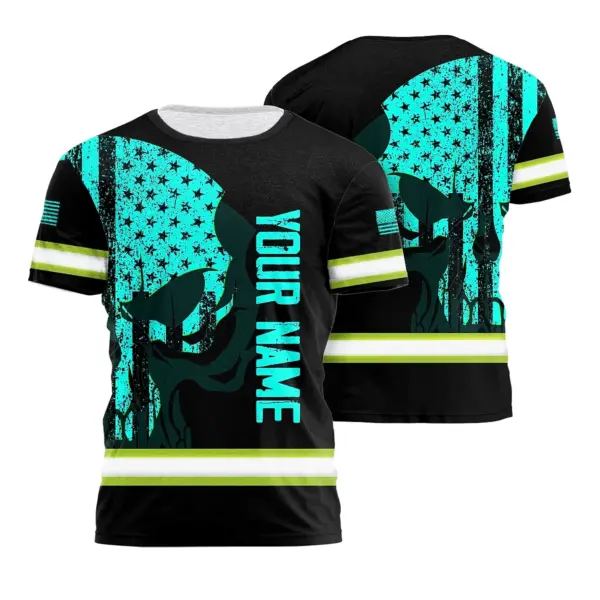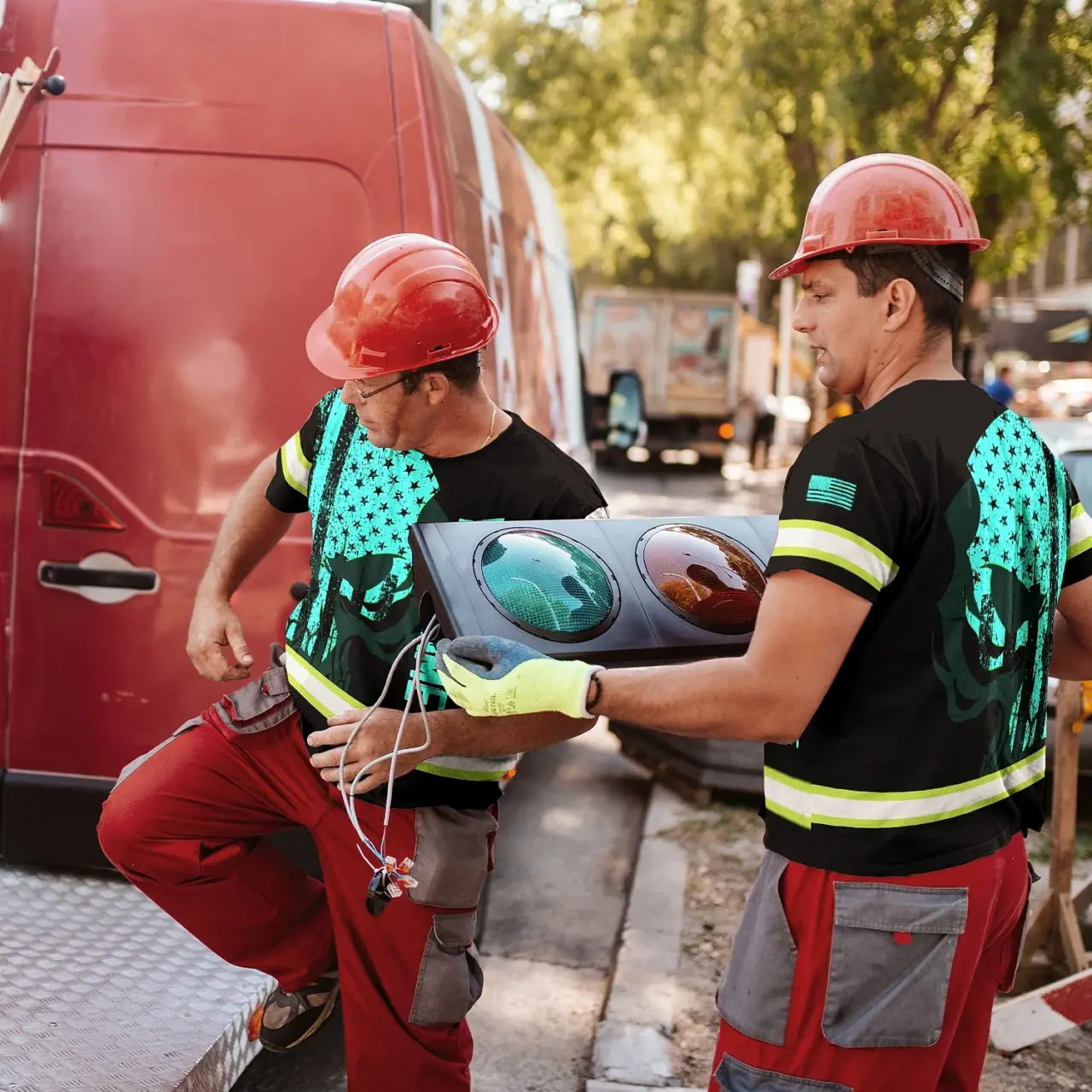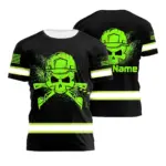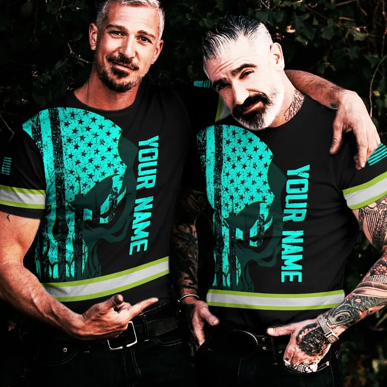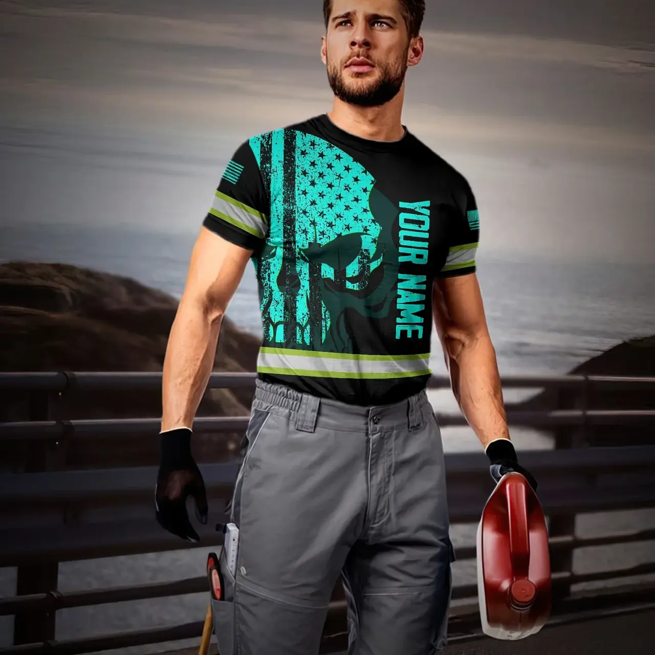 Hi Vis Shirt Reflective Mint Neon Skull US Flag Custom Name Safety Workwear For Workers, Truckers, Operators