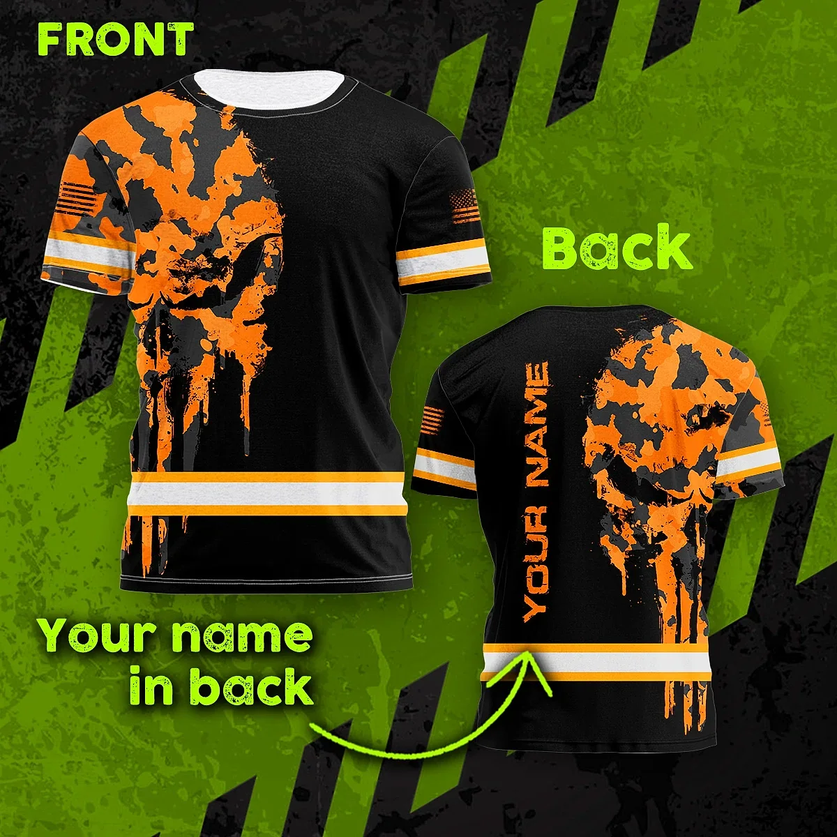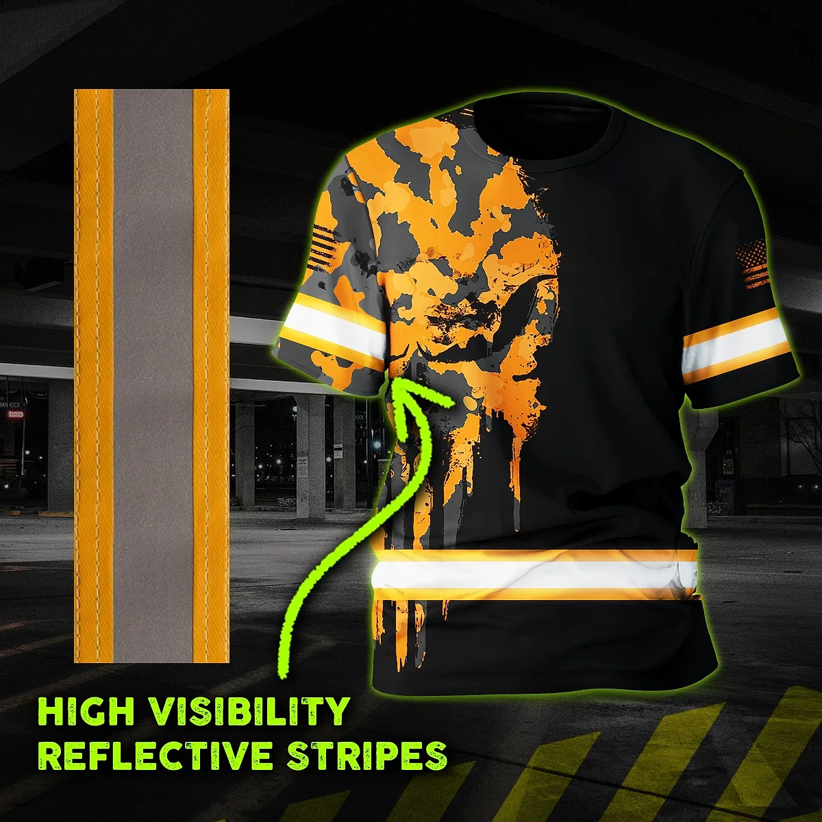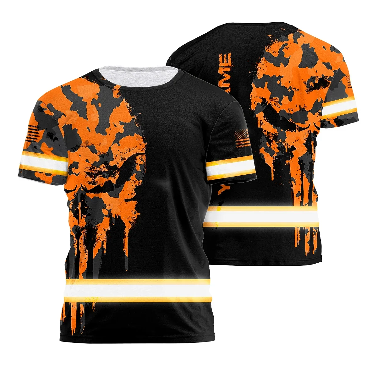 Hi Vis Shirt Reflective Orange Black Camo Neon Skull US Flag Custom Name Safety Workwear For Workers, Truckers, Operators