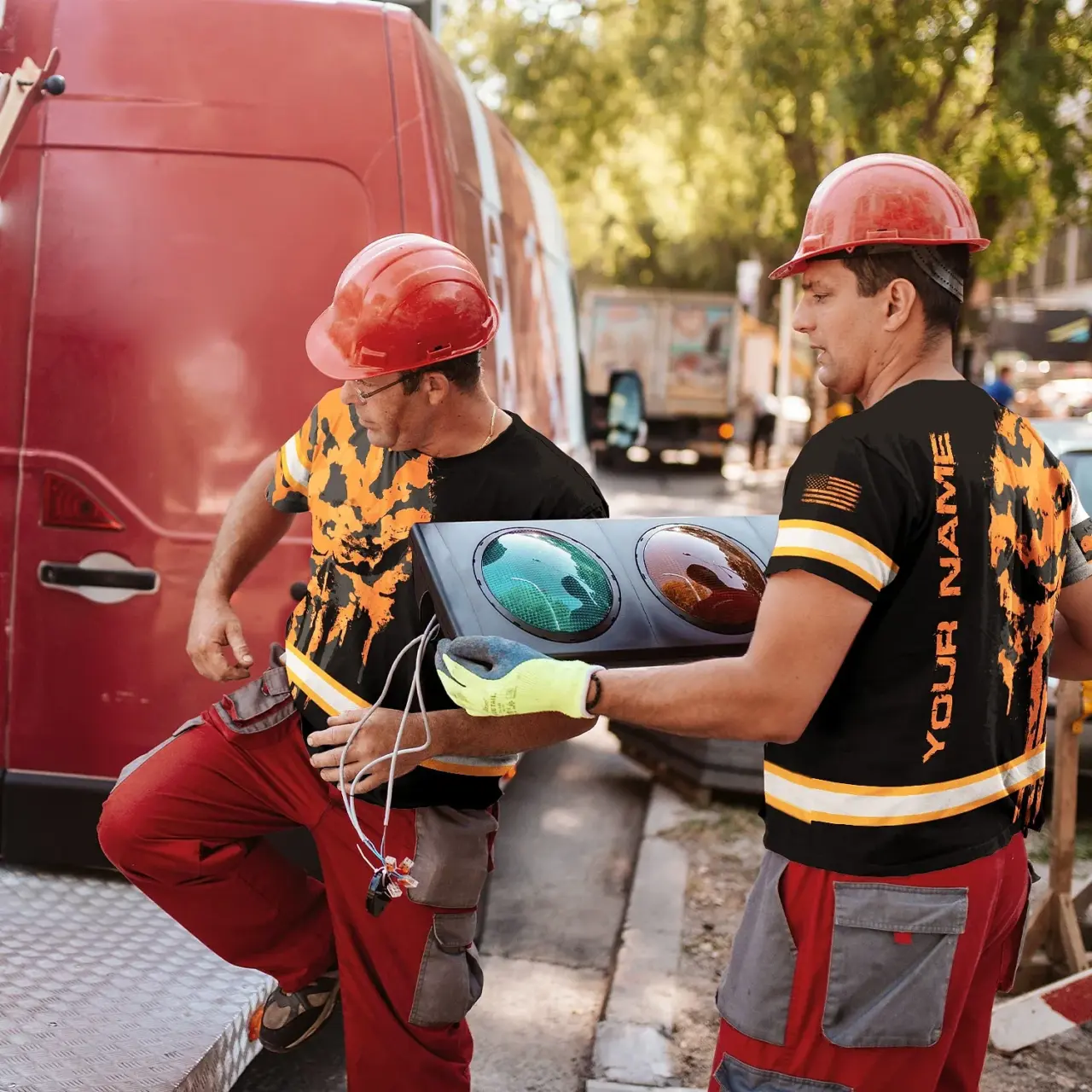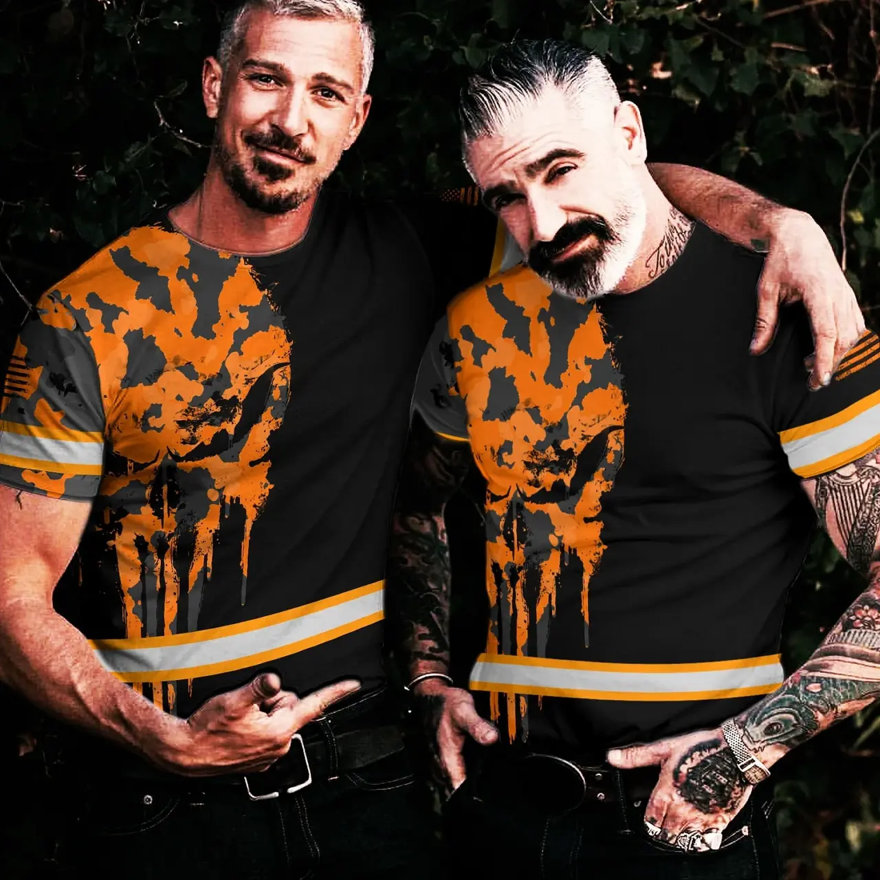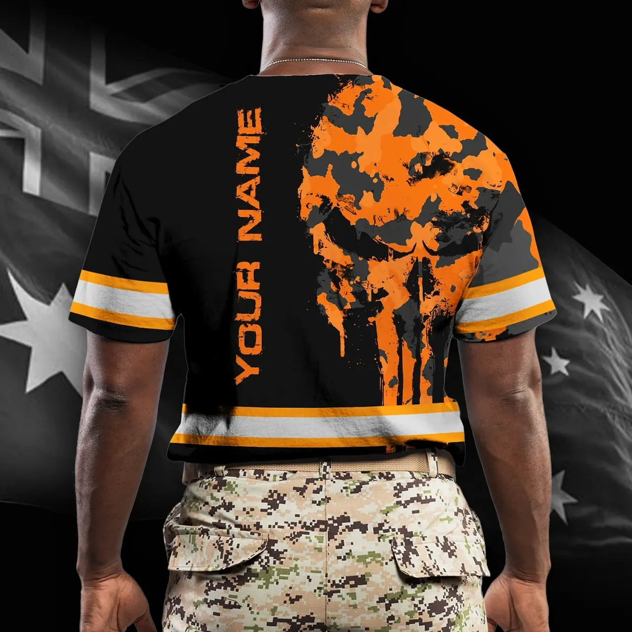 Hi Vis Shirt Reflective Orange Black Camo Neon Skull US Flag Custom Name Safety Workwear For Workers, Truckers, Operators