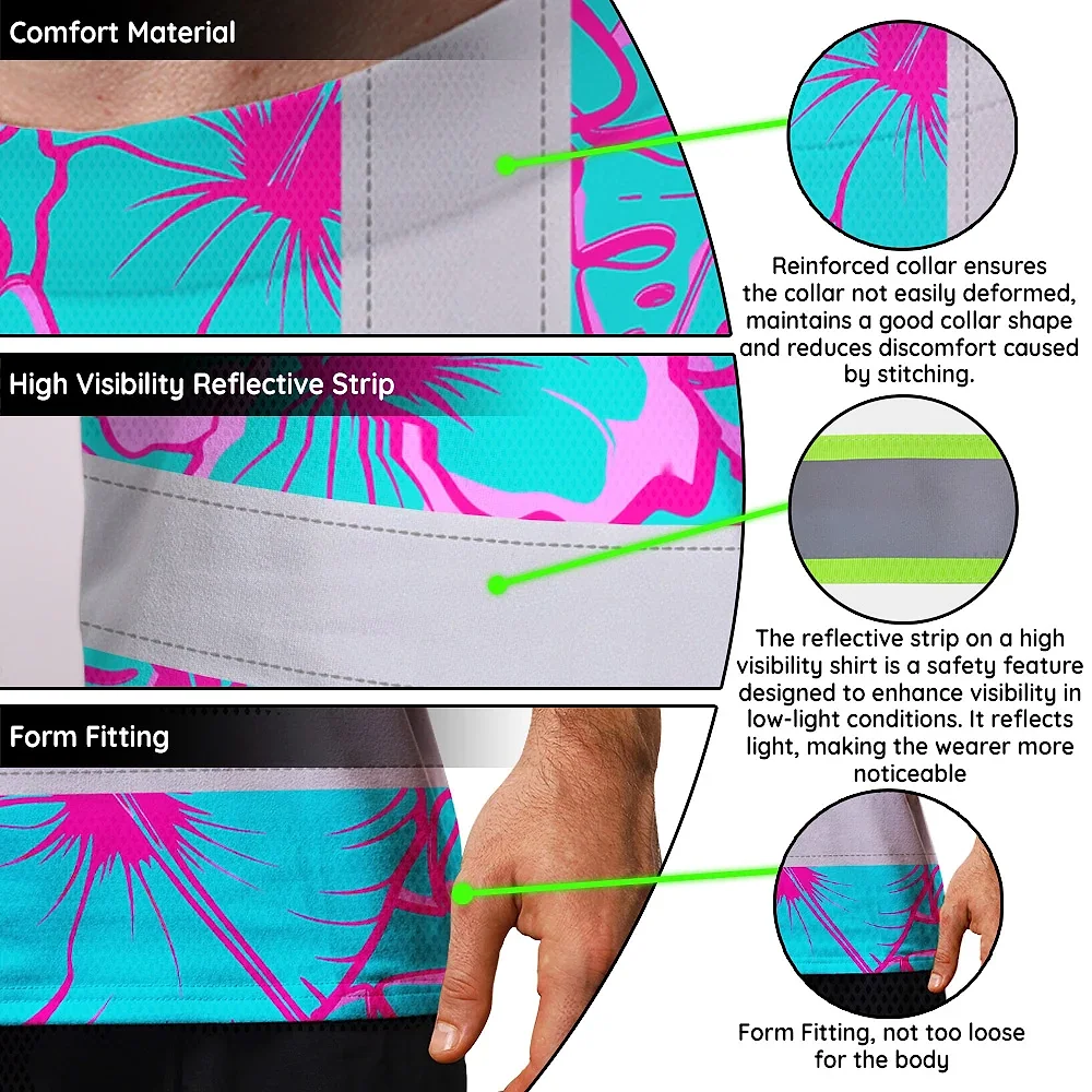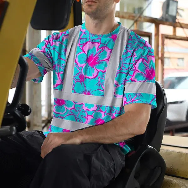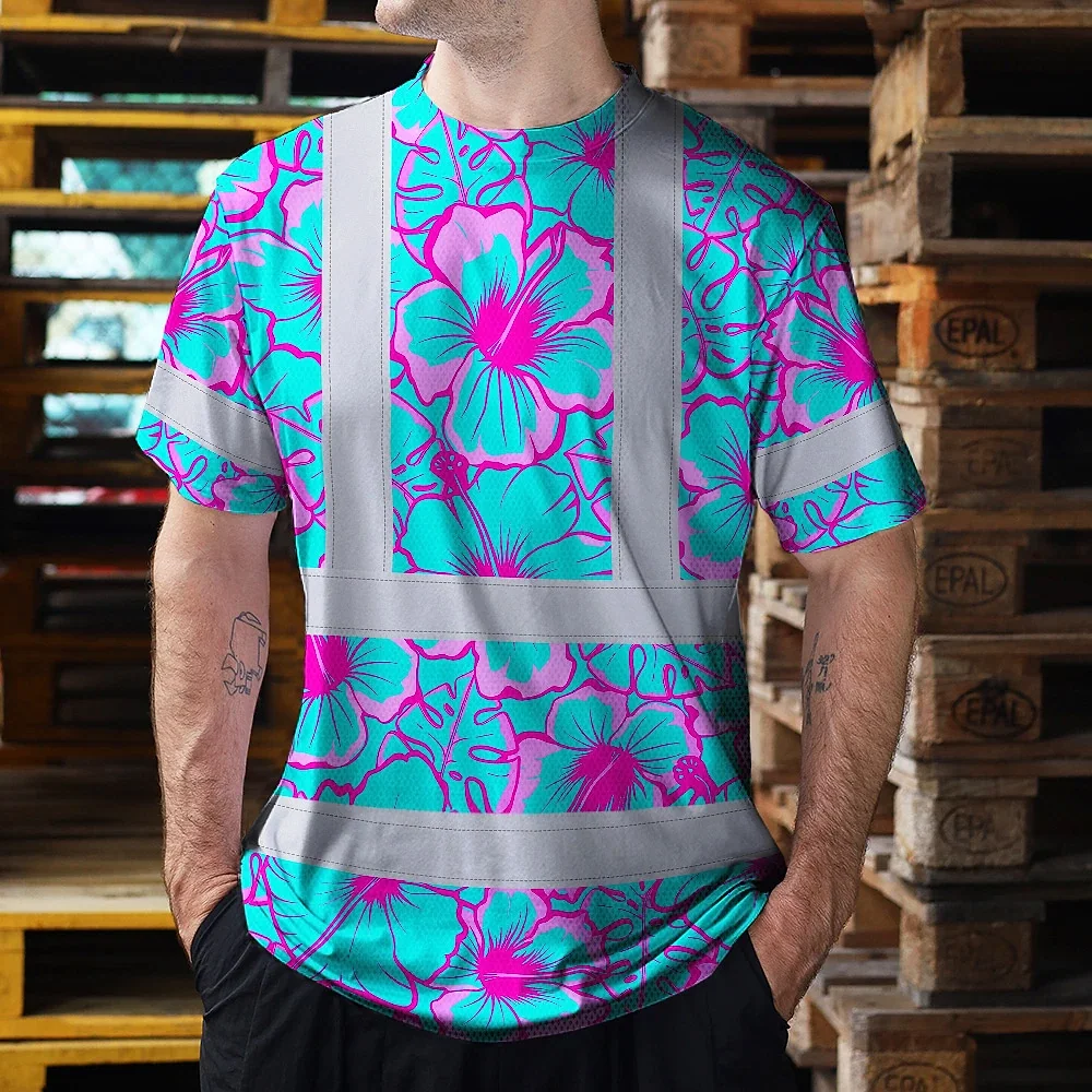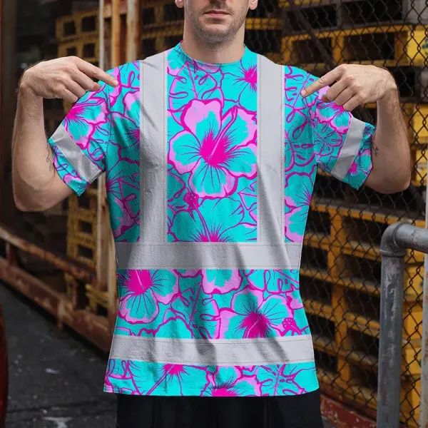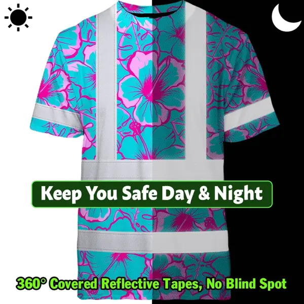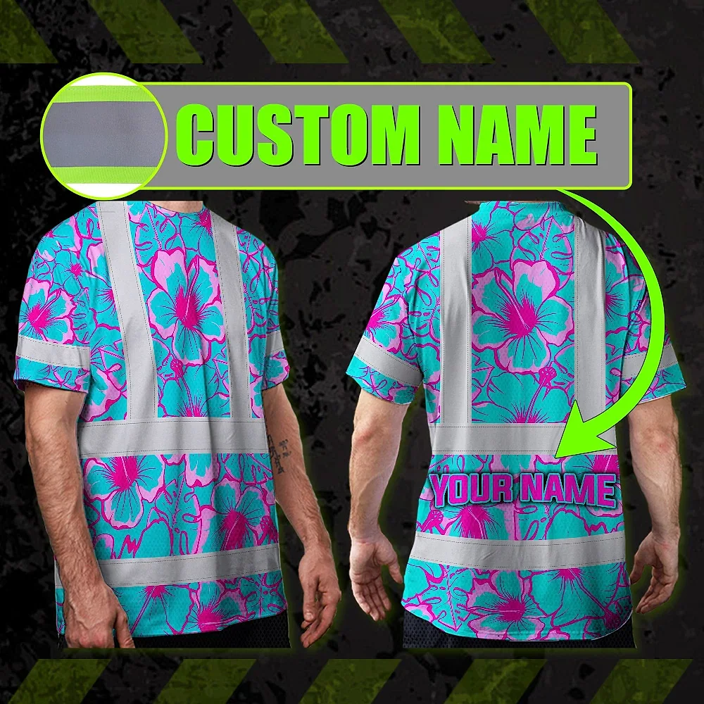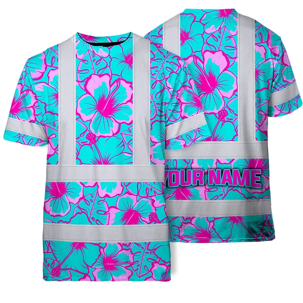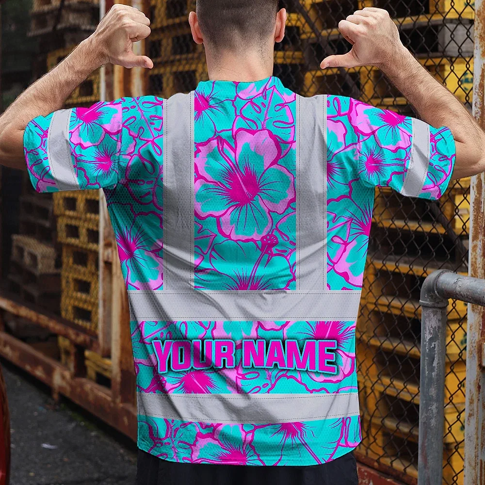 Hi Vis Shirt Reflective Tapes Blue Neon And Pink Flowers Custom Name Safety Workwear For Workers, Truckers, Operators