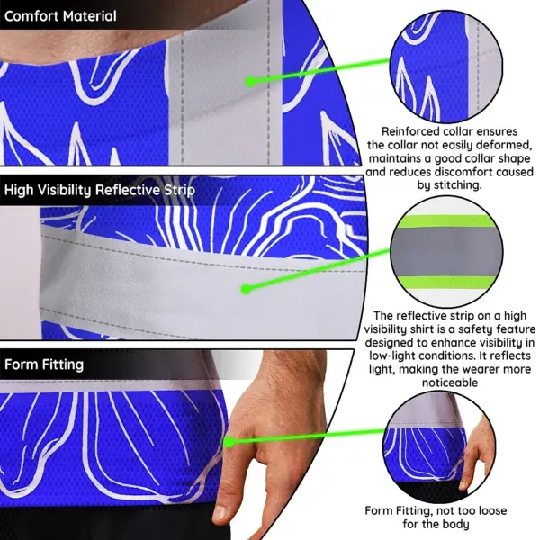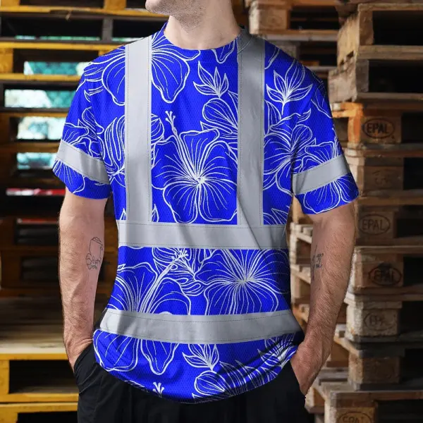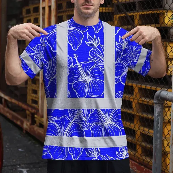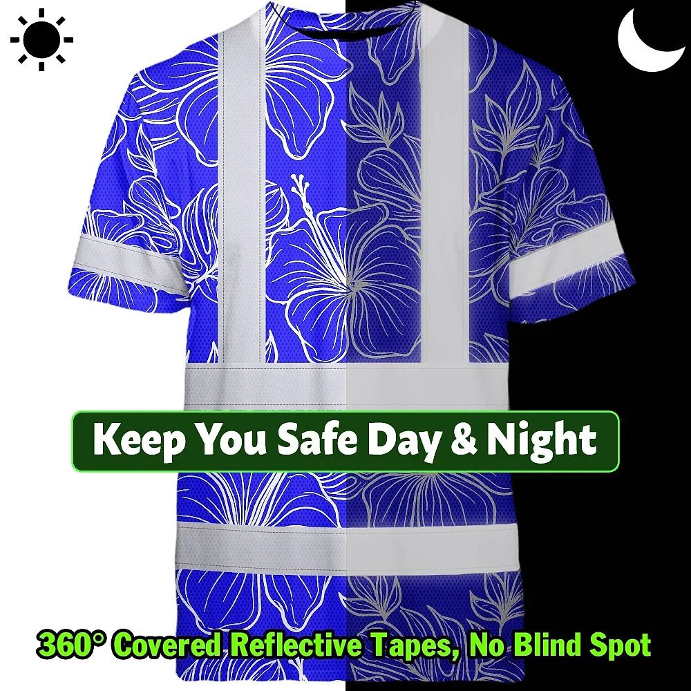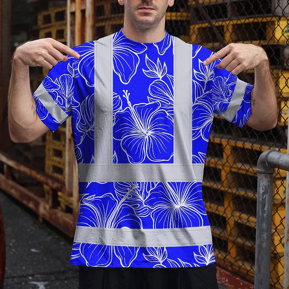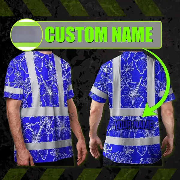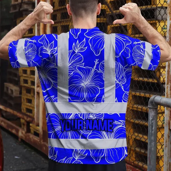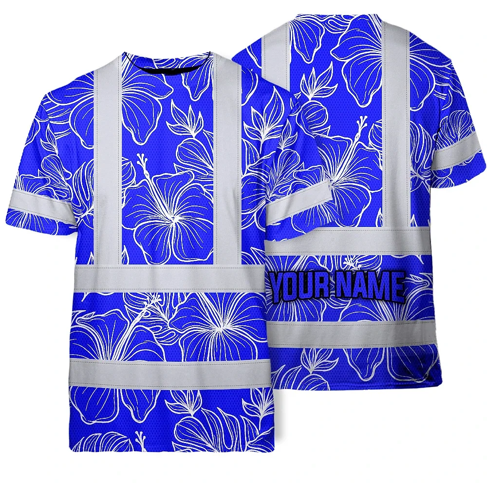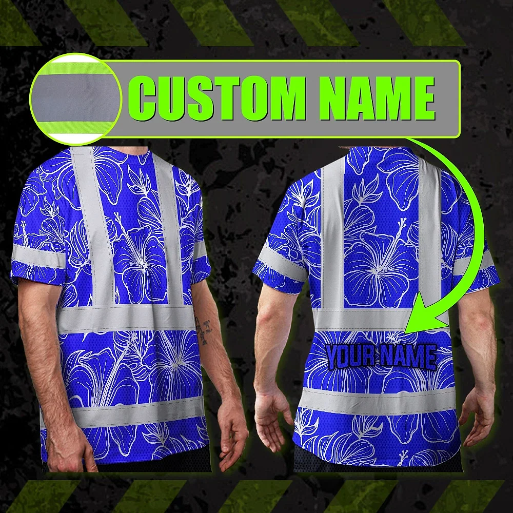 Hi Vis Shirt Reflective Tapes Blue Neon Flowers Custom Name Safety Workwear For Workers, Truckers, Operators
