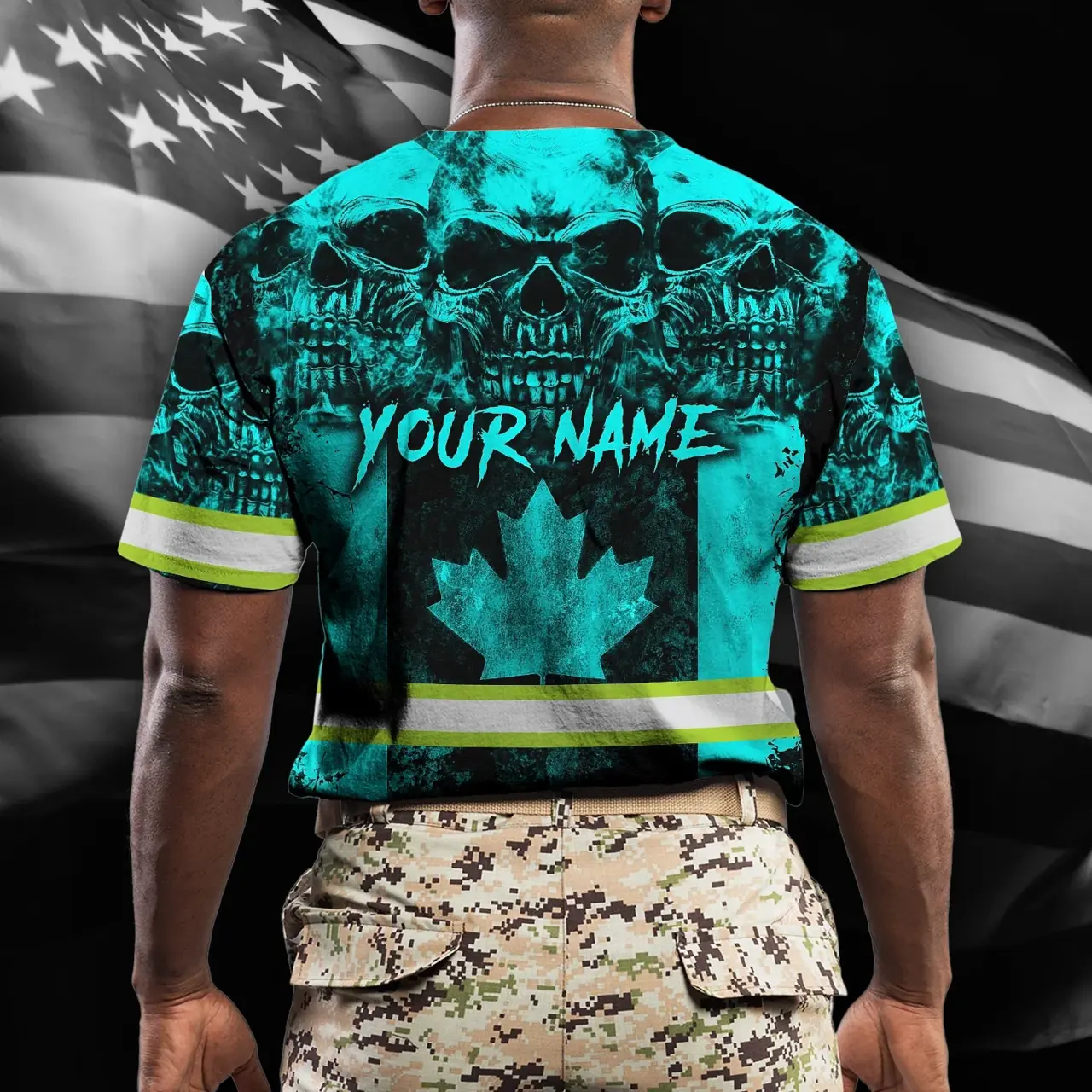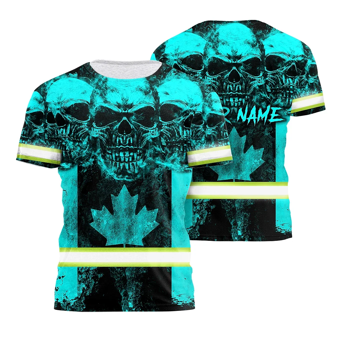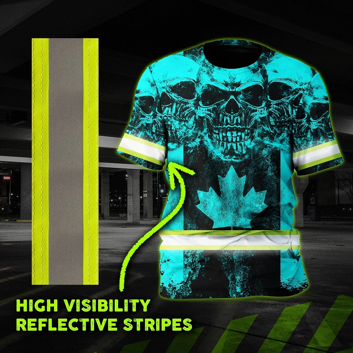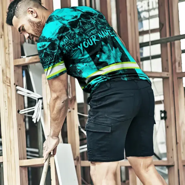 Hi Vis Shirt Reflective Tapes Blue Neon Skull Canada Flag Custom Name Safety Workwear For Worker, Operator, Patriotic