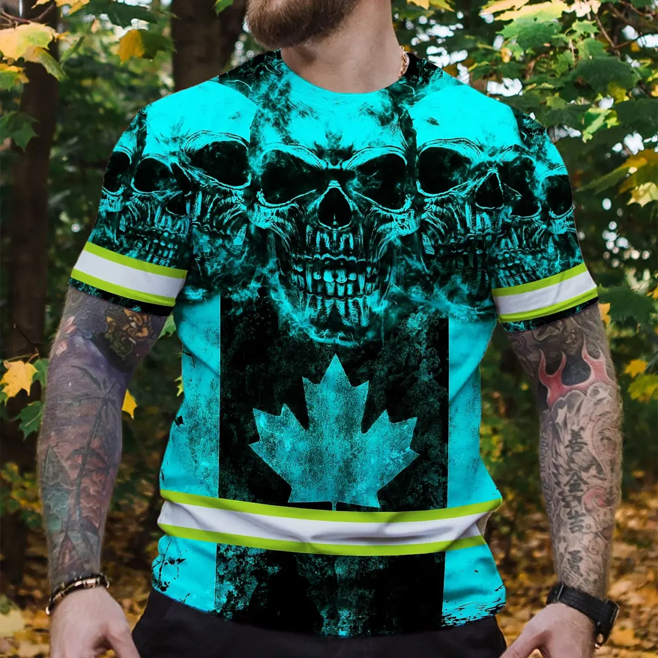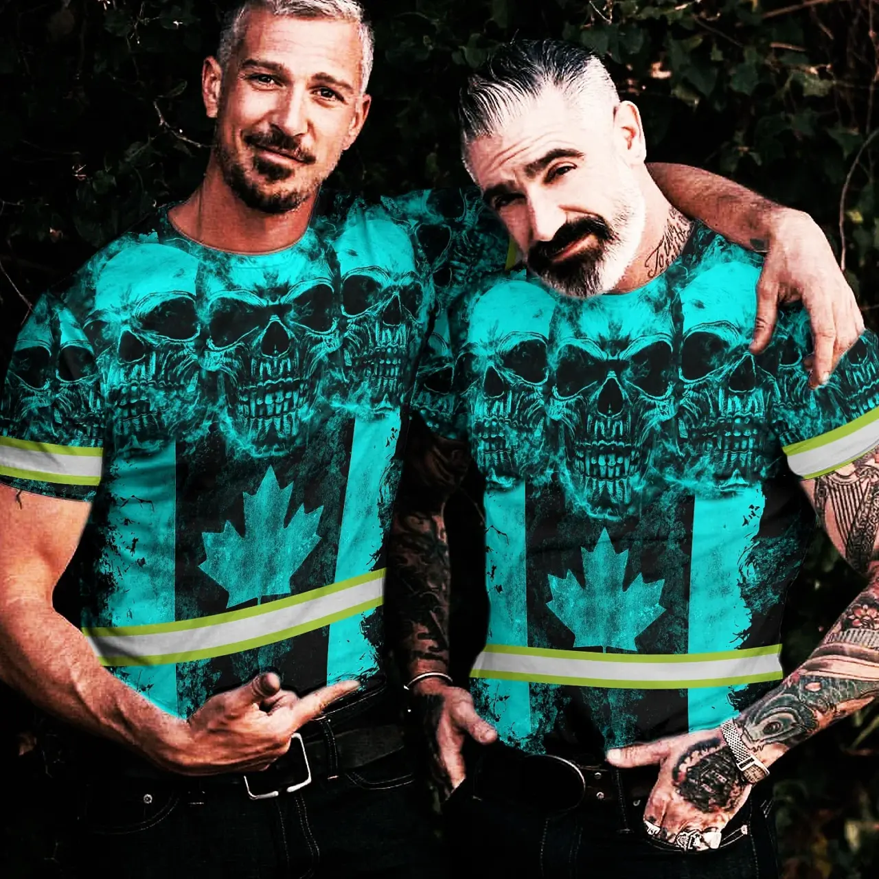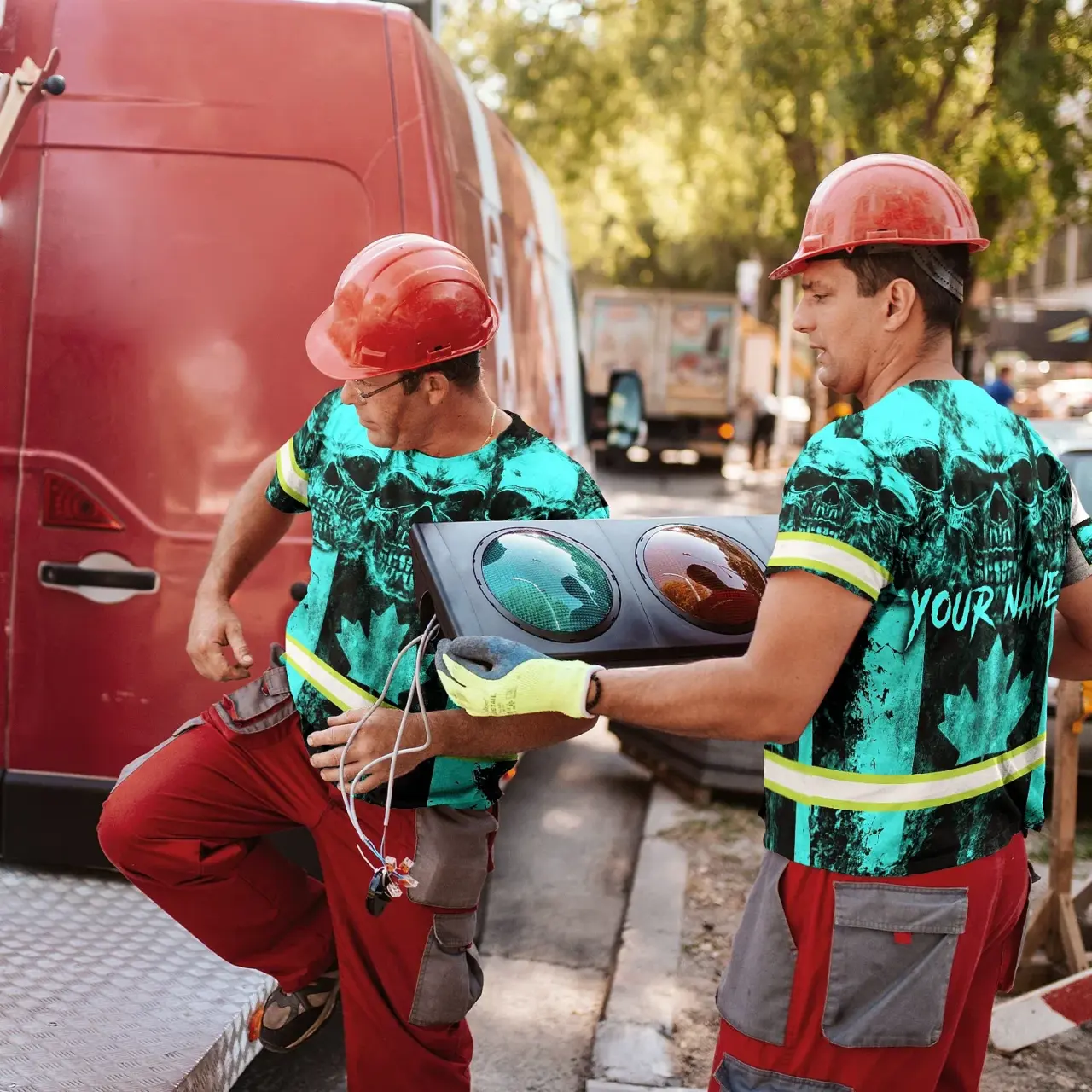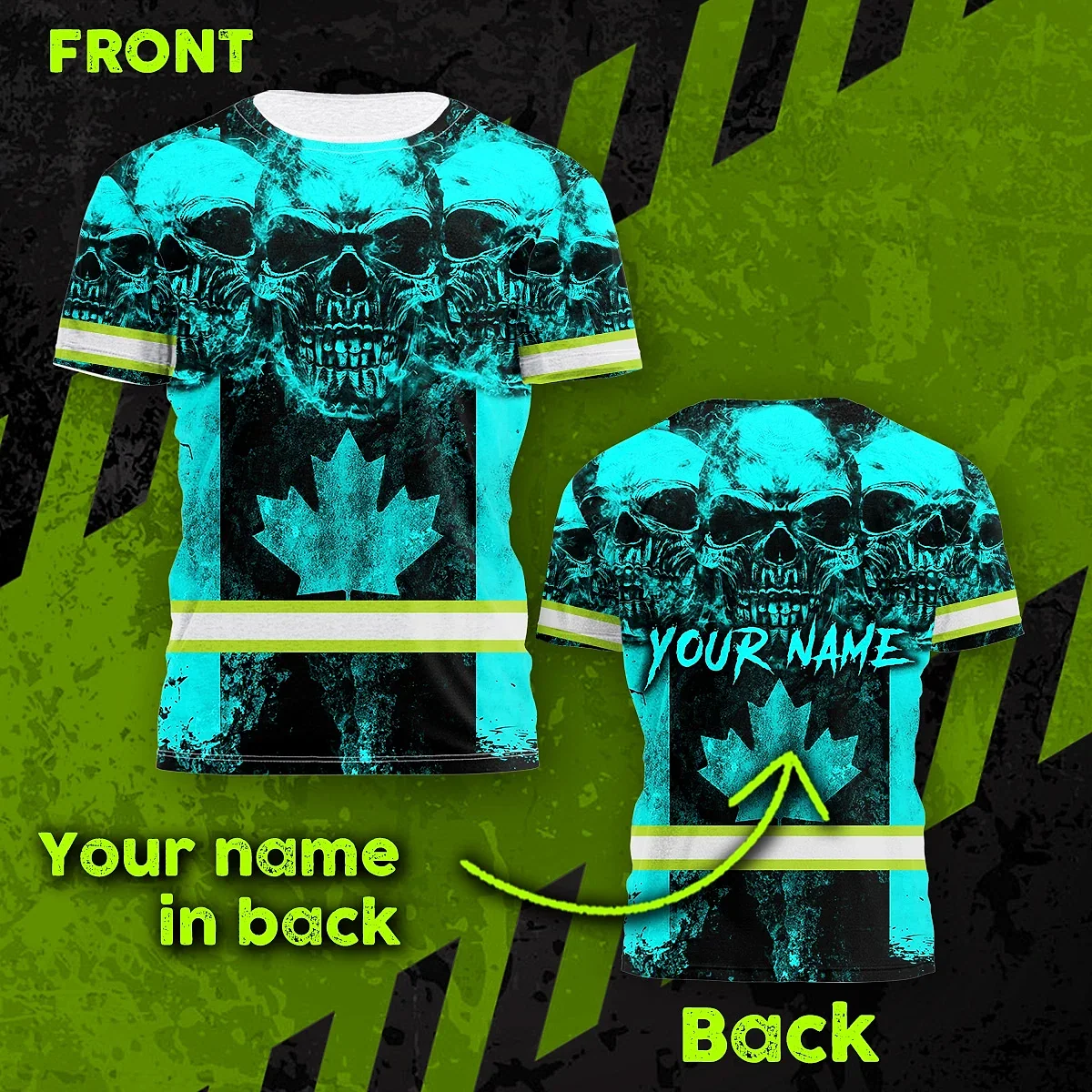 Hi Vis Shirt Reflective Tapes Blue Neon Skull Canada Flag Custom Name Safety Workwear For Worker, Operator, Patriotic