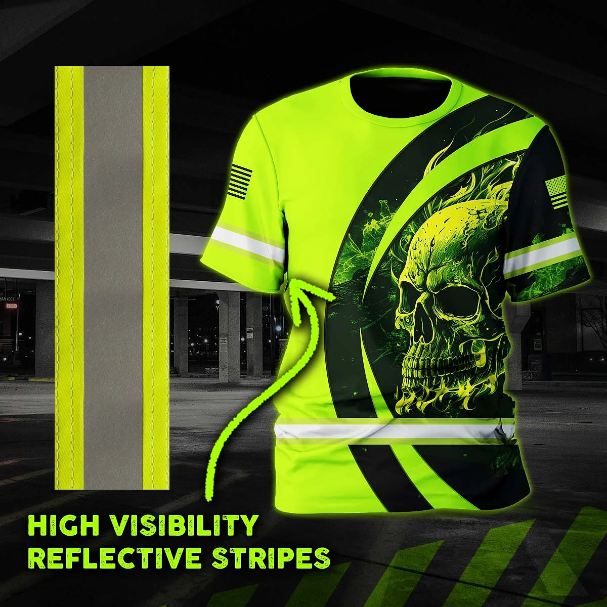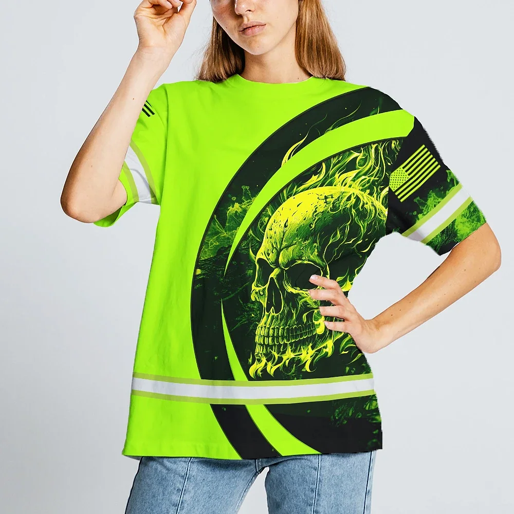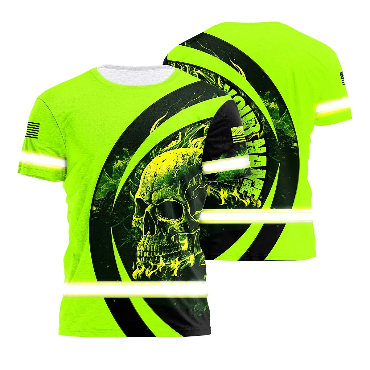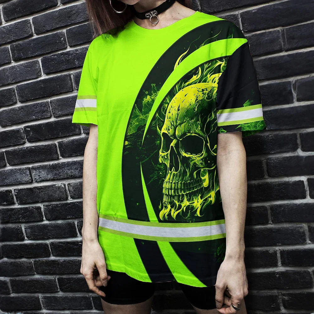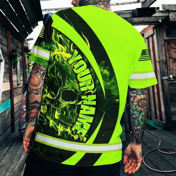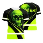 Hi Vis Shirt Reflective Tapes Blue Neon Skull Fire Custom Name Safety Workwear For Workers, Runners, Skull Lover