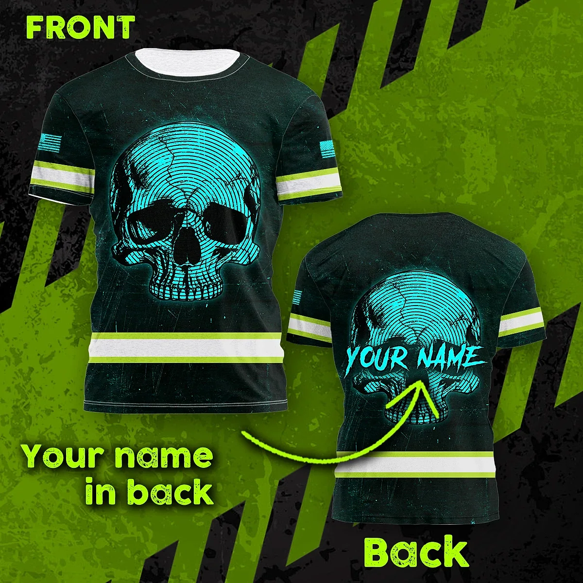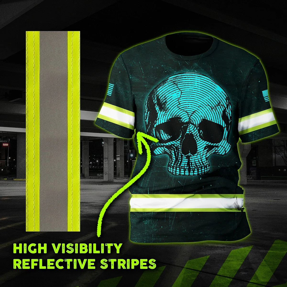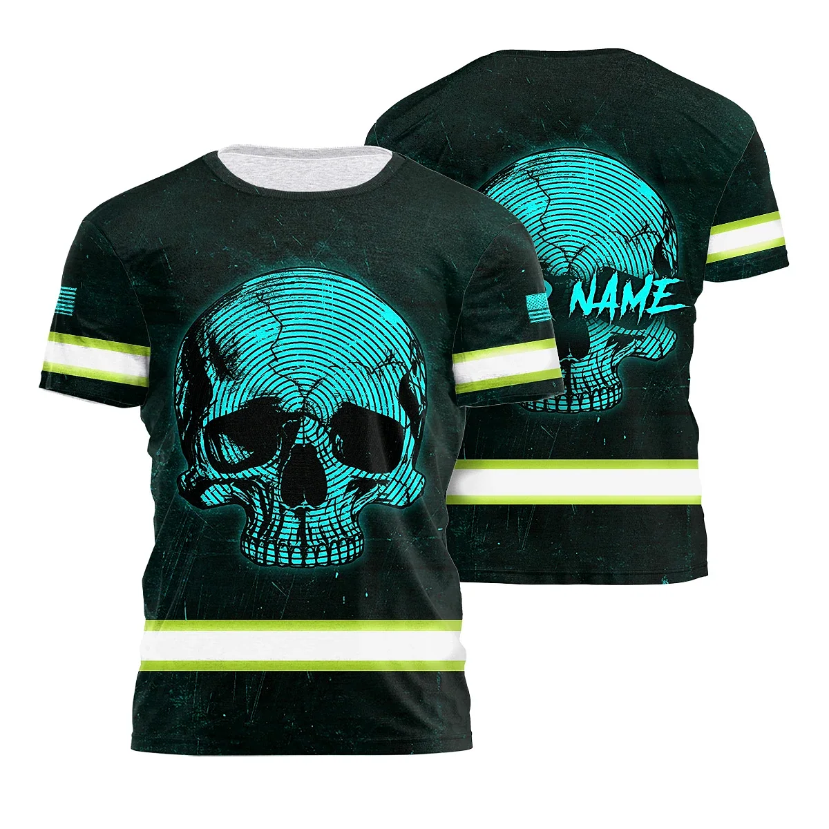Hi Vis Shirt Reflective Tapes Blue Neon Skull US Flag Custom Name Safety Workwear For Workers, Runners, Skull Lover