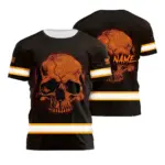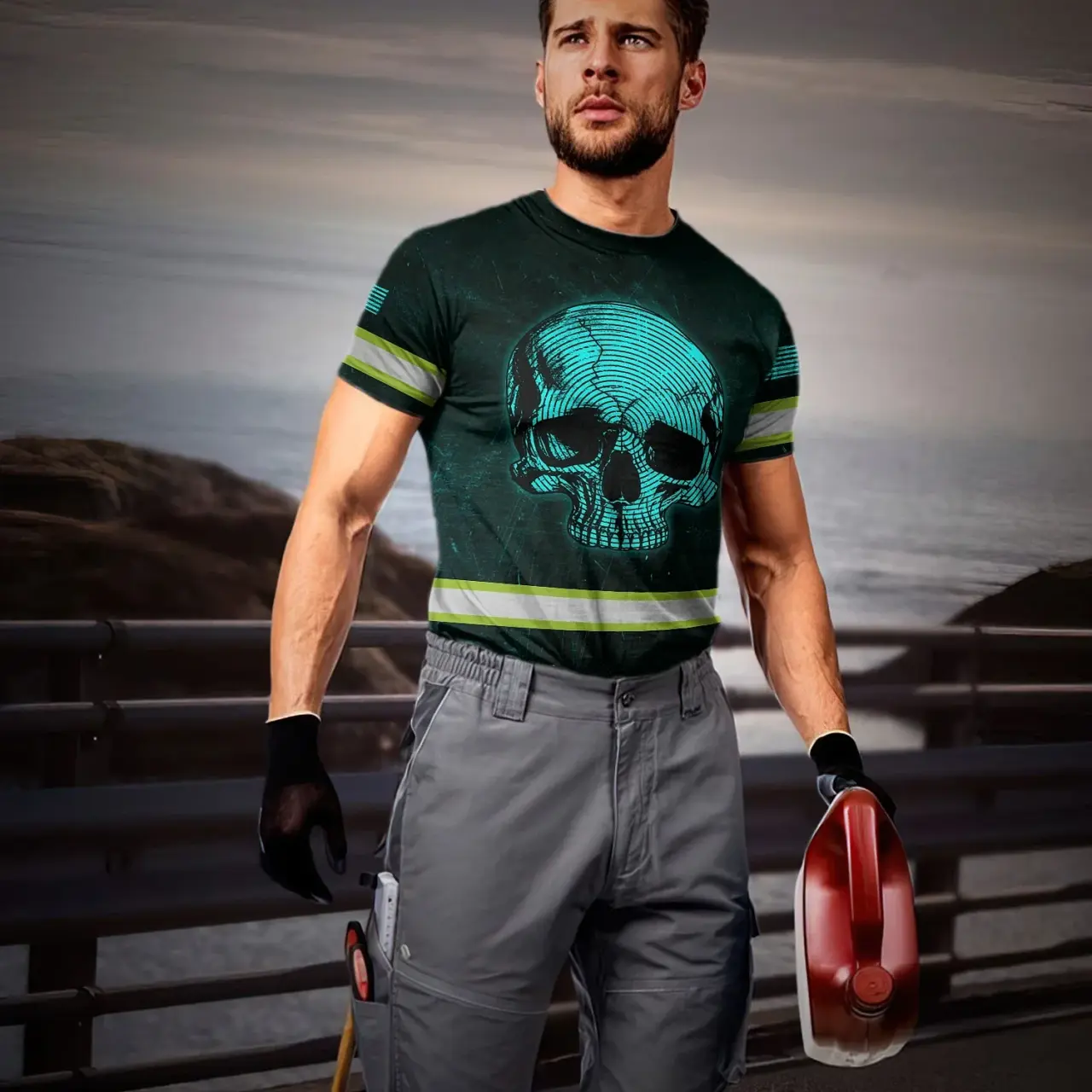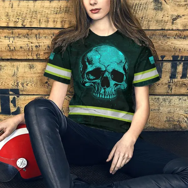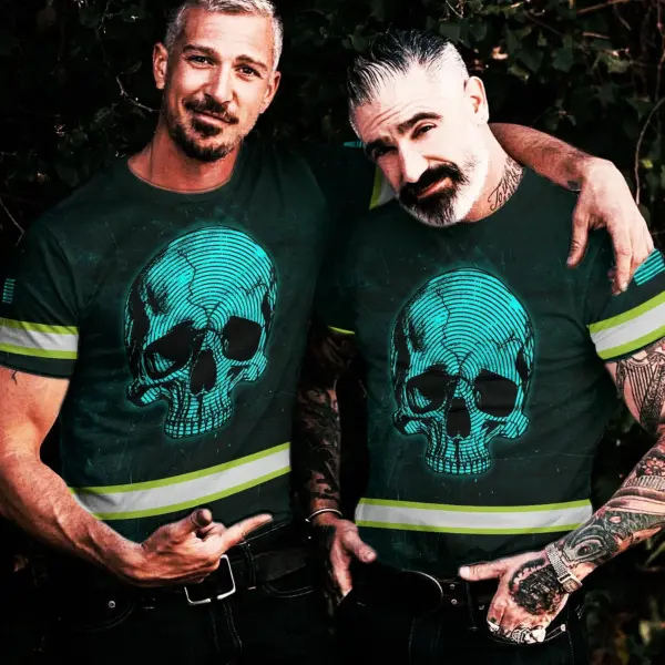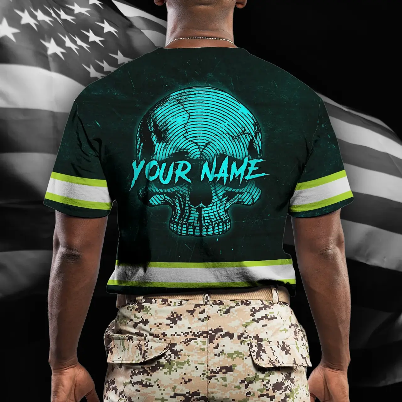 Hi Vis Shirt Reflective Tapes Blue Neon Skull US Flag Custom Name Safety Workwear For Workers, Runners, Skull Lover