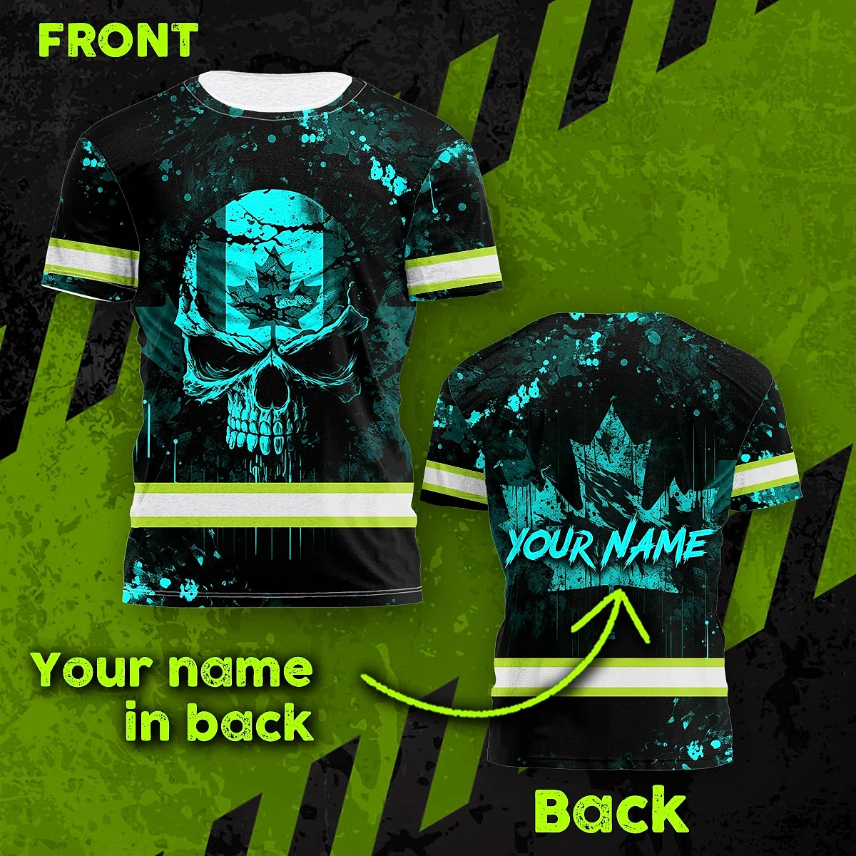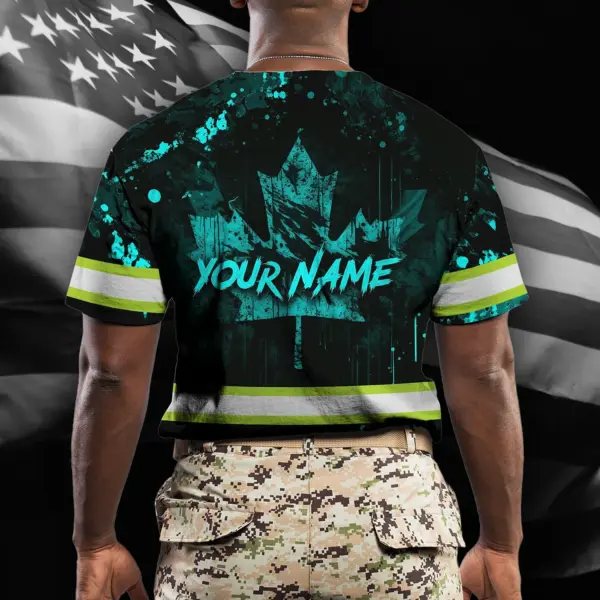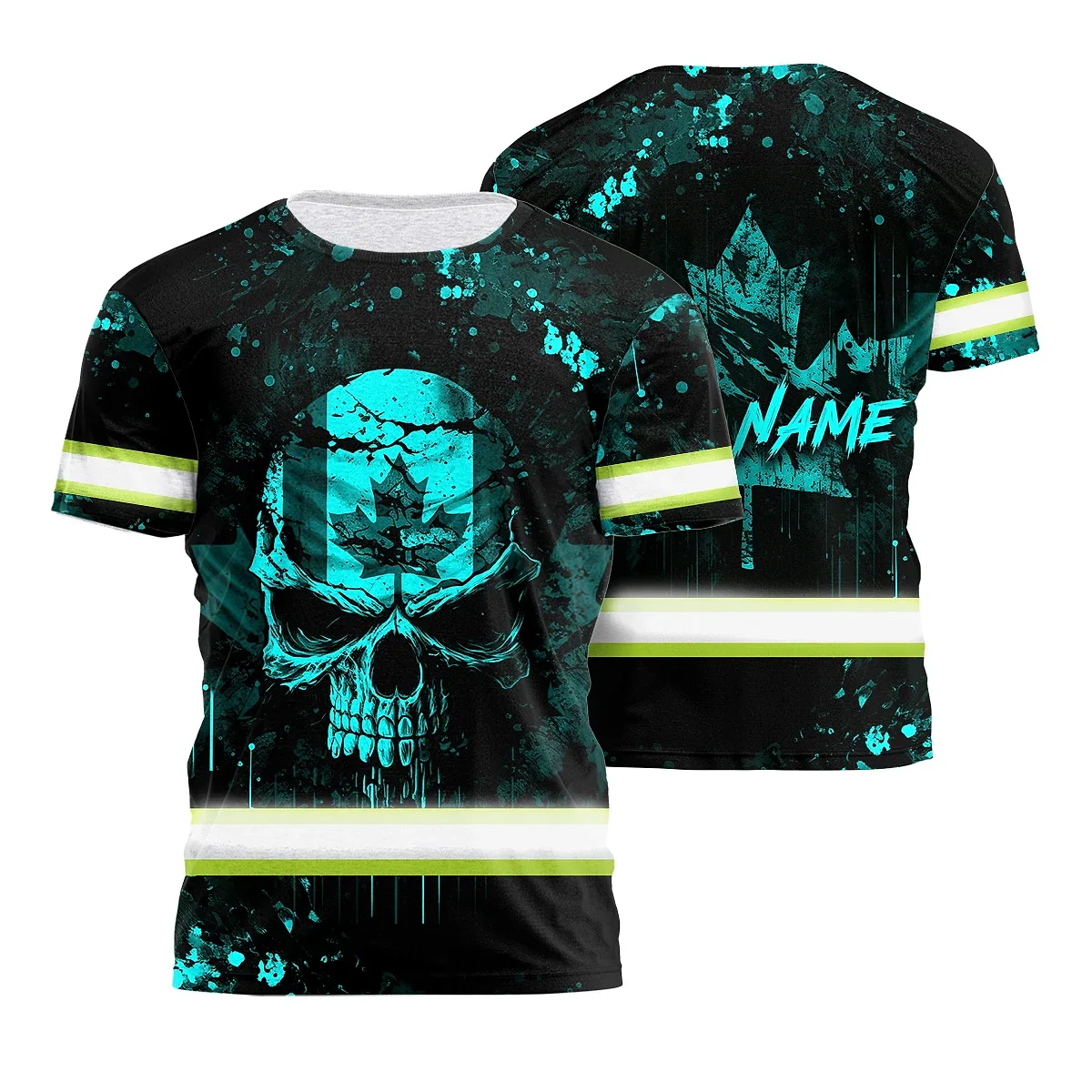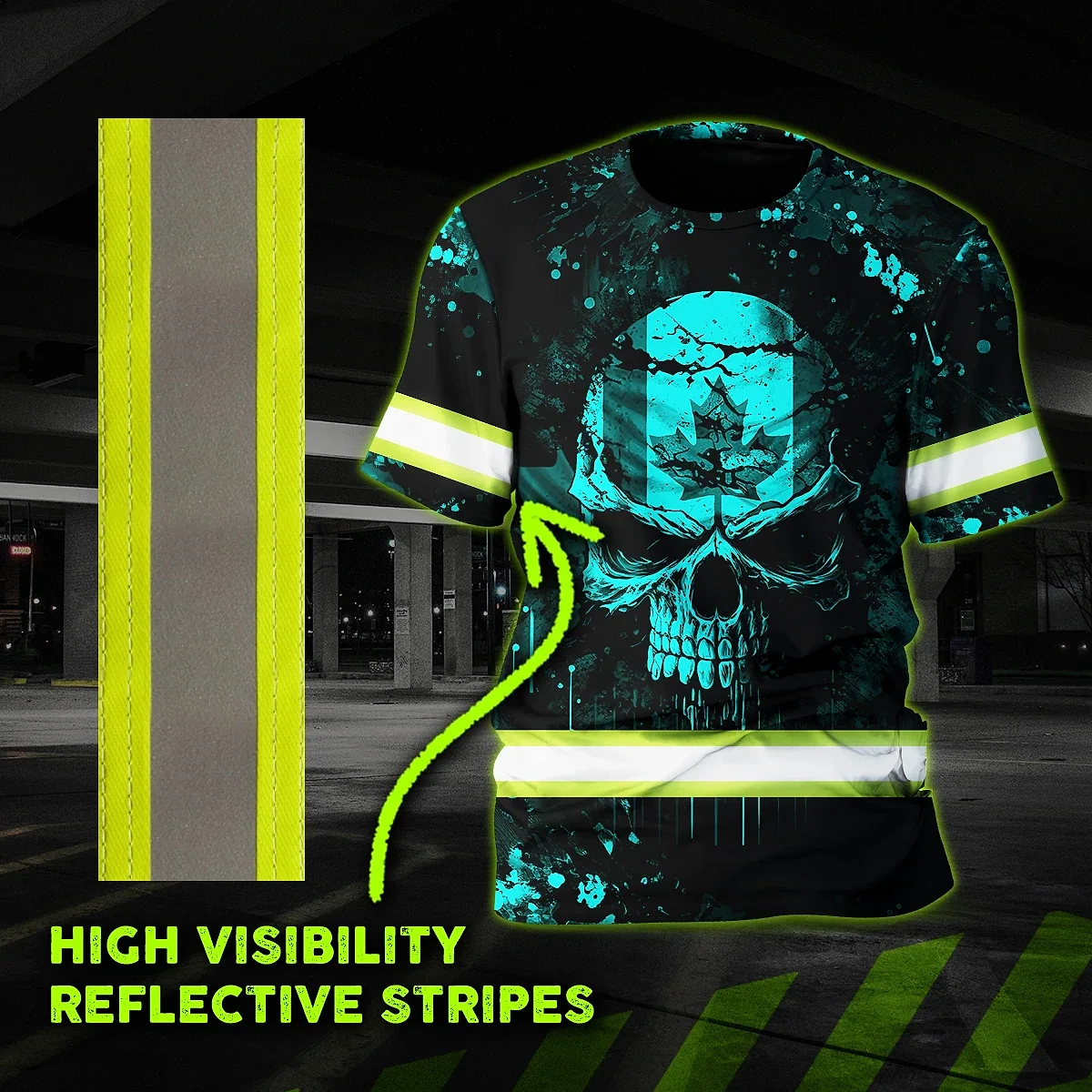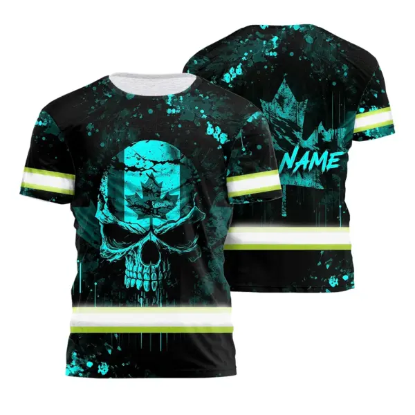 Hi Vis Shirt Reflective Tapes Blue Neon Skull With Canada Flag Custom Name Safety Workwear For Worker, Operator, Patriotic
