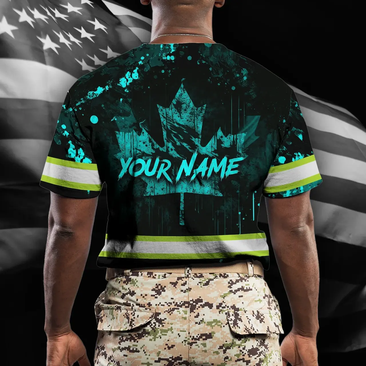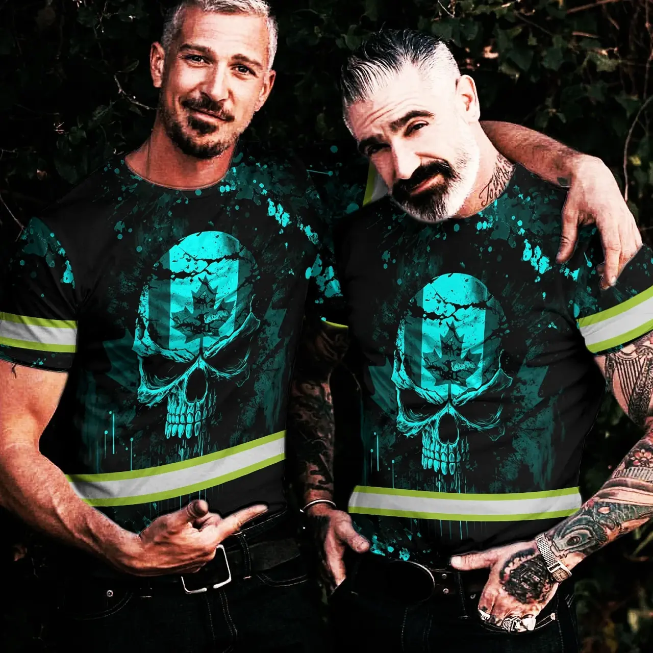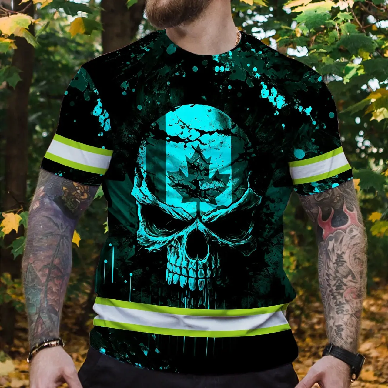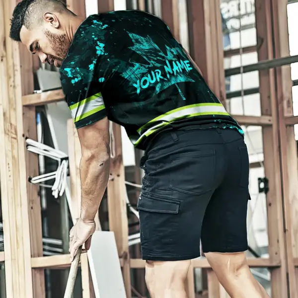 Hi Vis Shirt Reflective Tapes Blue Neon Skull With Canada Flag Custom Name Safety Workwear For Worker, Operator, Patriotic