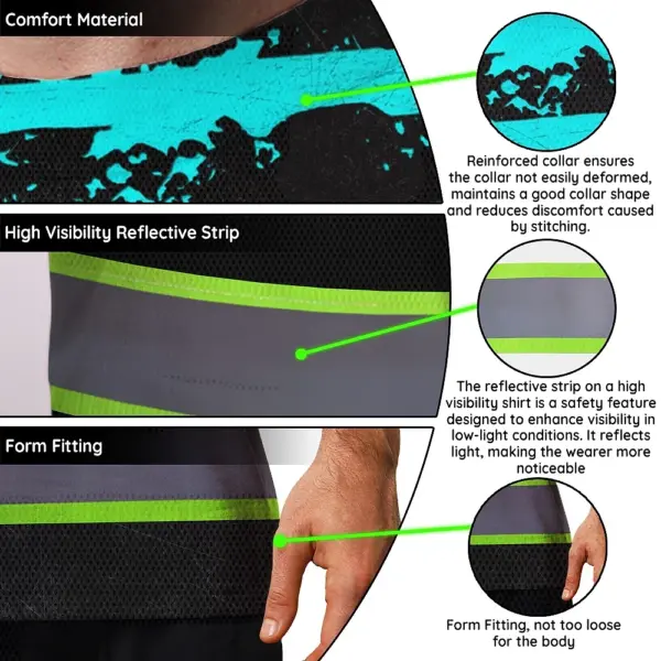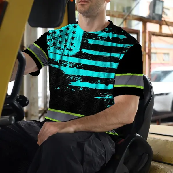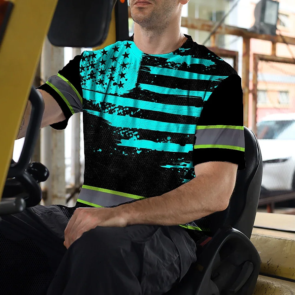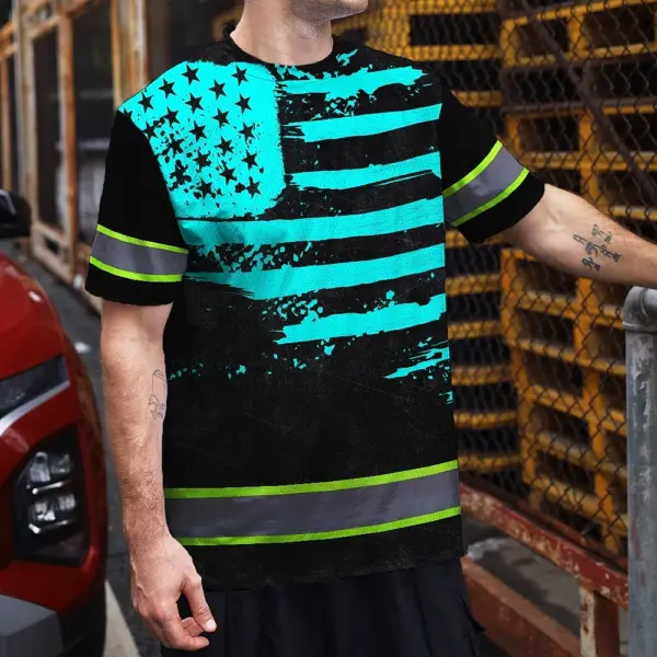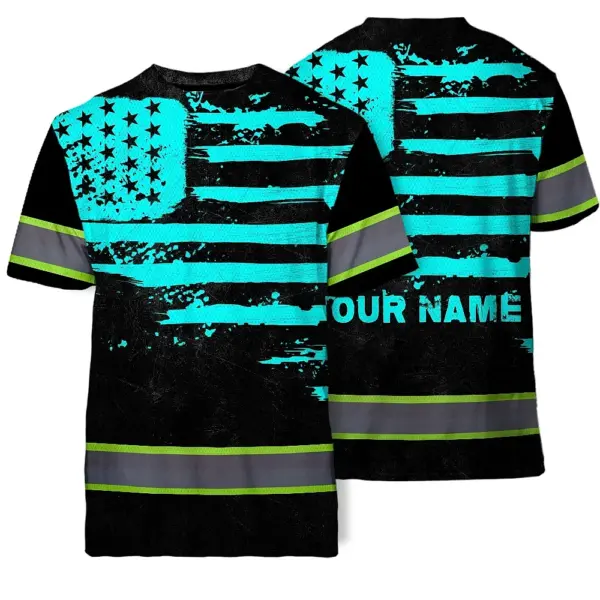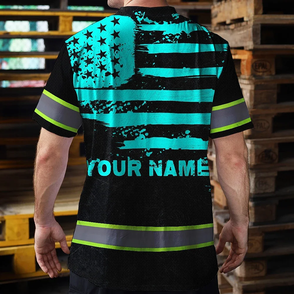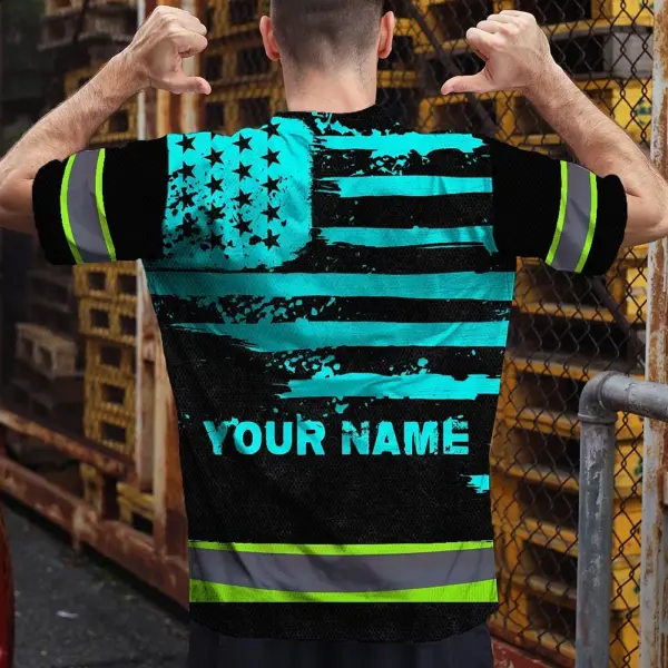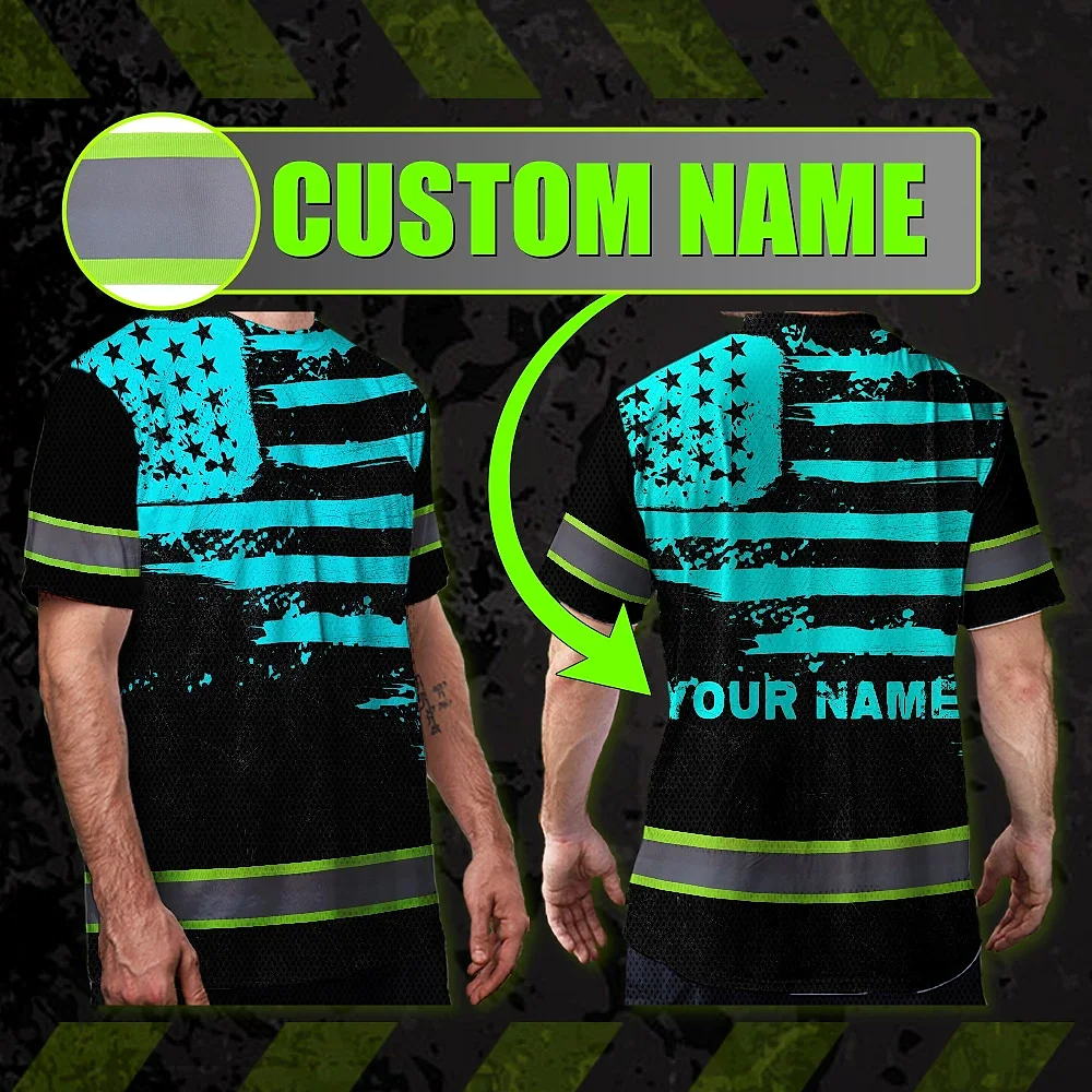 Hi Vis Shirt Reflective Tapes Blue Neon US Flag Custom Name Safety Workwear For Workers, Runners, Cyclists