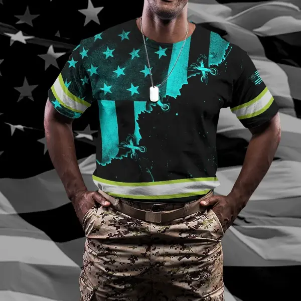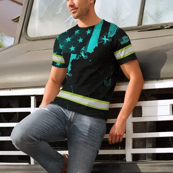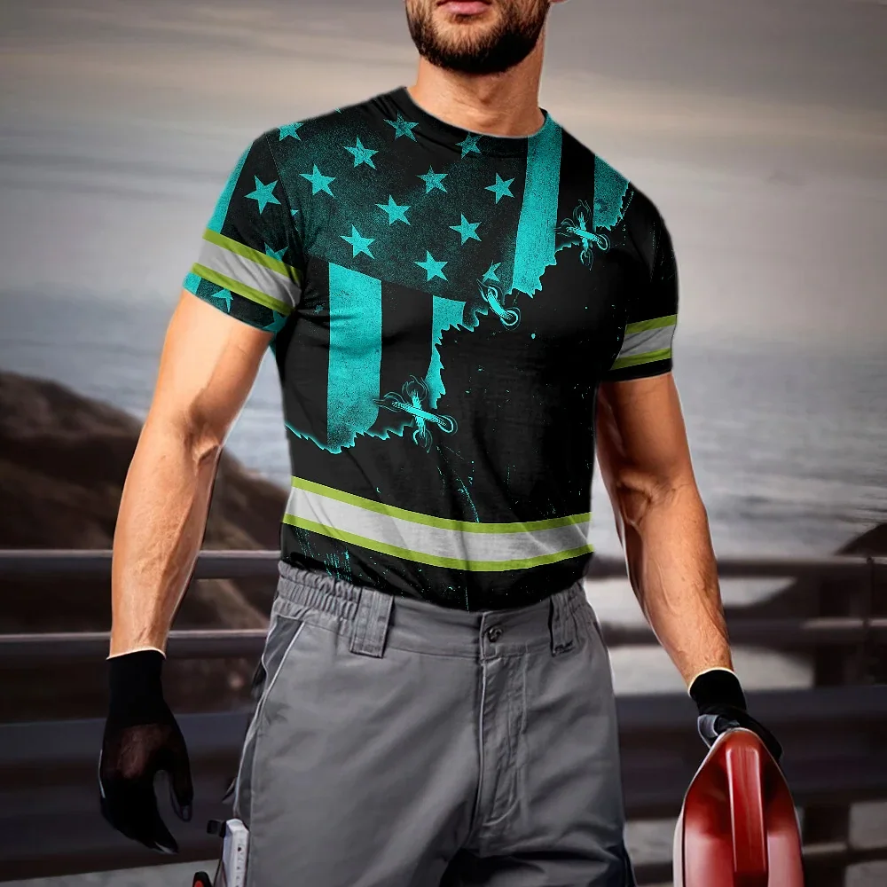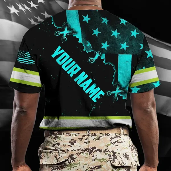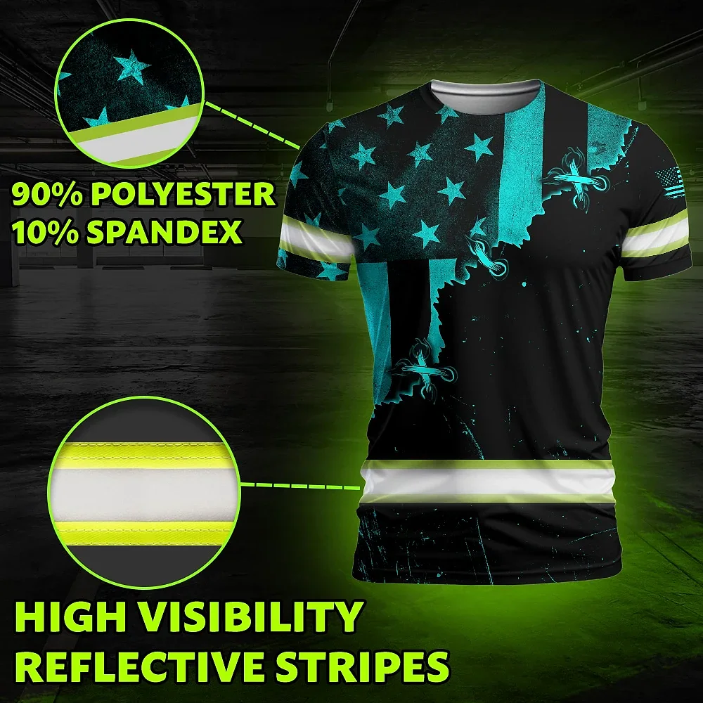 Hi Vis Shirt Reflective Tapes Blue Neon US Flag Sewn Custom Name Safety Workwear For Workers, Runners