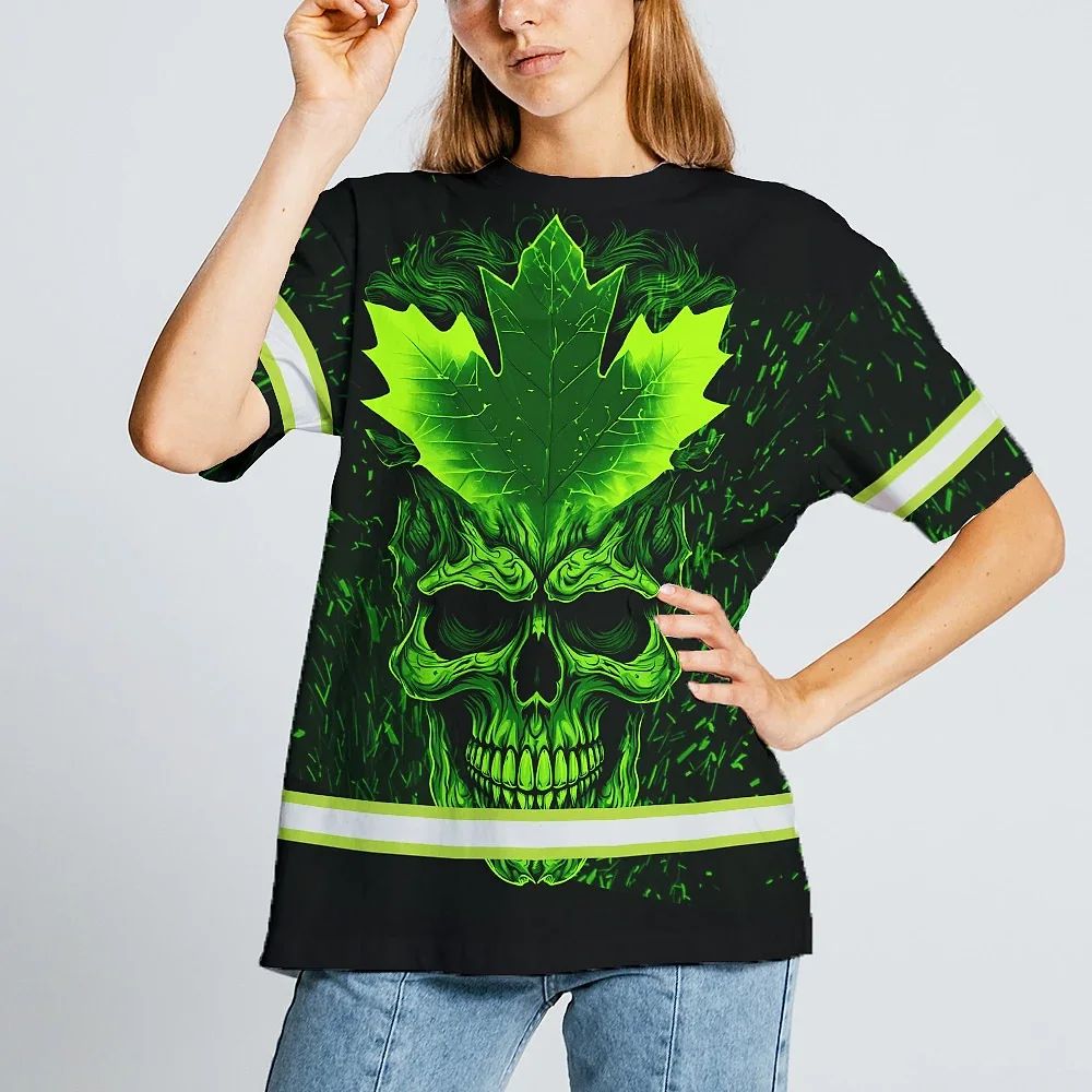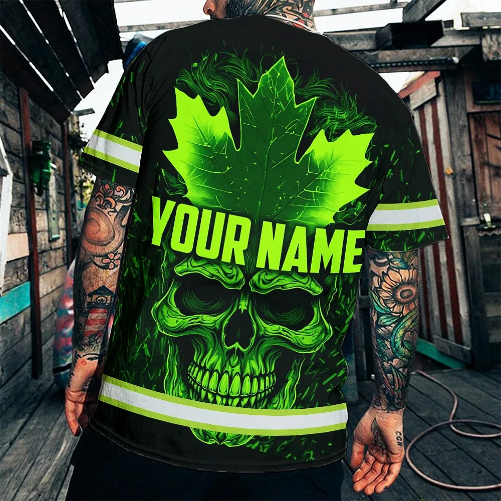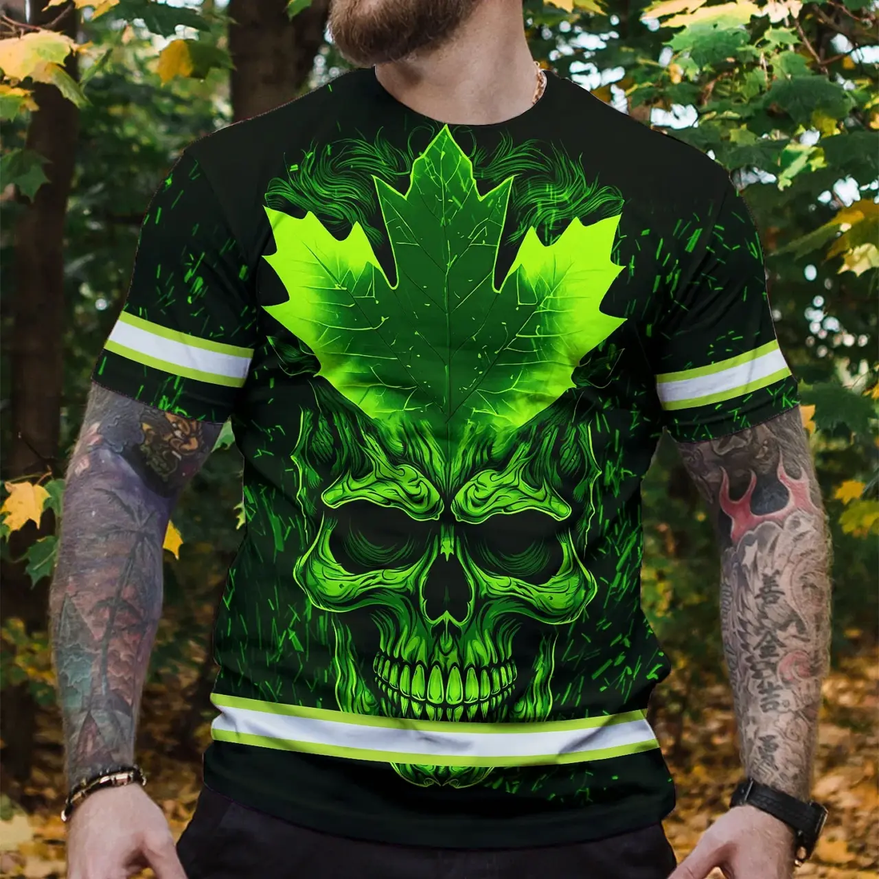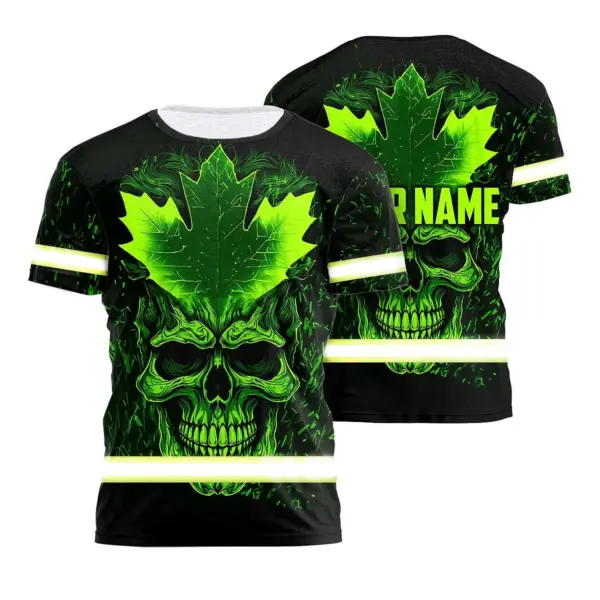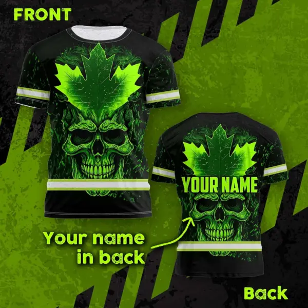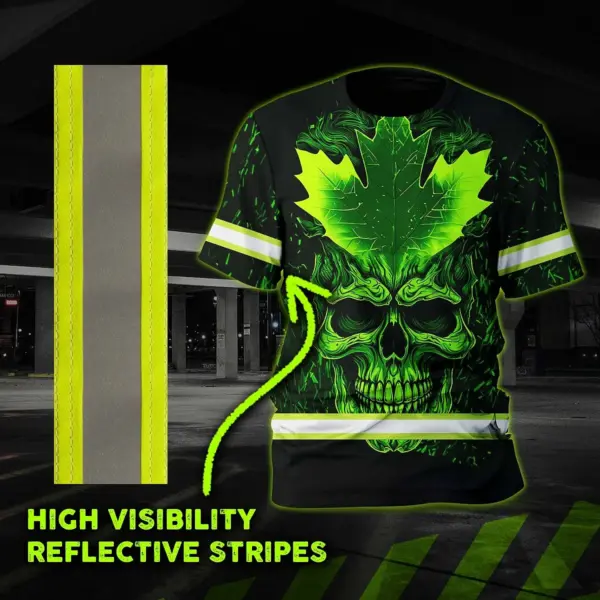 Hi Vis Shirt Reflective Tapes Green Black And Canada Flag Skull Custom Name Safety Workwear For Worker, Operator, Patriotic
