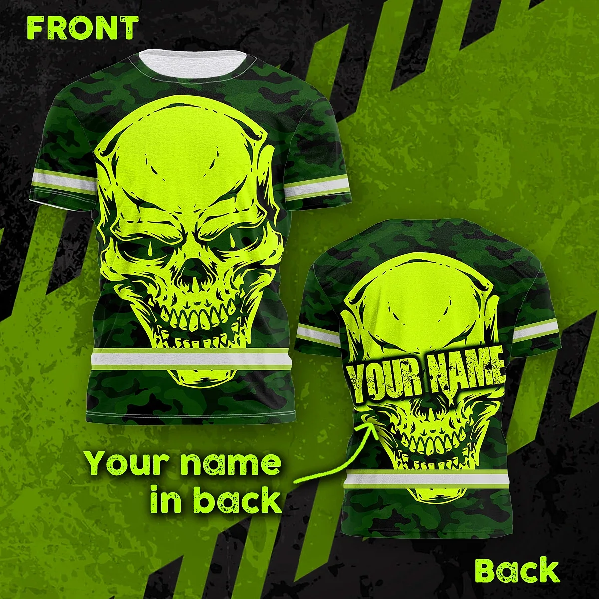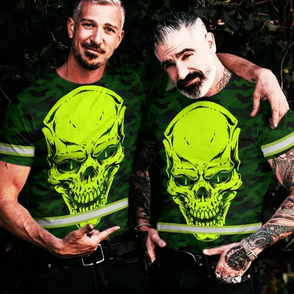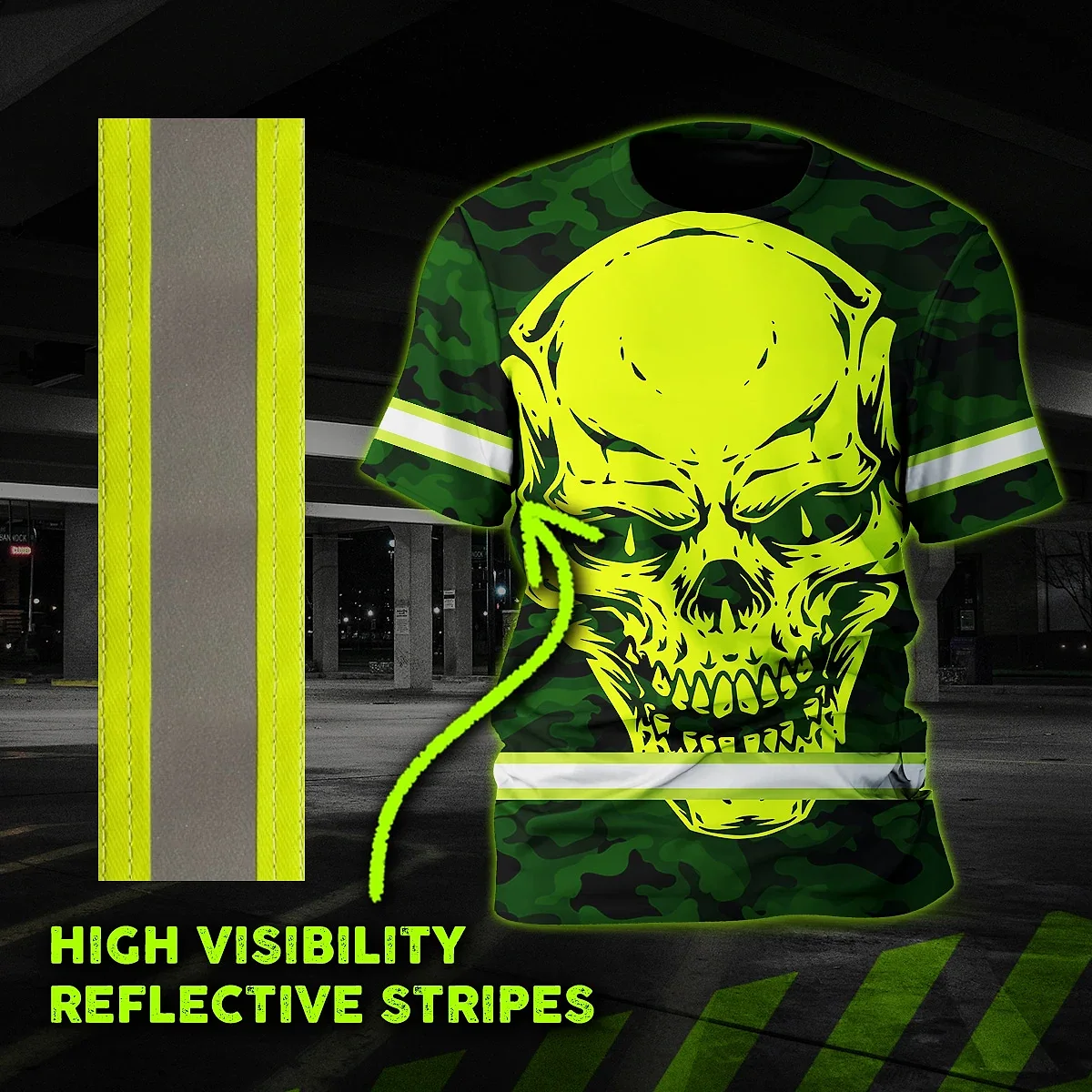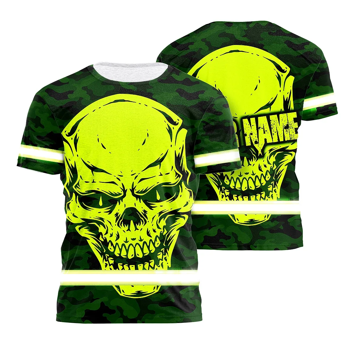 Hi Vis Shirt Reflective Tapes Green Neon Camo Skull Custom Name Safety Workwear For Workers, Runners, Skull Lover