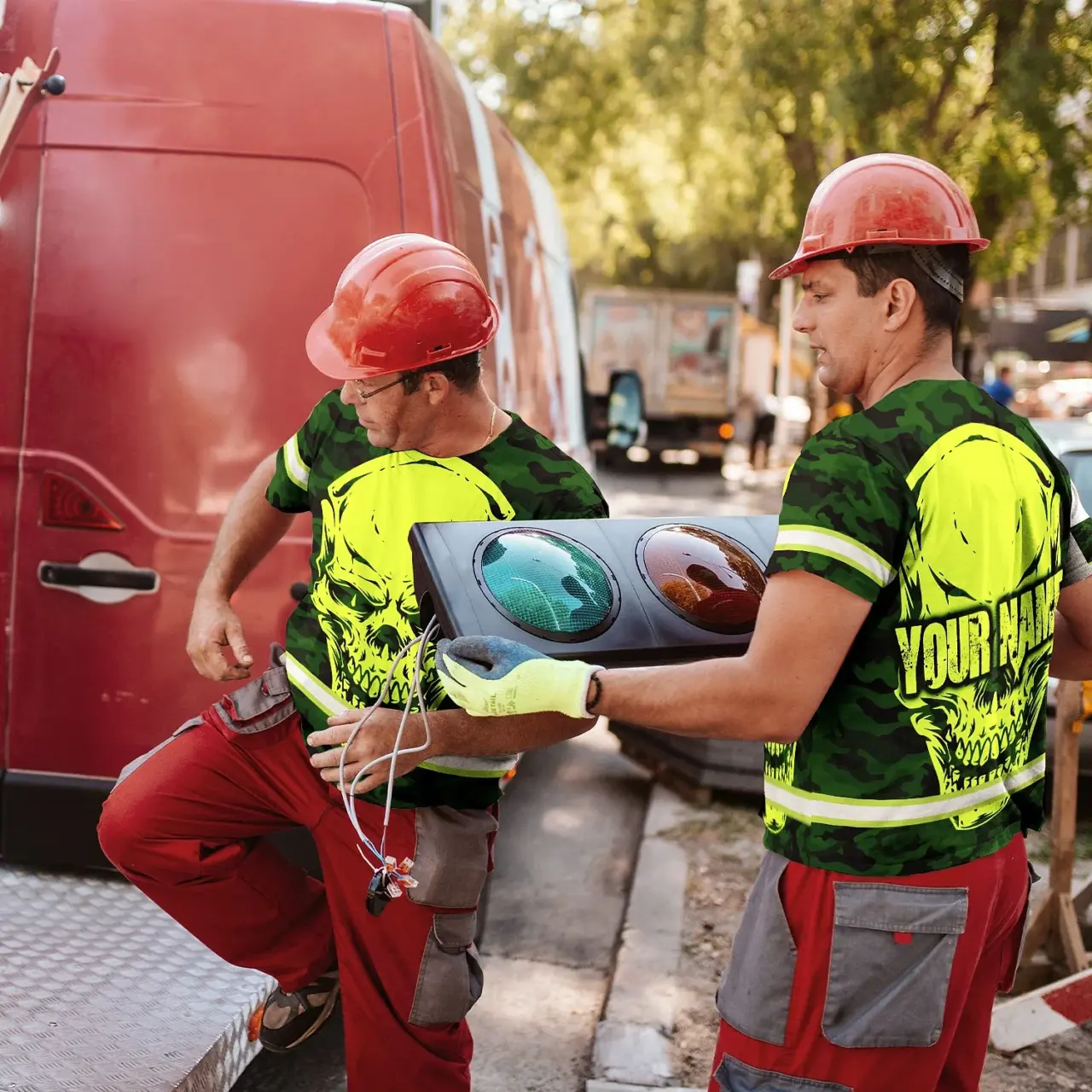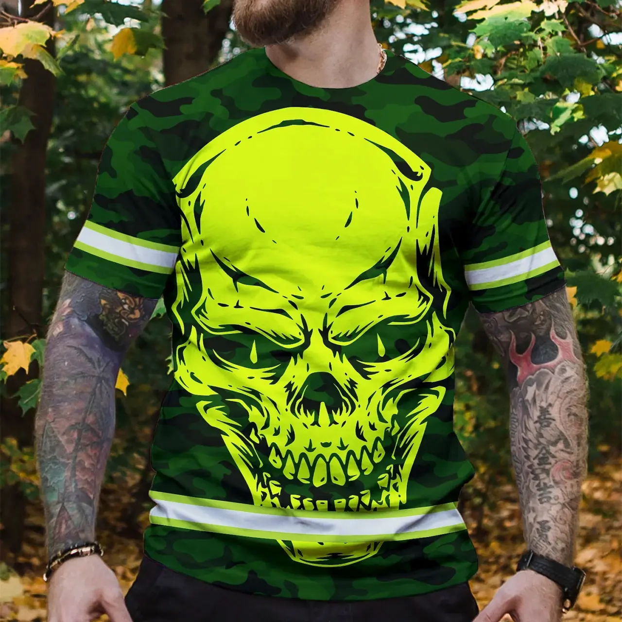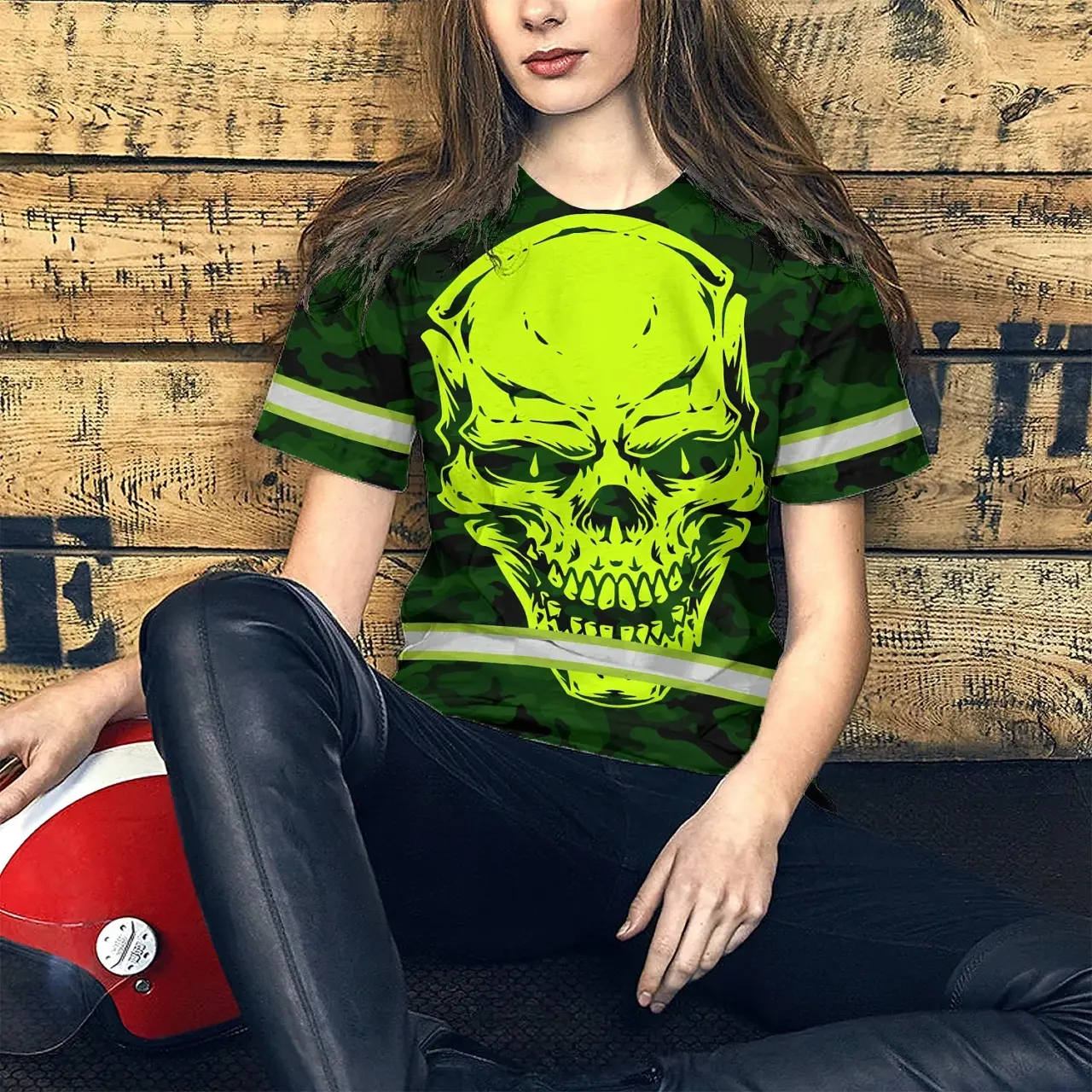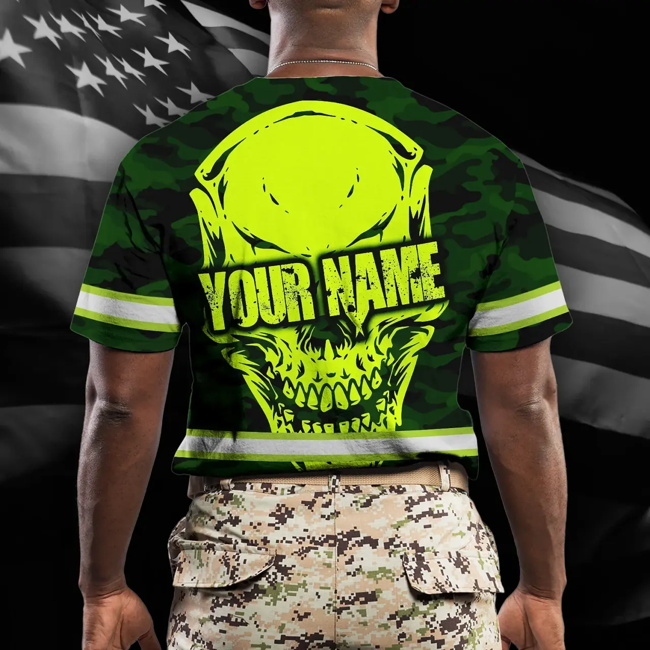 Hi Vis Shirt Reflective Tapes Green Neon Camo Skull Custom Name Safety Workwear For Workers, Runners, Skull Lover
