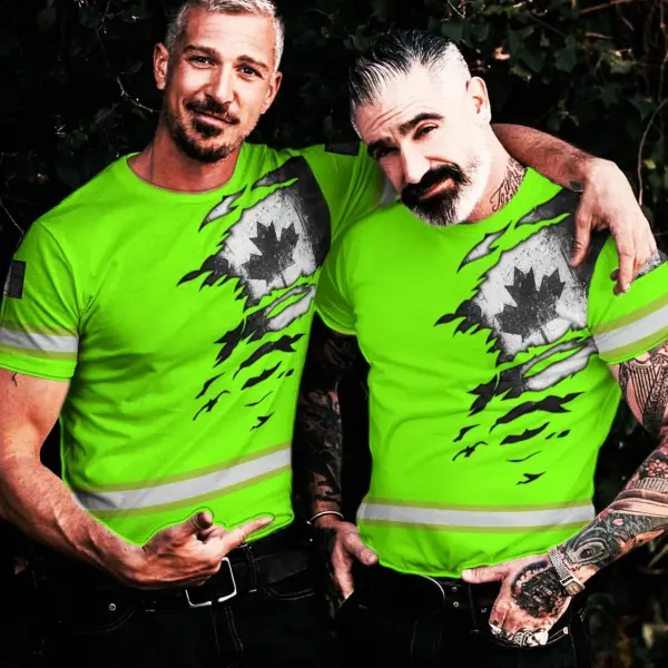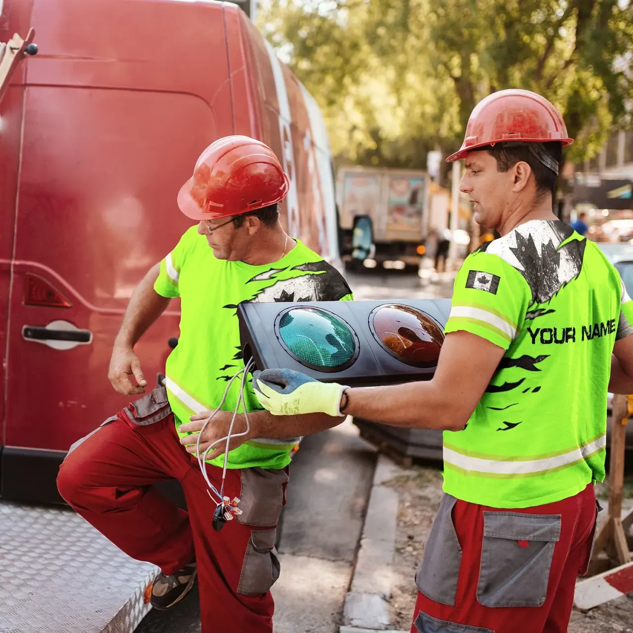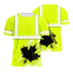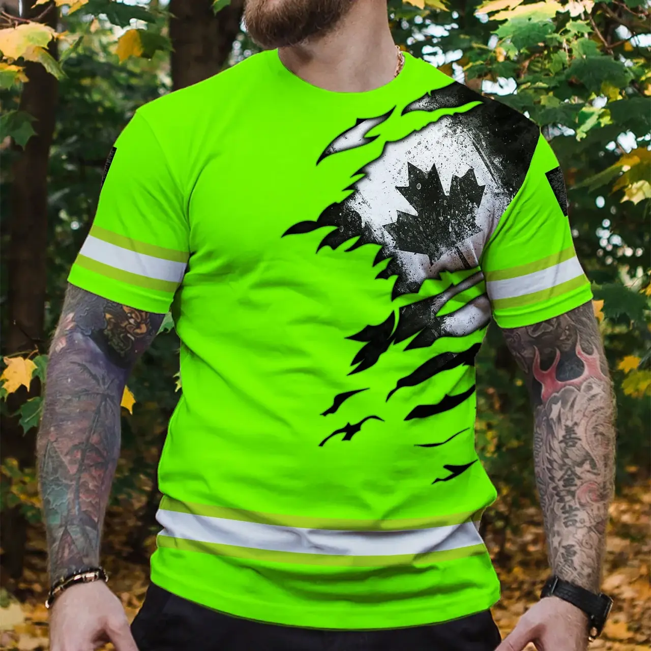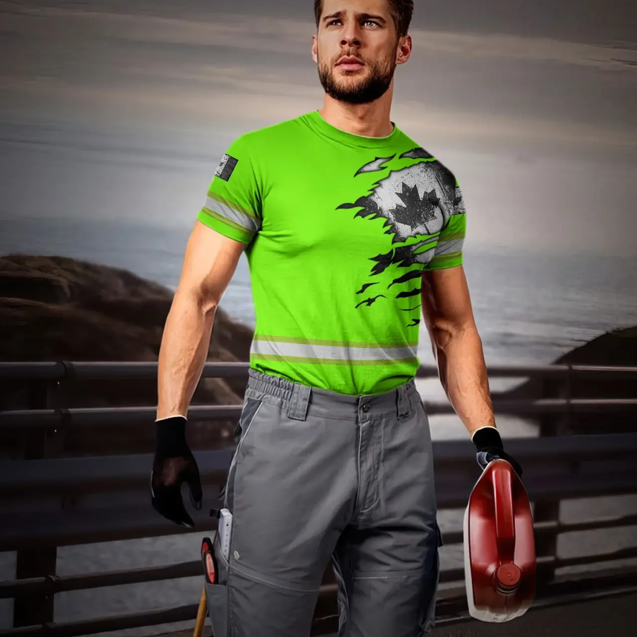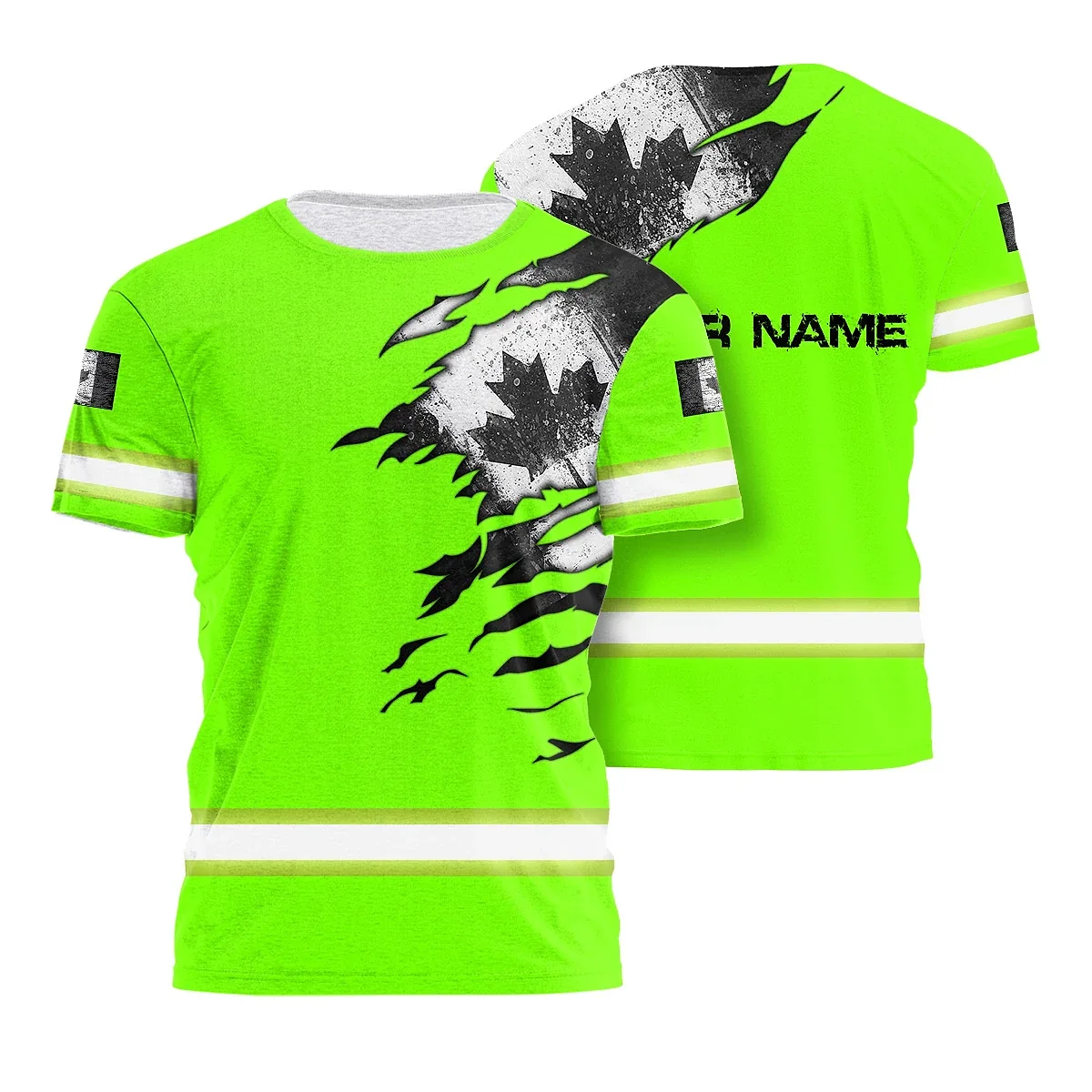 Hi Vis Shirt Reflective Tapes Green Neon Scratch Canada Flag Custom Name Safety Workwear For Worker, Operator, Patriotic