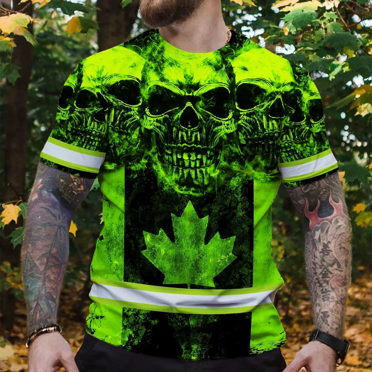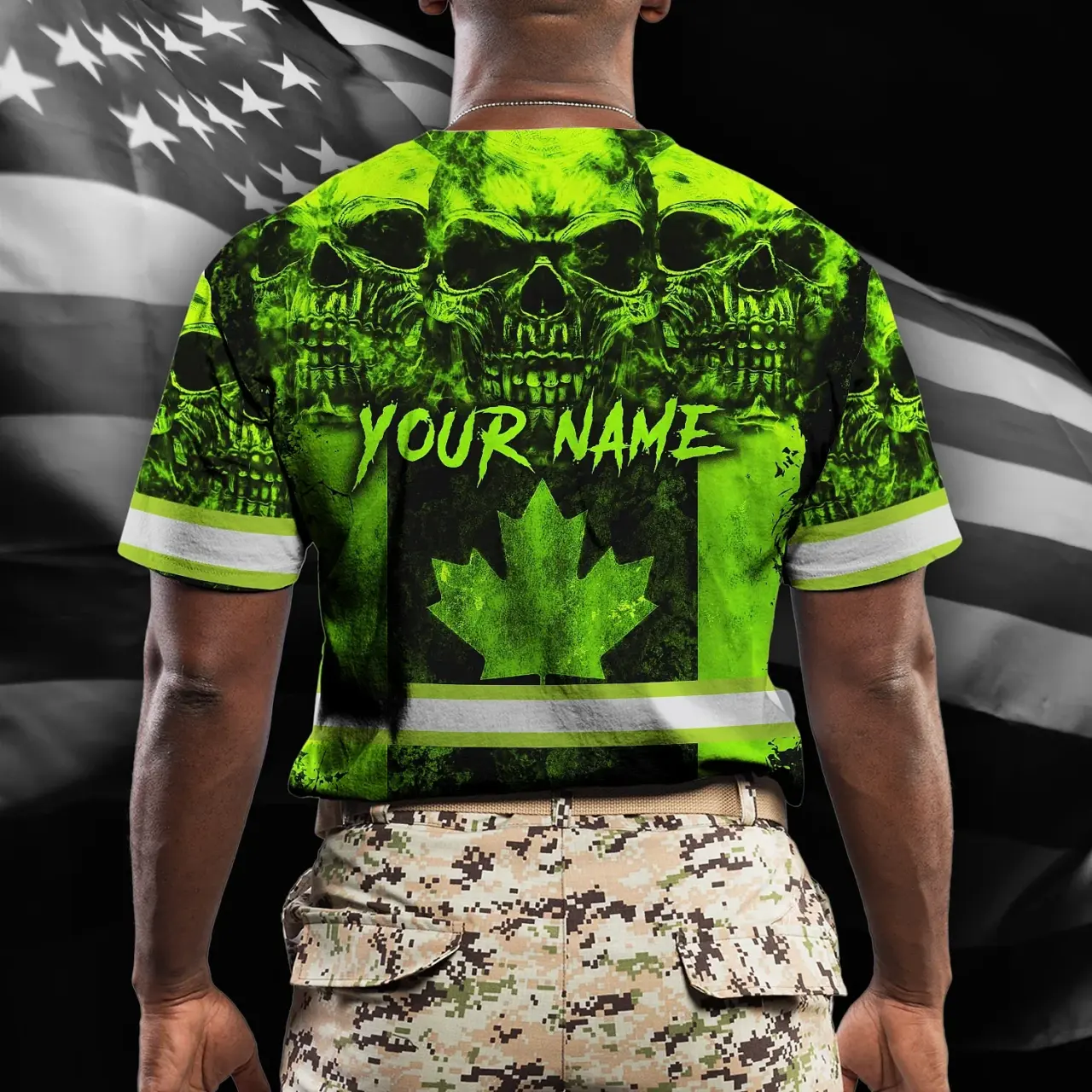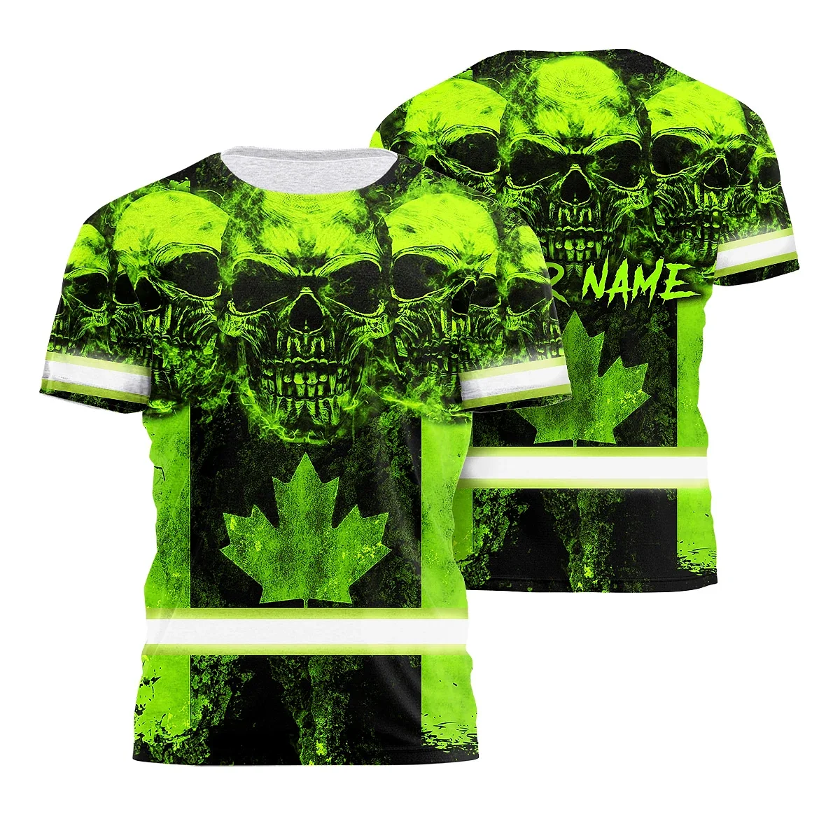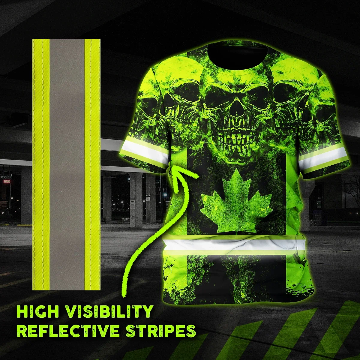 Hi Vis Shirt Reflective Tapes Green Neon Skull Canada Flag Custom Name Safety Workwear For Worker, Operator, Patriotic