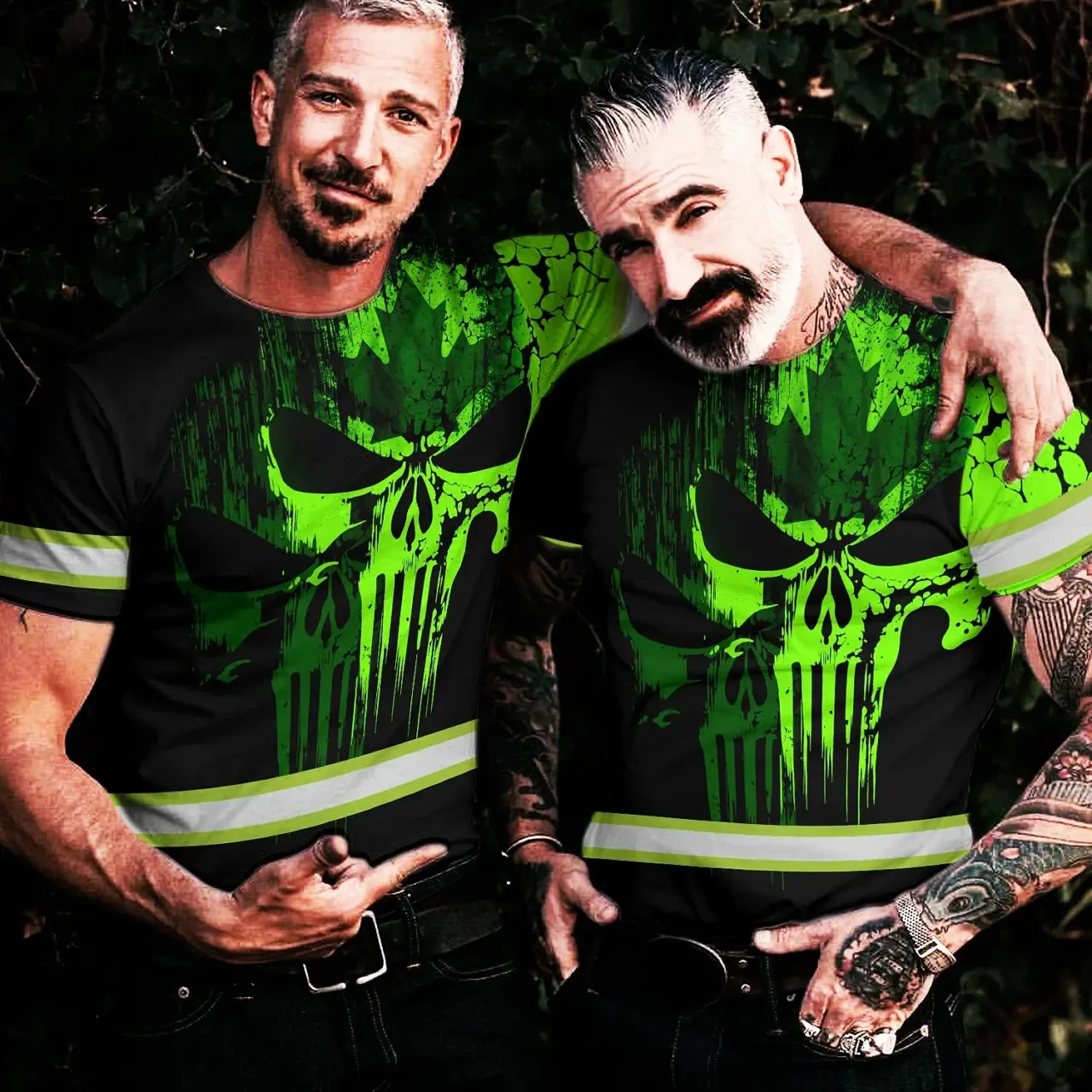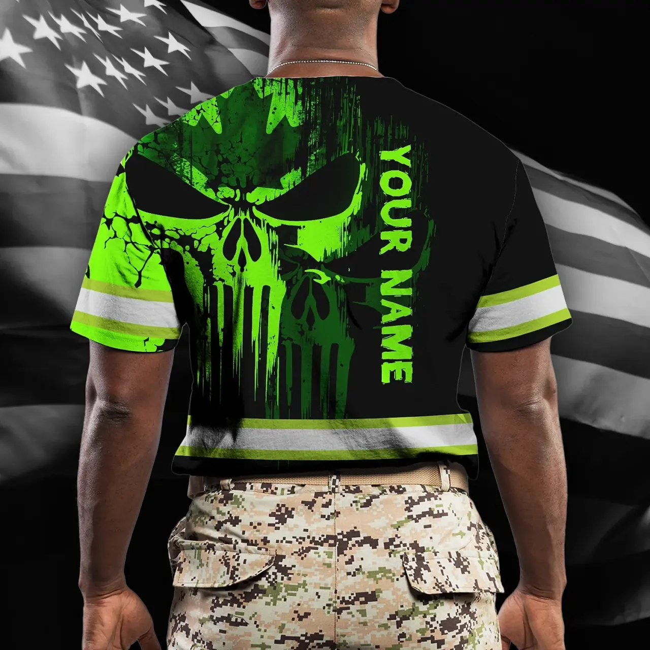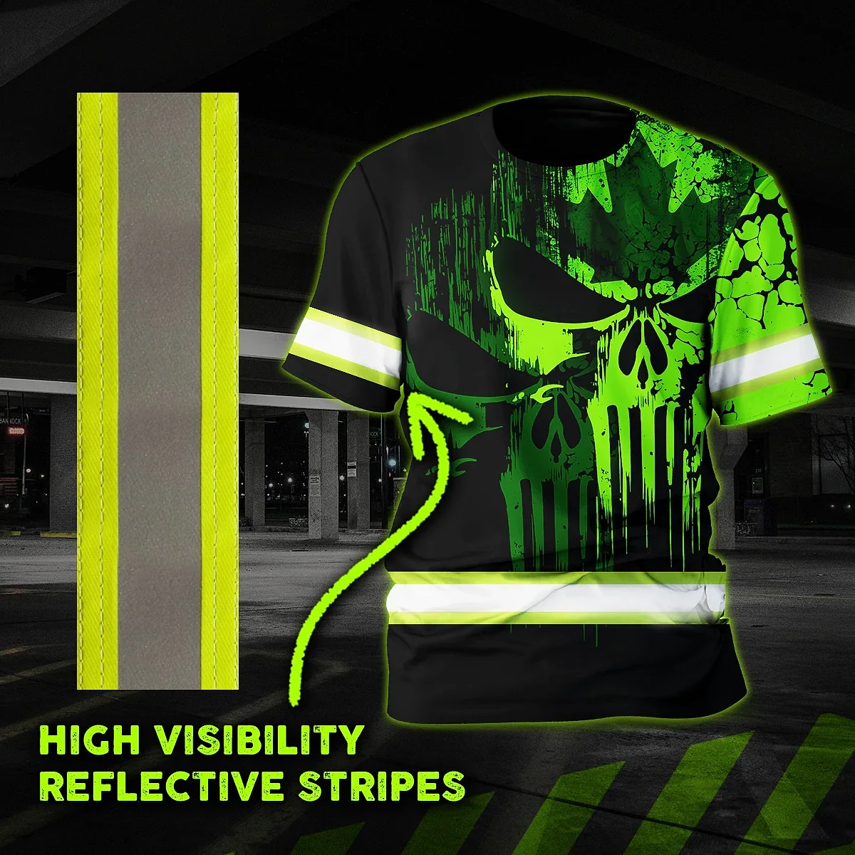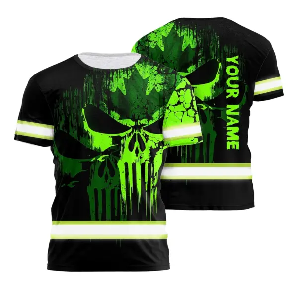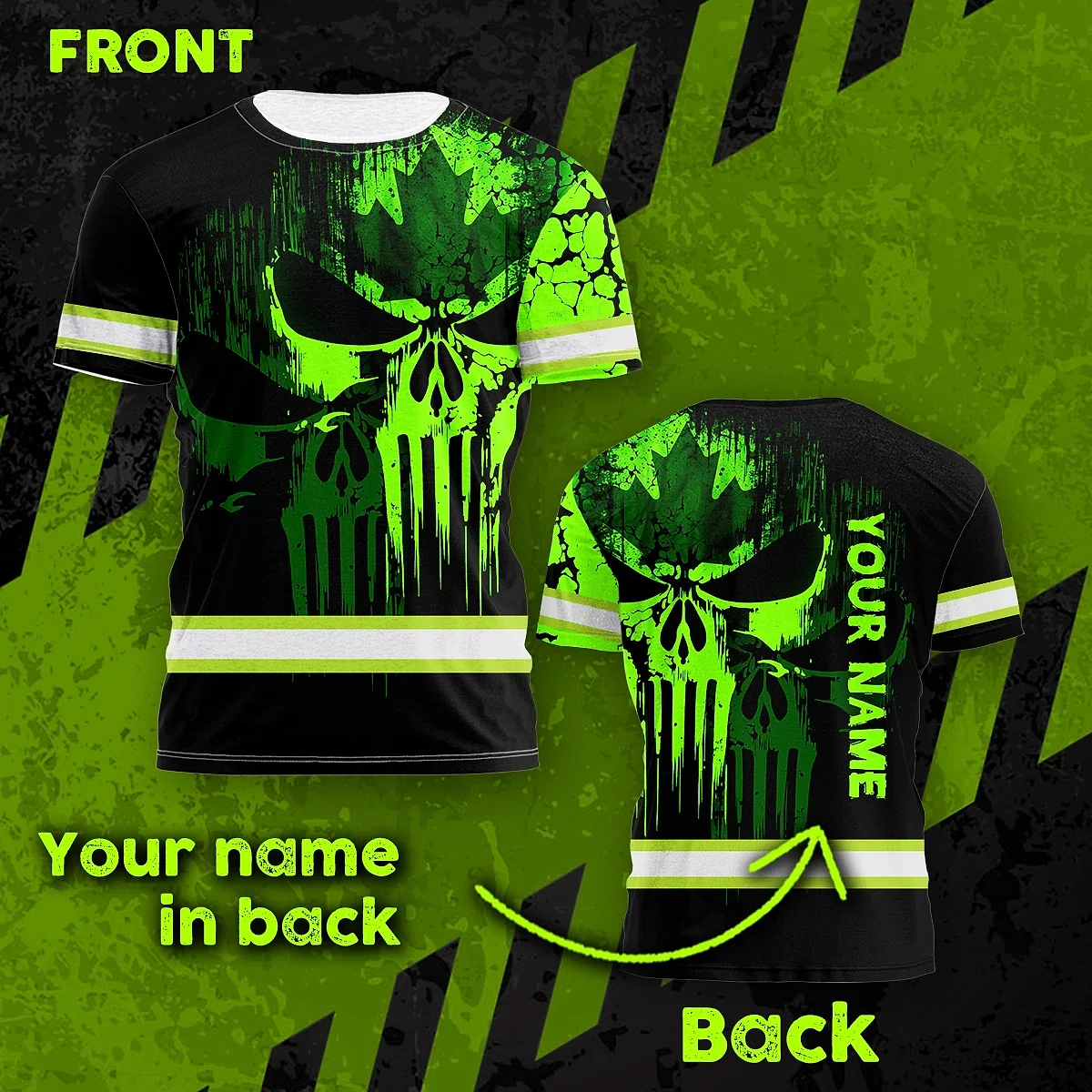 Hi Vis Shirt Reflective Tapes Green Neon Skull Shadow Canada Flag Custom Name Safety Workwear For Worker, Operator, Patriotic