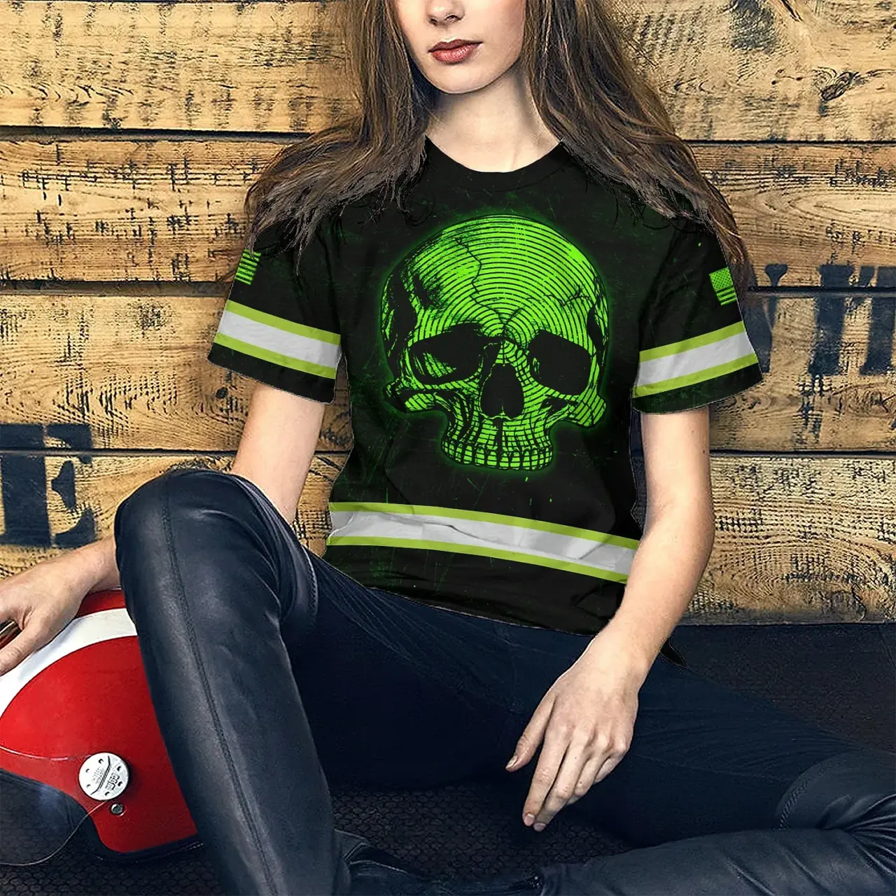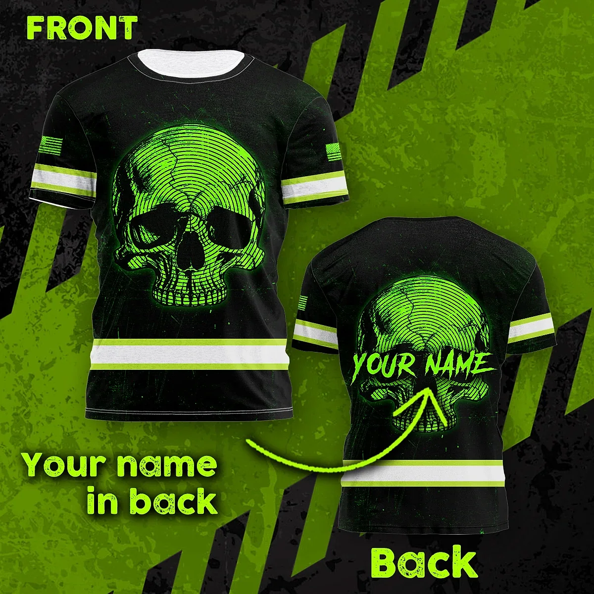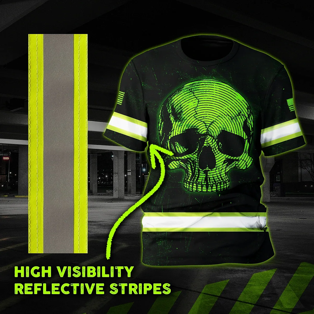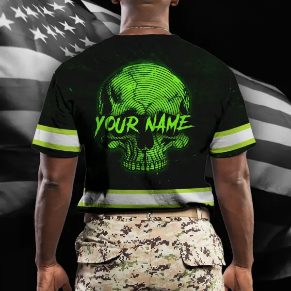 Hi Vis Shirt Reflective Tapes Green Neon Skull US Flag Custom Name Safety Workwear For Workers, Runners, Skull Lover