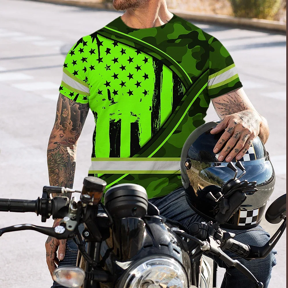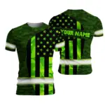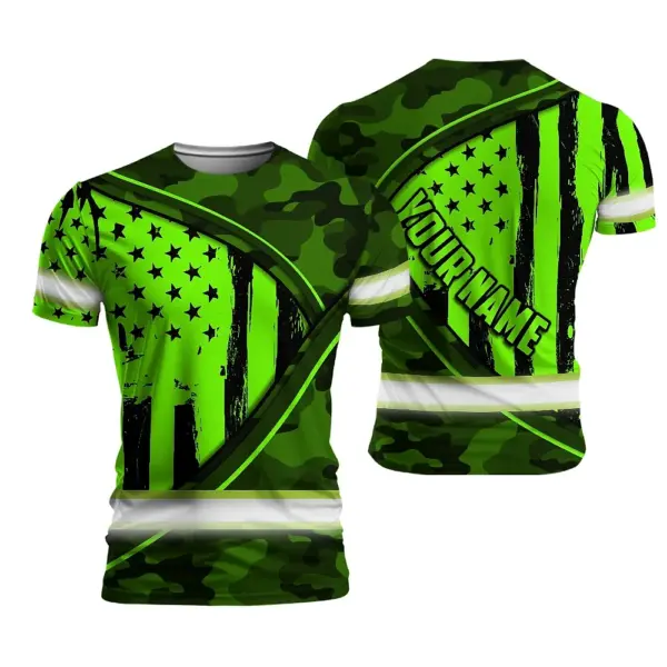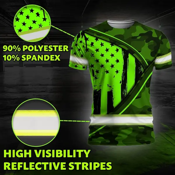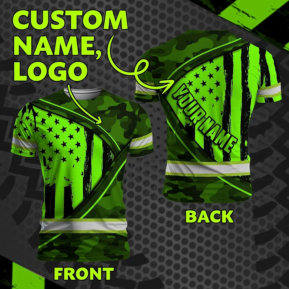 Hi Vis Shirt Reflective Tapes Green Neon US Flag Wave Custom Name Safety Workwear For Workers, Runners
